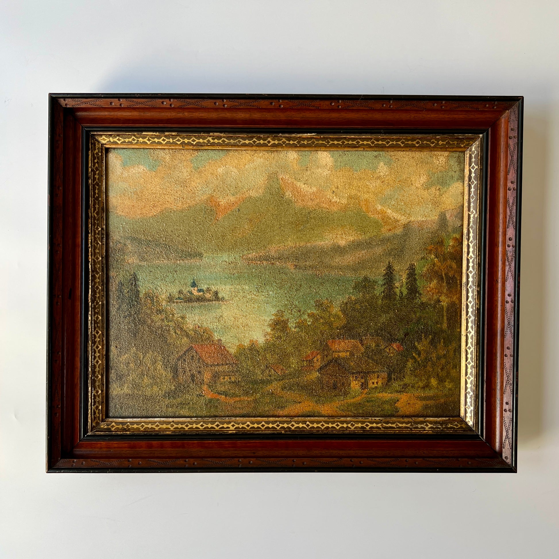 A 19th century European landscape oil on canvas painting in an ornately carved Eastlake Victorian wood and gold lined frame. The painting features a mountain, lake and village scene. The frame is outstanding. Artwork in frame measures 16.75" x 21". The painting has discolored varnish allover - giving it a darkened appearance. The frame is in good condition with age appropriate wear.