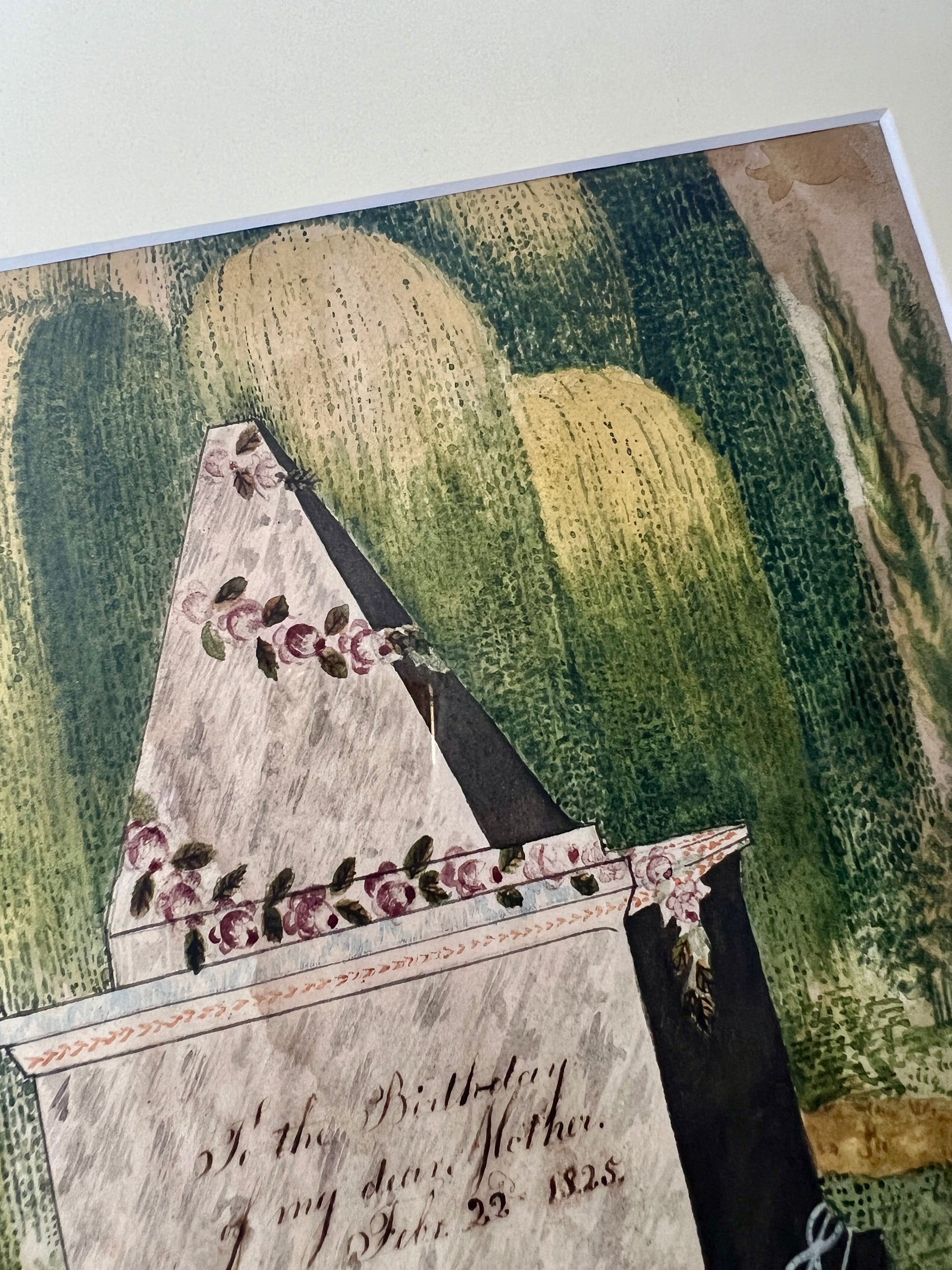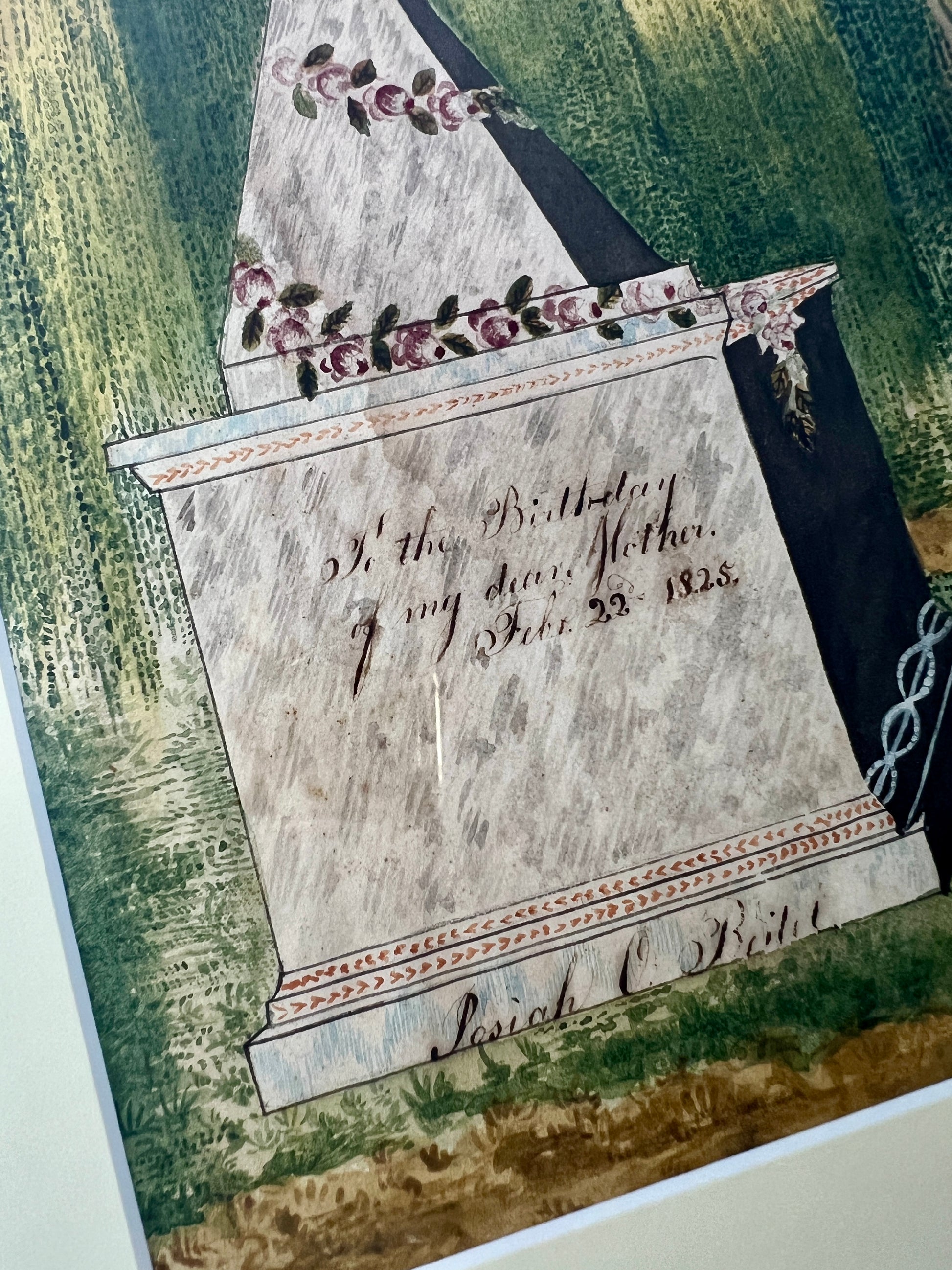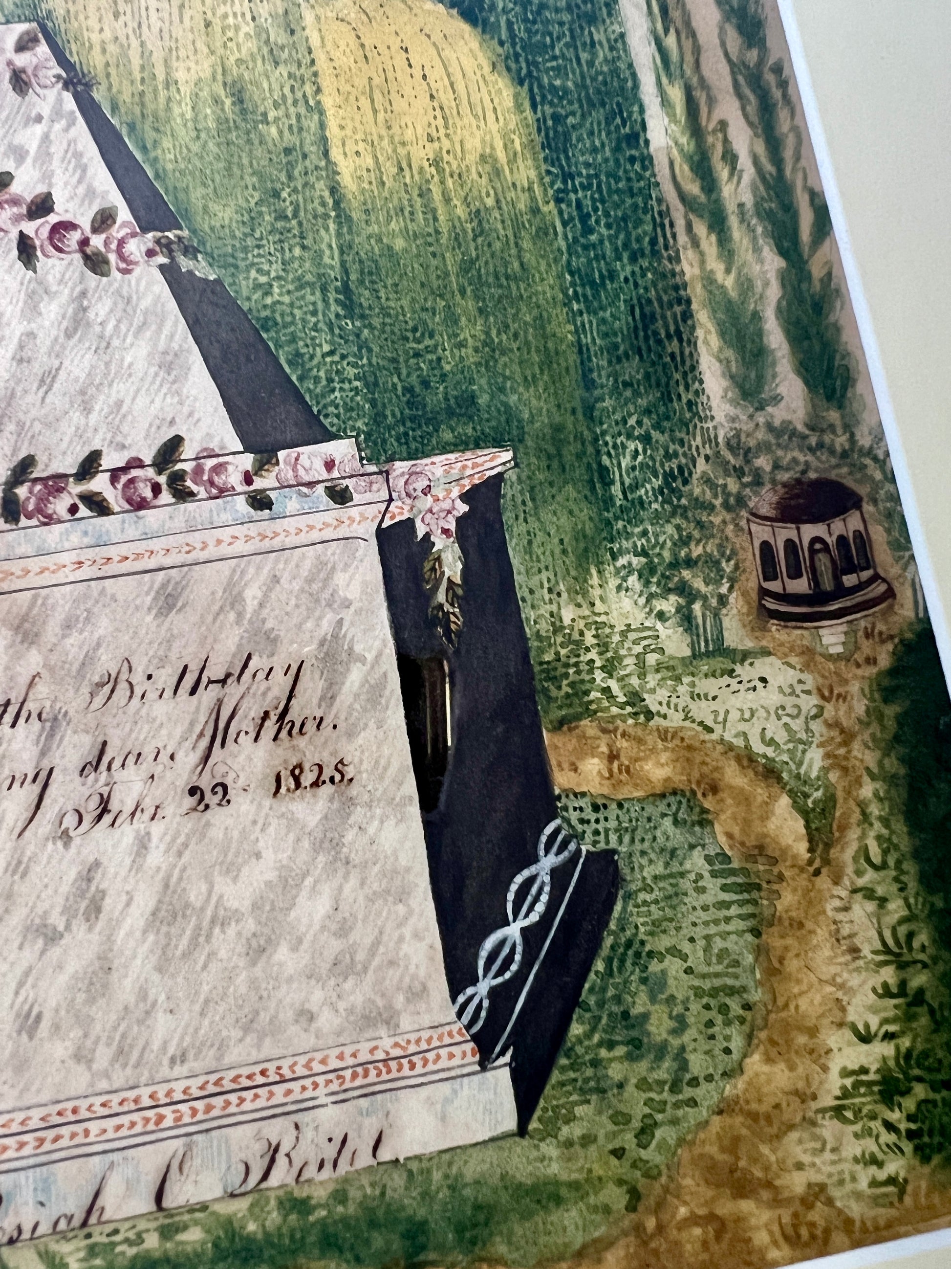 19th century memorial watercolor painting. The memorial reads "For(?) the birthday of my dear Mother / February 22, 1825." The bottom of the monument is signed "Josiah C. Beitel. Weeping willows and a park-like scene fill background. Records included on the back indicate that this work is from Nazareth, Pennsylvania, and it was exhibited in the Lancaster (PA) Museum Show.Artwork in frame measures 17.5" x 13.25". Artwork is in good, antique condition - the colors are vibrant. Frame is new.