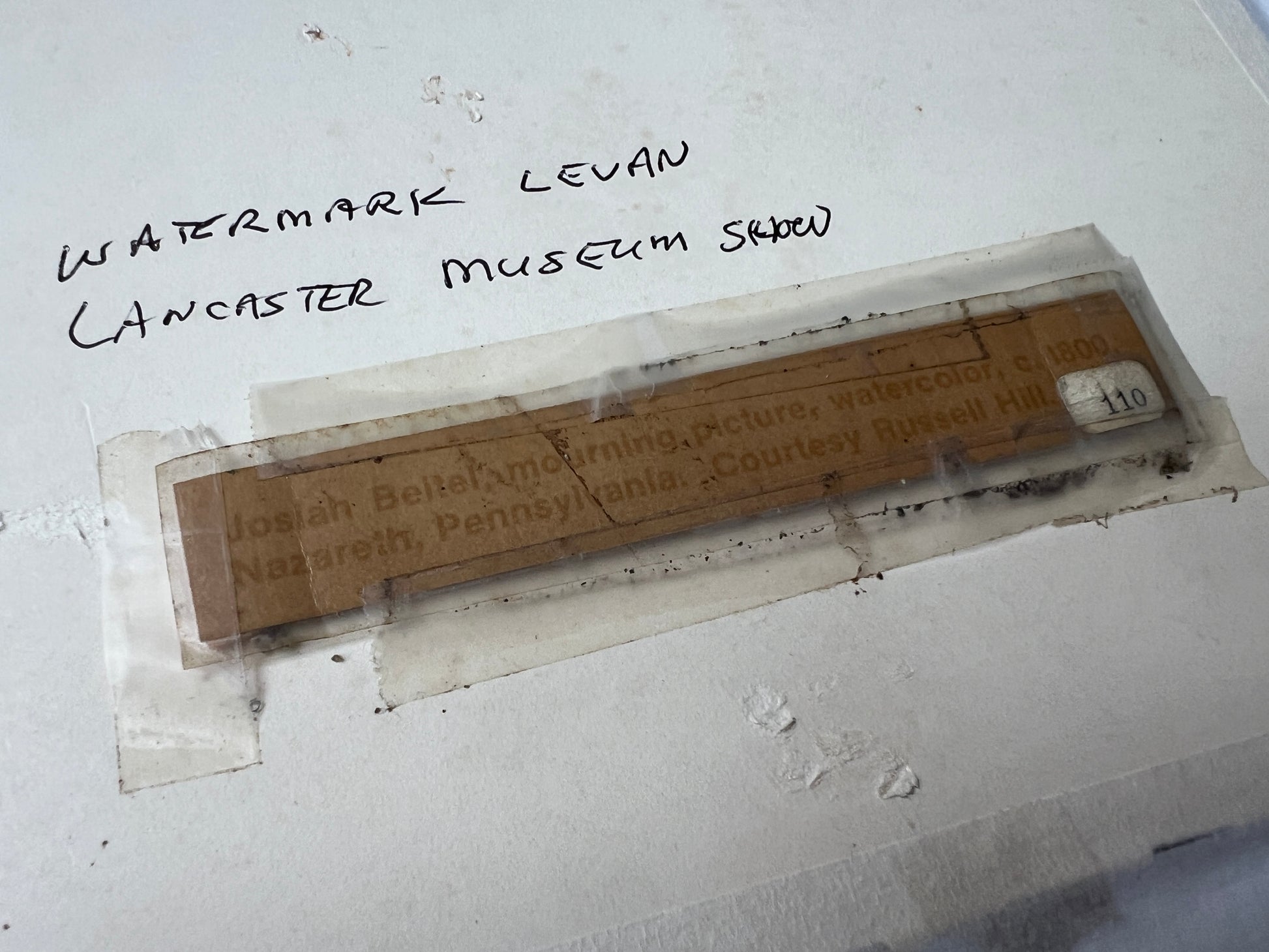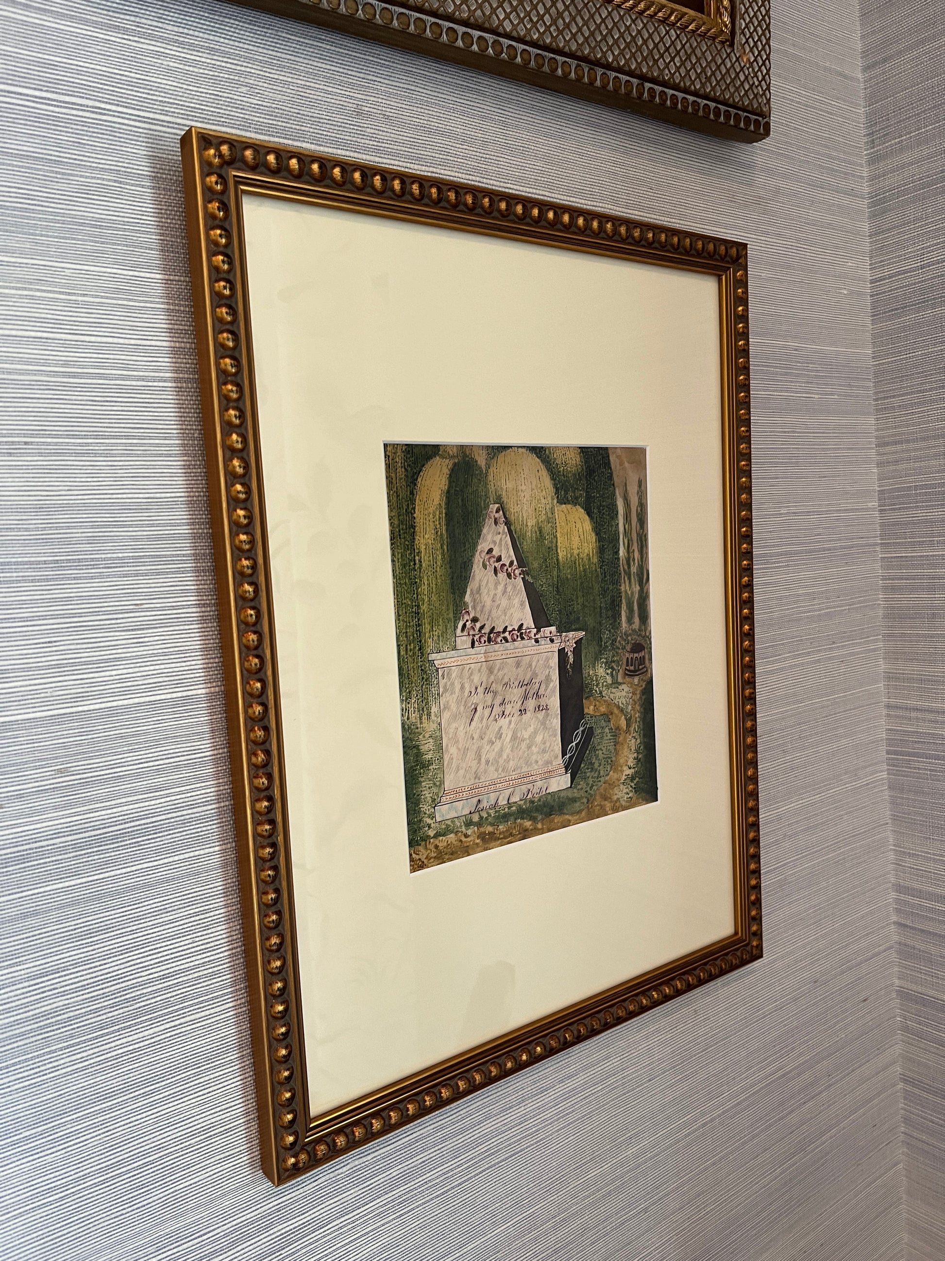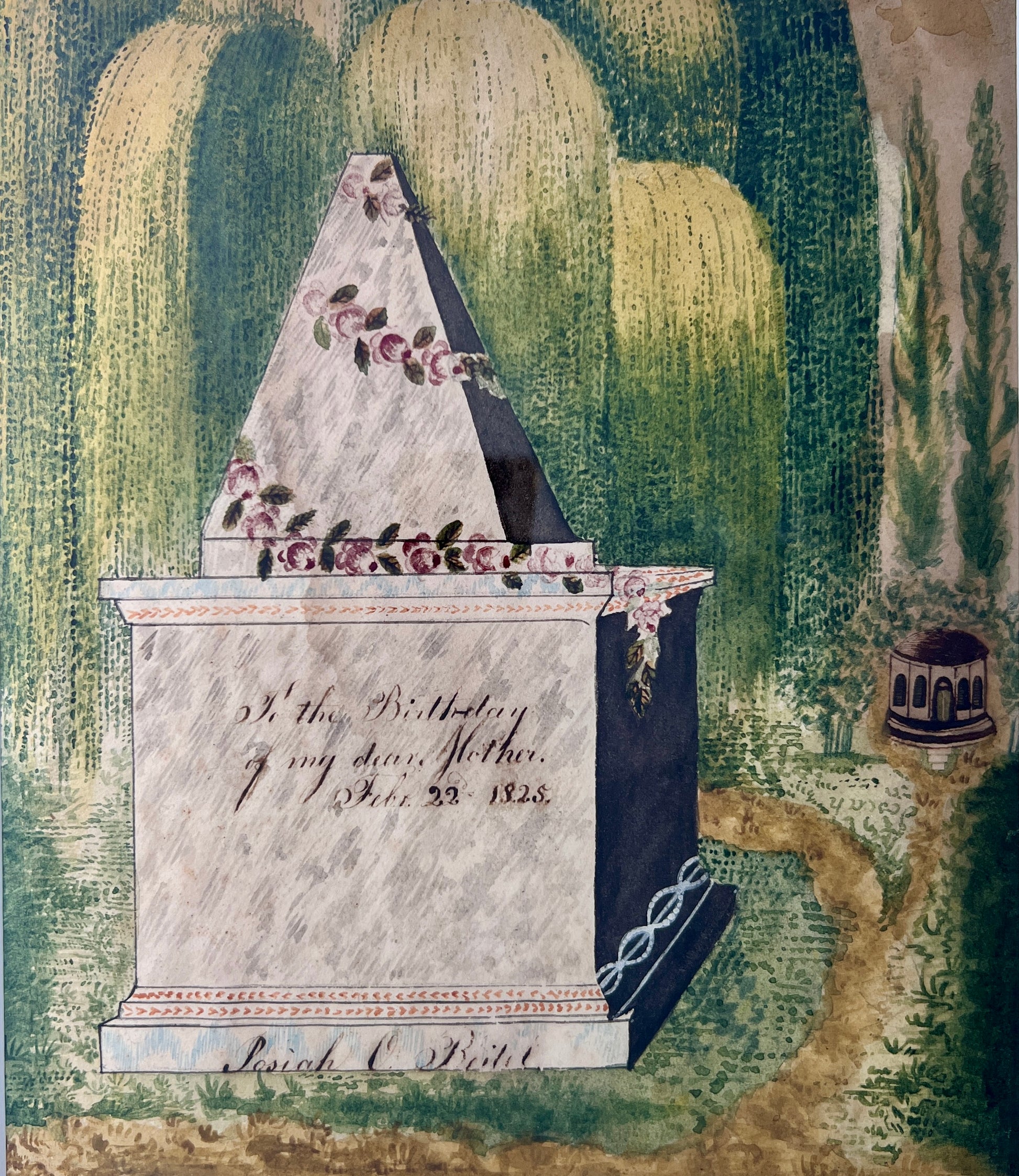 19th century memorial watercolor painting. The memorial reads "For(?) the birthday of my dear Mother / February 22, 1825." The bottom of the monument is signed "Josiah C. Beitel. Weeping willows and a park-like scene fill background. Records included on the back indicate that this work is from Nazareth, Pennsylvania, and it was exhibited in the Lancaster (PA) Museum Show.Artwork in frame measures 17.5" x 13.25". Artwork is in good, antique condition - the colors are vibrant. Frame is new.