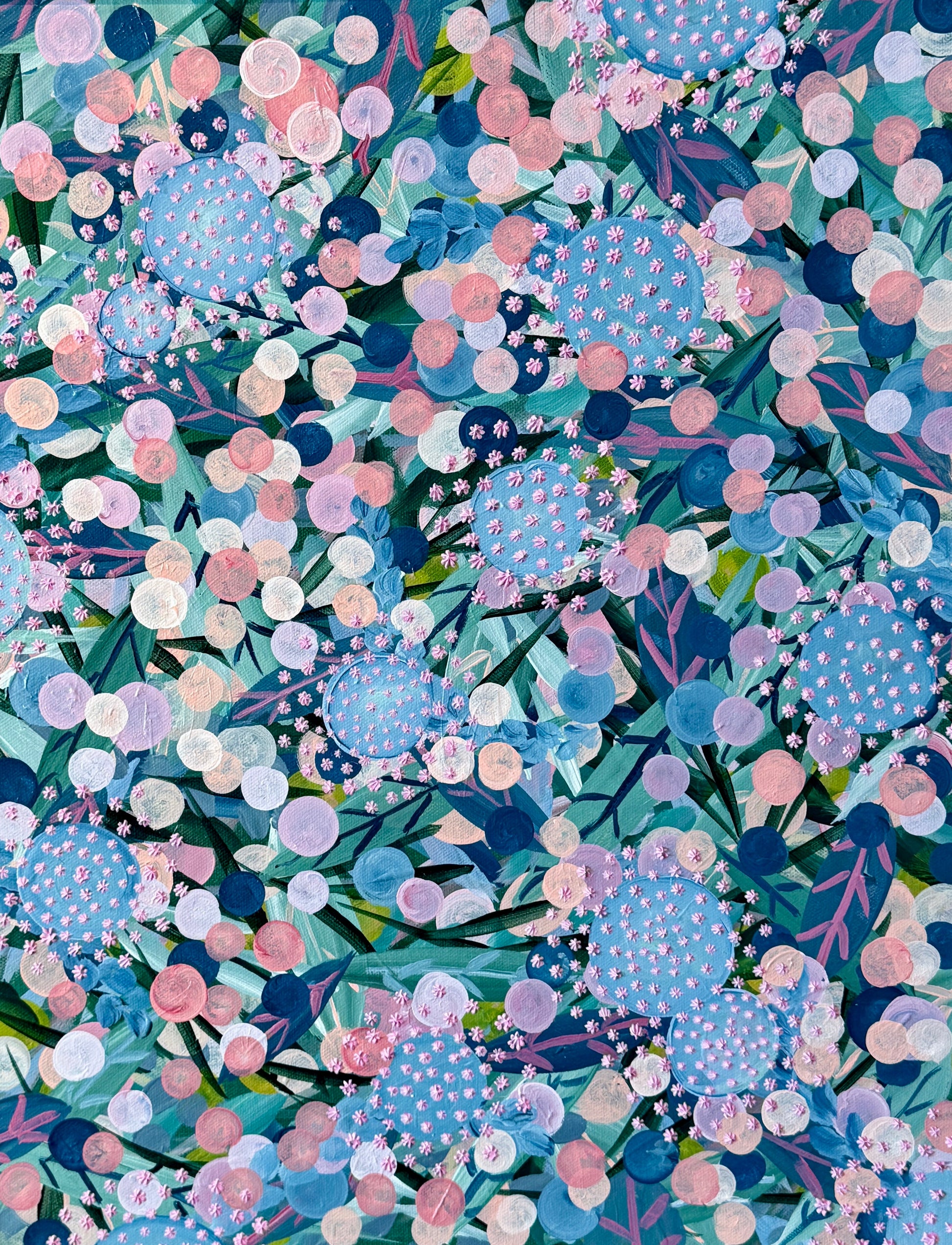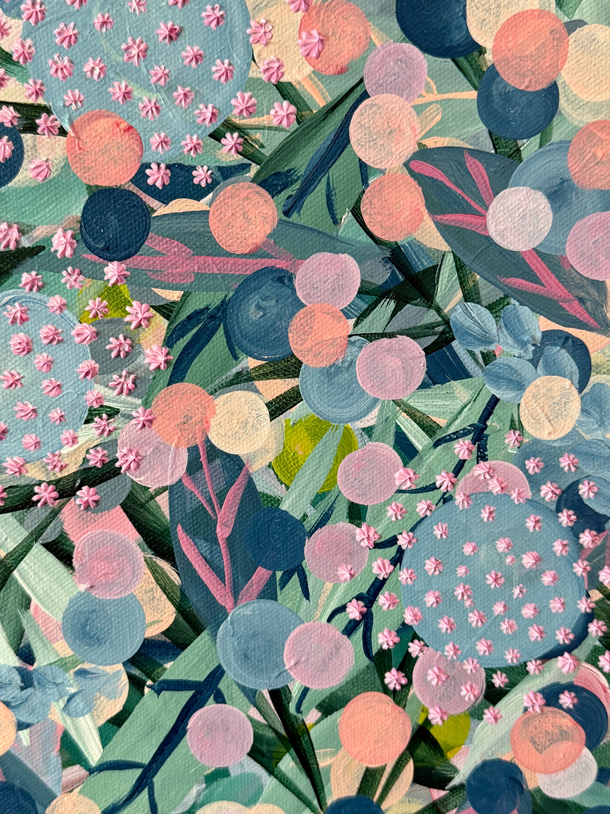 Alison Diamond McElroy acrylic on canvas large scale abstract floral titled Dreaming in Pink II. Countless layers in shades of pink, lavender, blue and green form rhythmic clusters that suggest stylized blossoms or drifting botanical forms. Subtle variations in tone create depth and movement, while repetitive marks give the surface a luminous, textured quality. Both vibrant and serene, the composition evokes the feeling of a field in bloom, balancing energy with softness and harmony. Artwork in gold solid wood frame measures 25.5" x 21.5". This piece is part of a two part series - the coordinating paired artwork is available in a separate listing. If you will be making a local pickup at our Malvern, PA gallery please use code DREAMPINKPICKUP for a pickup discount.