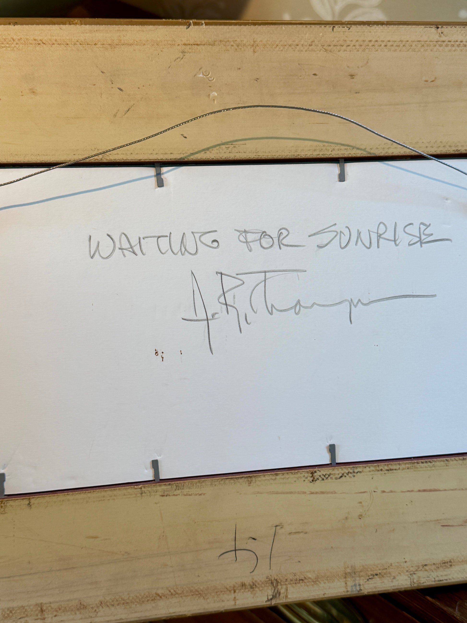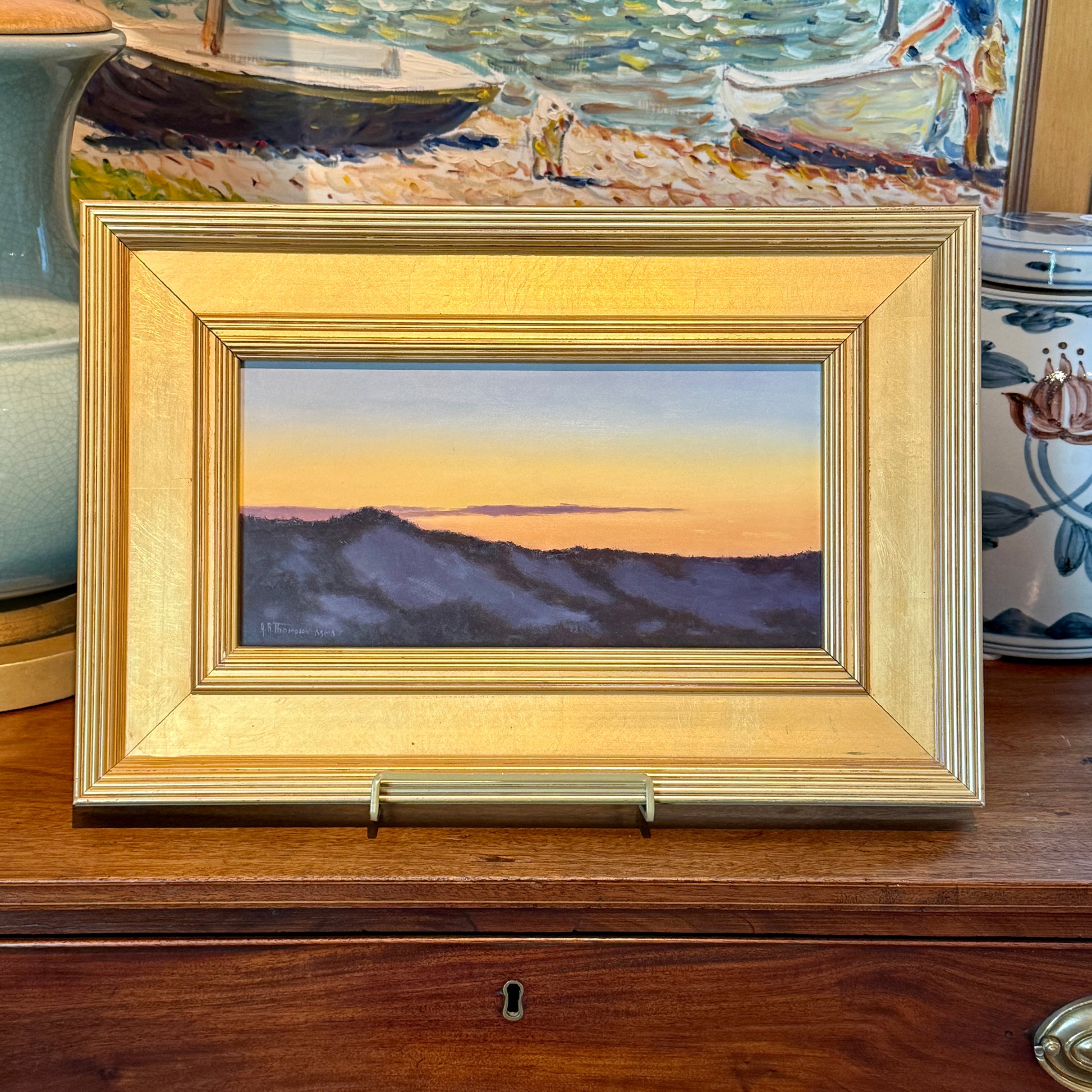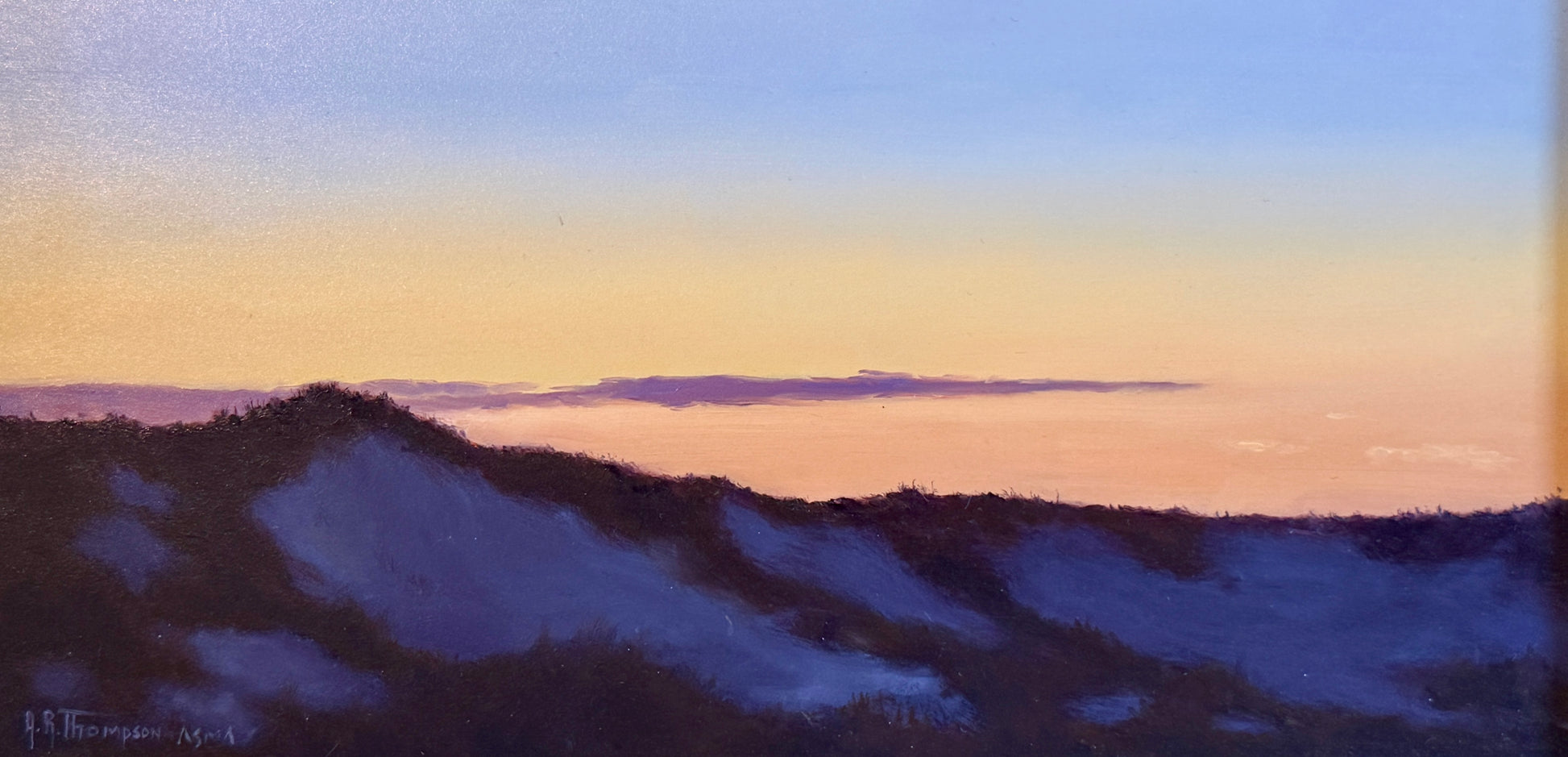 Anthony R. Thompson (American, b. 1944) oil painting on board of a sunrise burning over the dunes. Signed lower left. Inscribed "ASMA" next to signature for the American Society of Marine Artists. Titled Waiting for Sunrise on the reverse. Artwork in gold wood frame measures 12.25" x 18". Artwork and frame in very good condition.