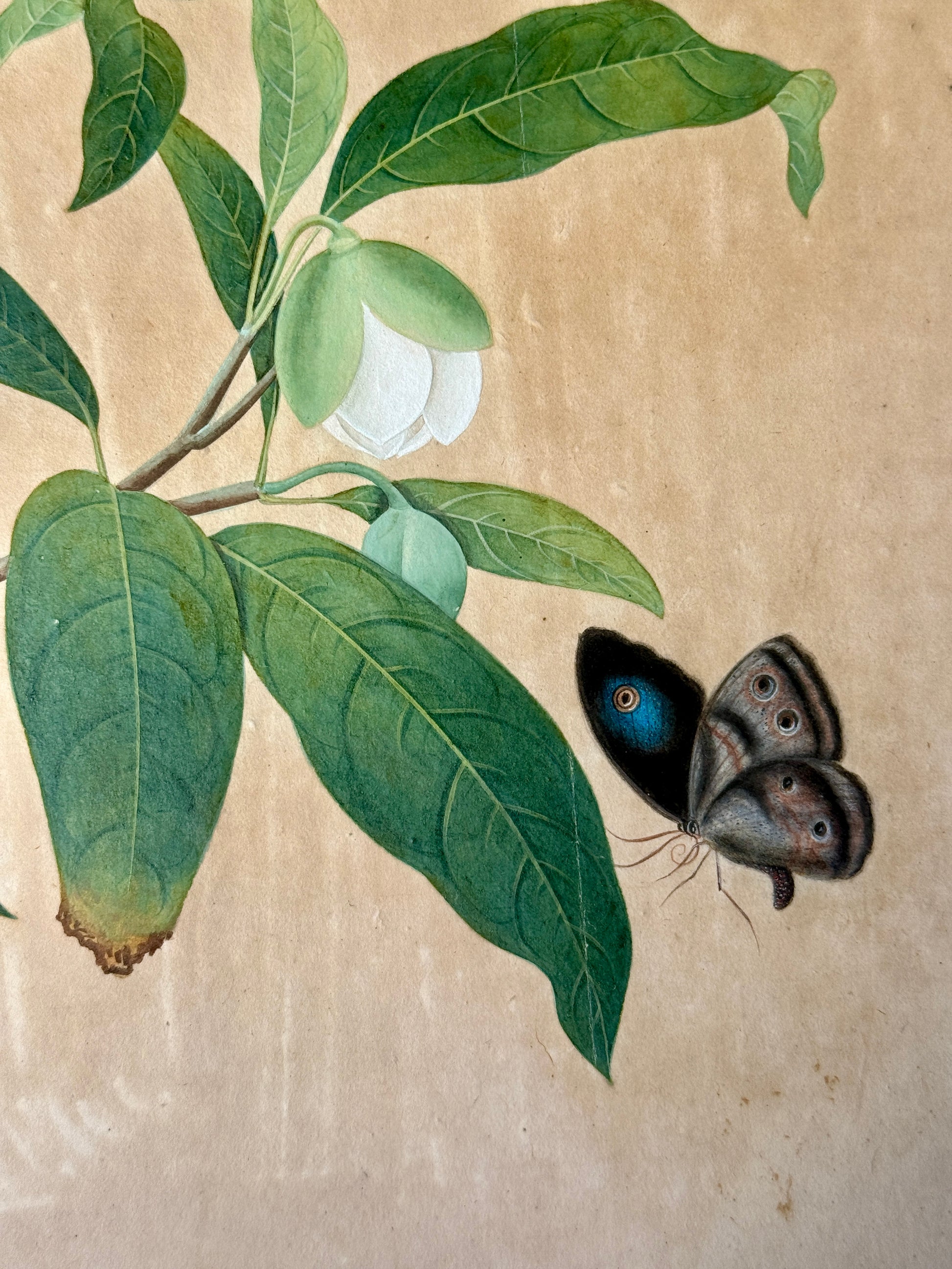 Antique Chinese Watercolor Botanical Painting in Gilded Bamboo Frame