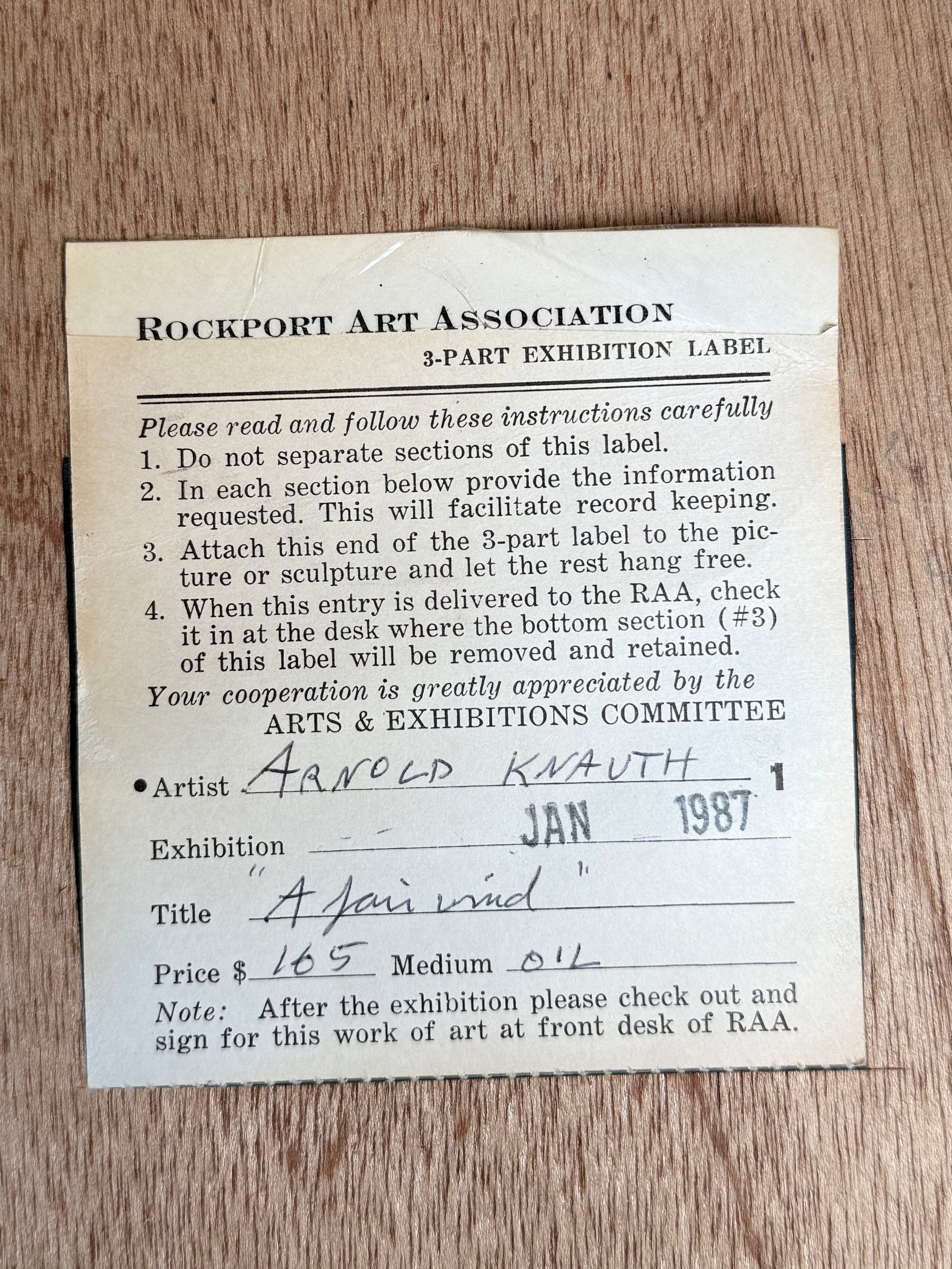 Arnold Whitman Knauth (American / Massachusetts / New York, 1918-2017) oil on panel sailboat portrait. Titled on the reverse A Fair Wind on exhibition label from Rockport Art Association. Artwork in custom black frame with white liner measures 16.75" x 14.75". Artwork and frame in very good condition.