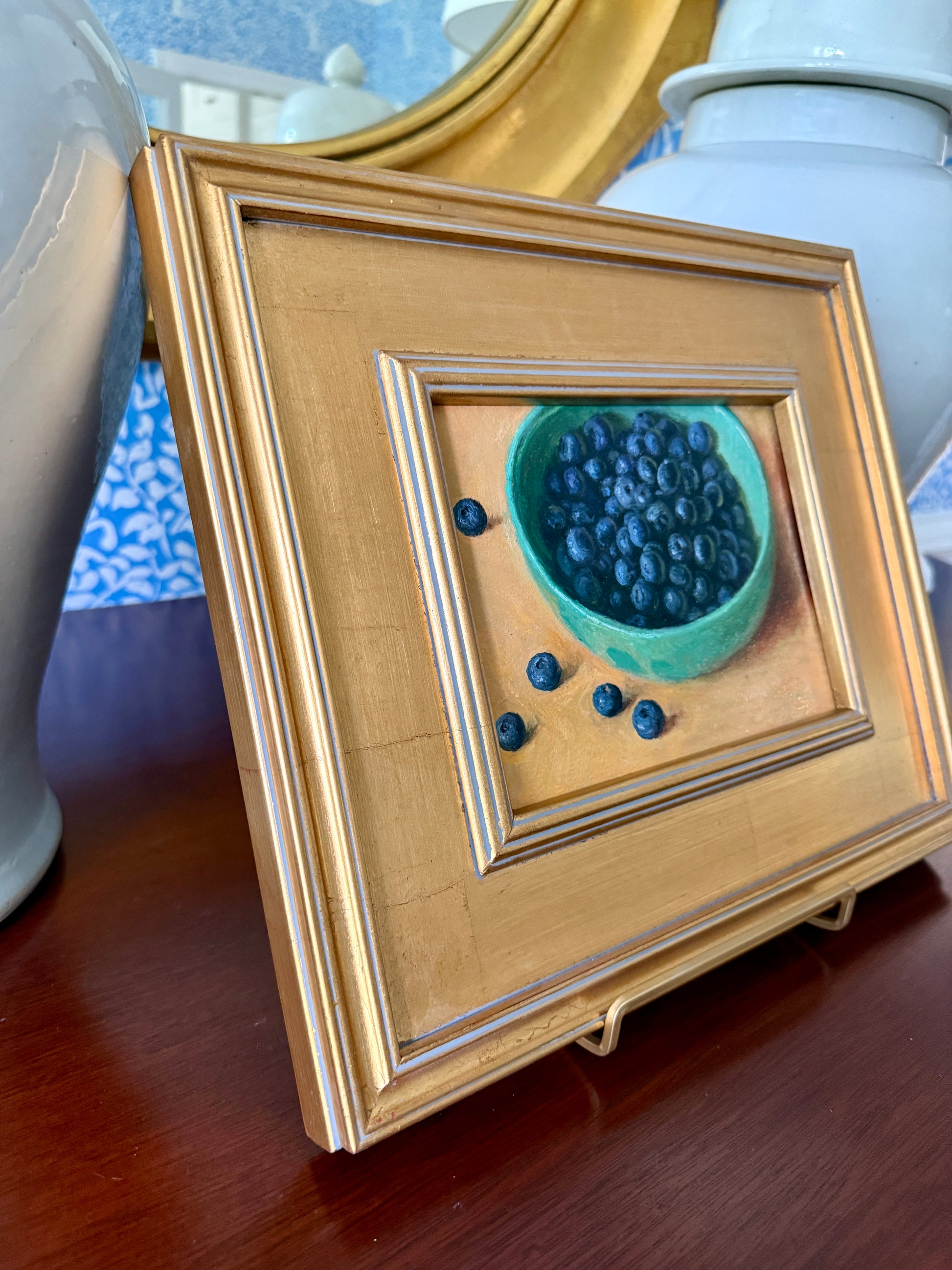 Blueberries in Green Ceramic Bowl Realist Still Life Oil Painting in Gold Frame
