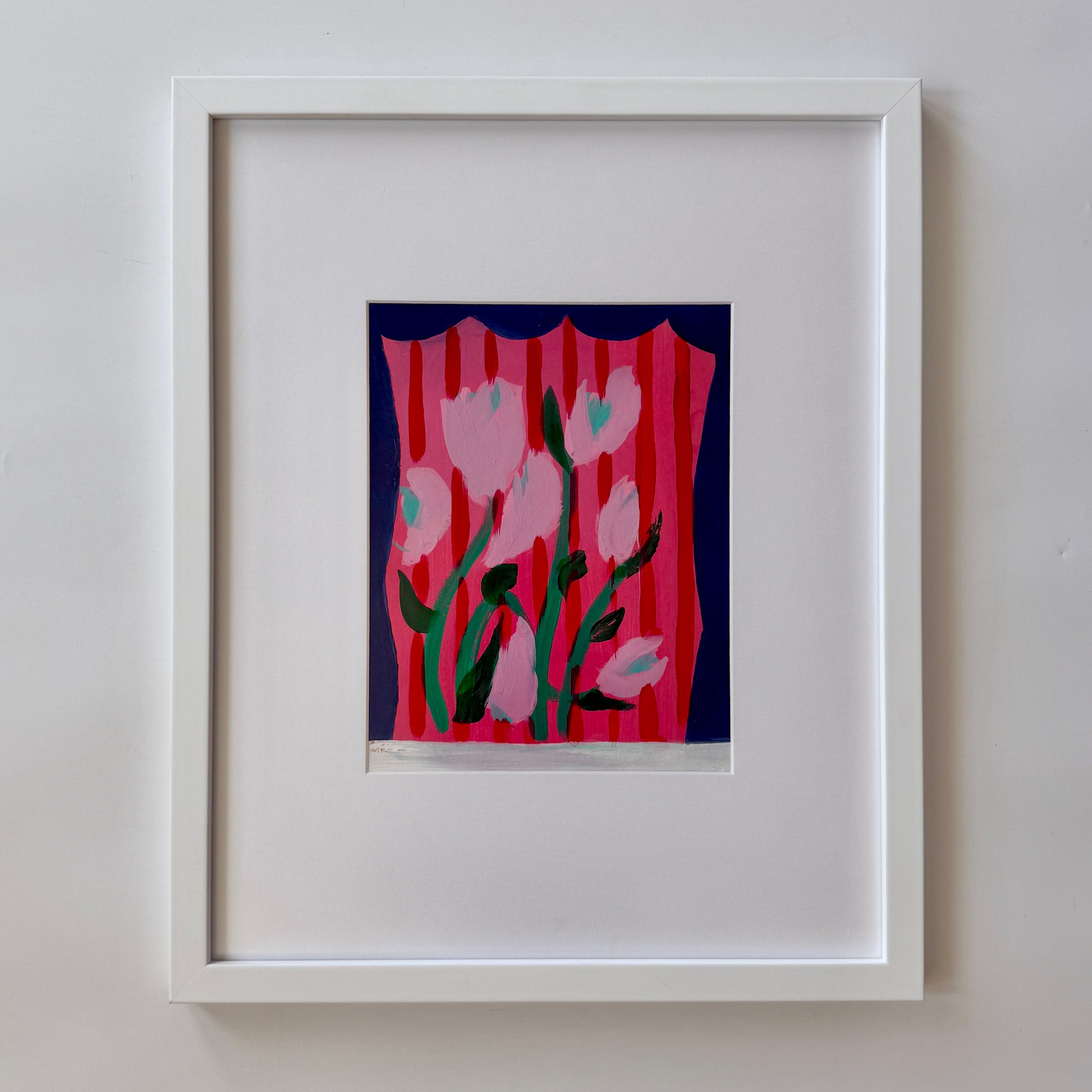 Brigette Hoffman (German / Nicaraguan, 21st century) acrylic painting on paper of pink tulip flowers against a pink and red striped backdrop with navy accents. Artwork in white wood frame under anti-glare acrylic measures 21.75" x 17.5". Signed on the reverse. Artwork and frame in very good condition. Coordinating piece shown in last photos is available in a separate listing.