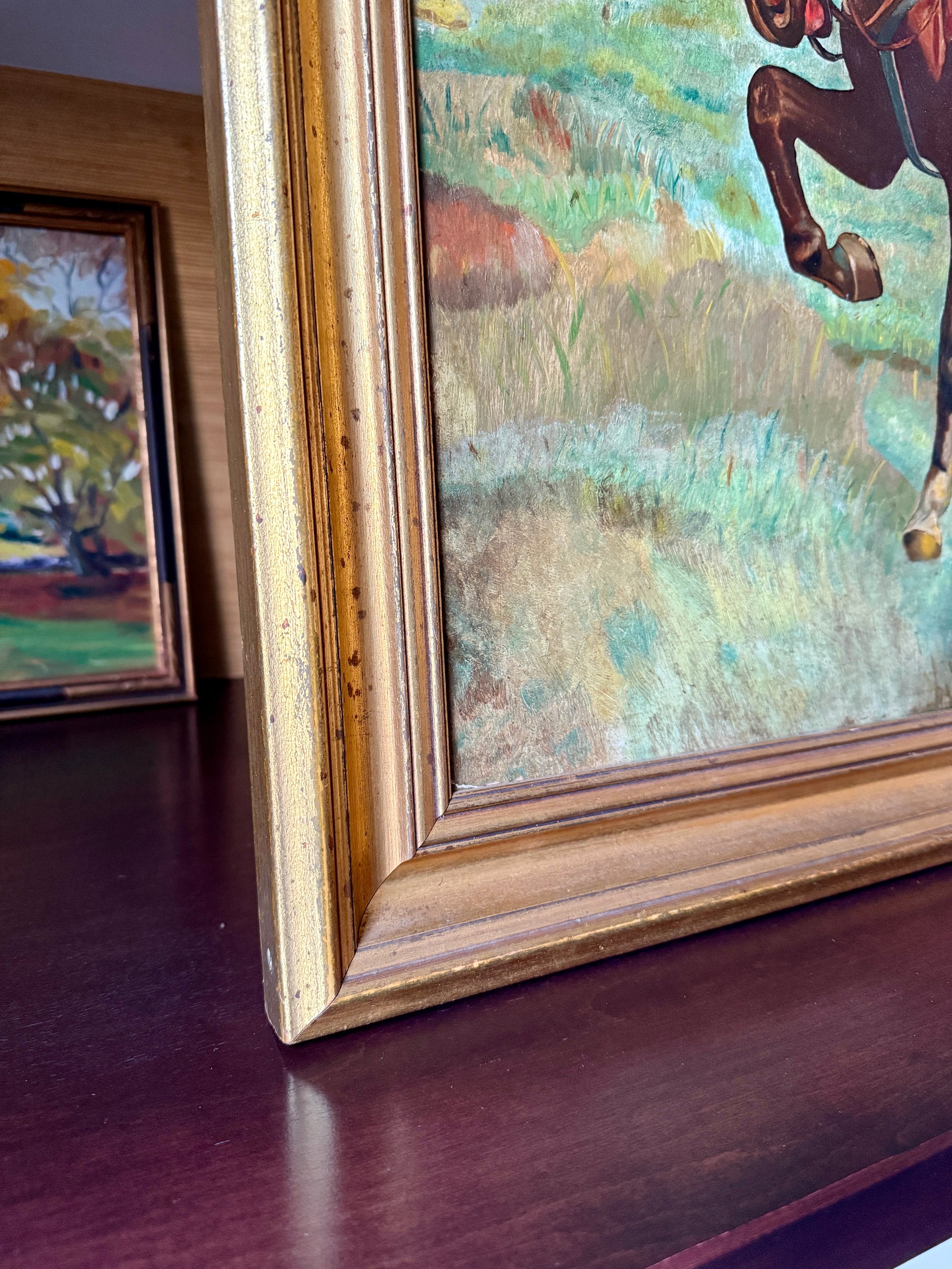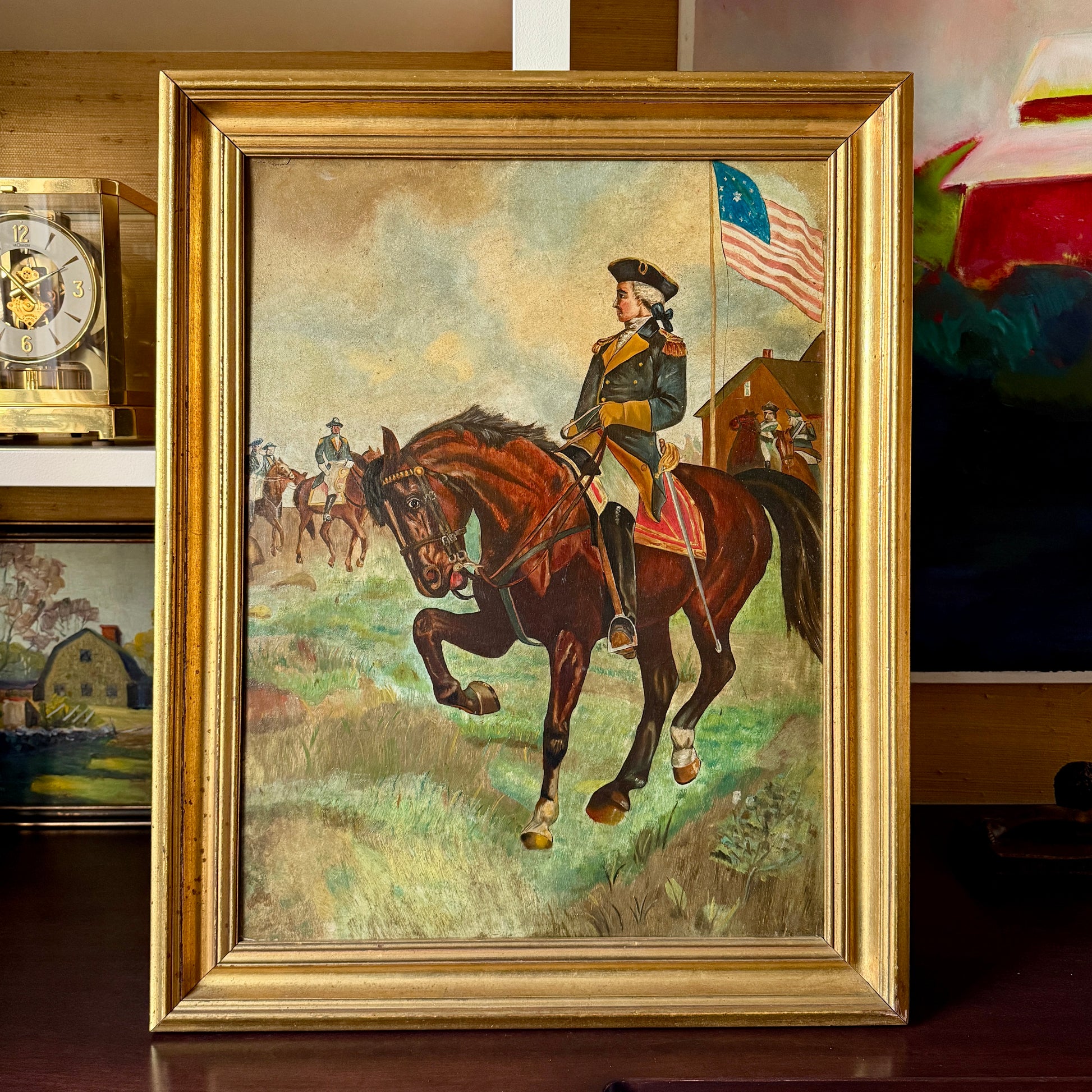 Early 20th century, c. 1900, oil on artist board Revolutionary War portrait of George Washington on horseback. This early 20th-century oil painting portrays George Washington as a commanding figure astride a spirited horse, leading his troops into battle beneath the thirteen-star American flag. Washington’s poised strength contrasts with the movement of the rearing horse and the wind-swept banner, creating a composition full of vigor and national pride. Artwork in antique gilded frame measures 29.25" x 22.75". Artwork and frame in good, antique condition with age appropriate wear.