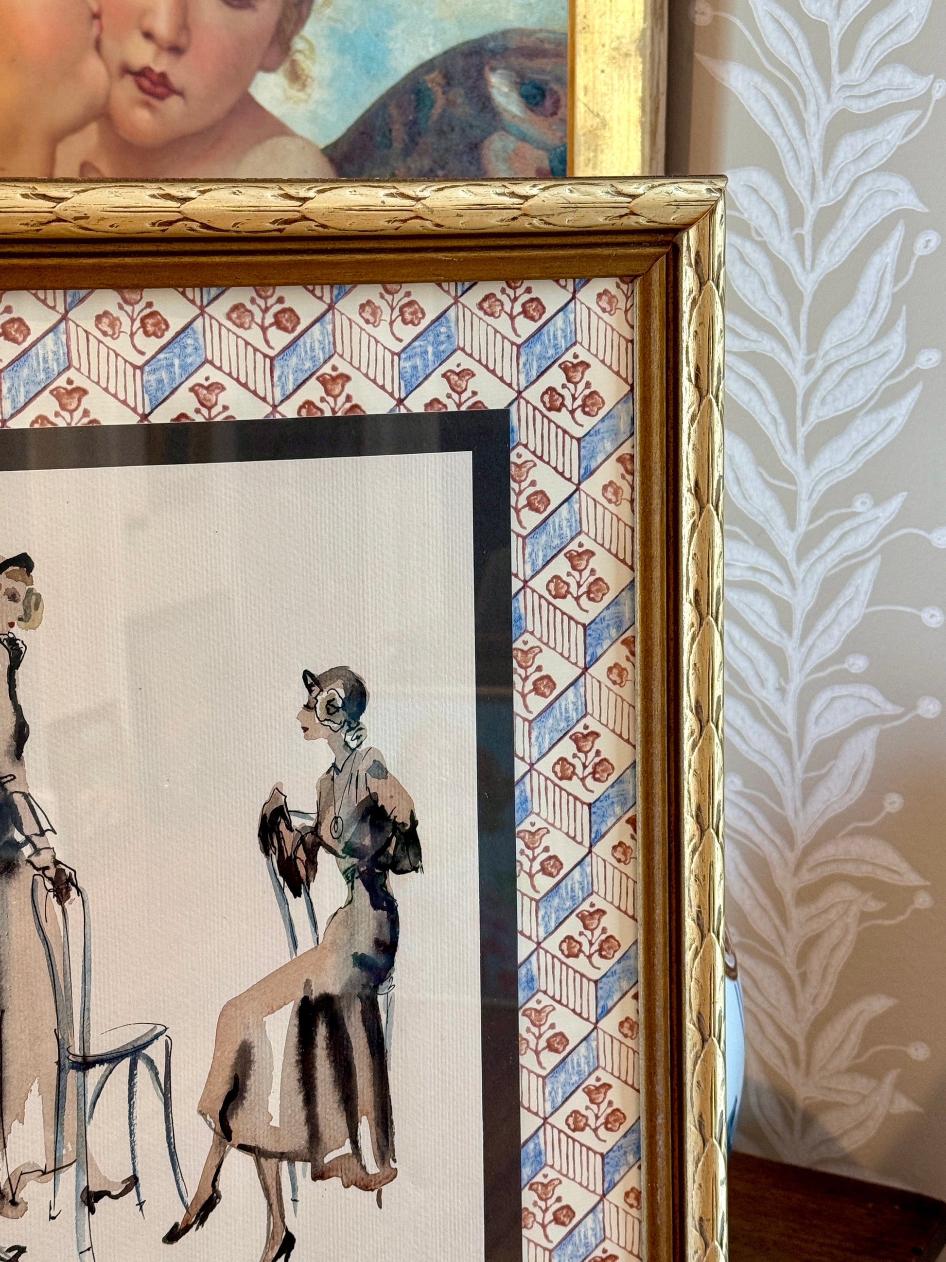 Catherine Figart (American, 1916-2008) mid century fashion watercolor portrait of three ladies. Figart was an illustrator for Vogue Magazine. Mounted on English floral block print. Artwork in vintage, gold wood frame measures 18" x 15". Artwork and frame in very good condition. Additional Figart fashion watercolors are available in separate listings.