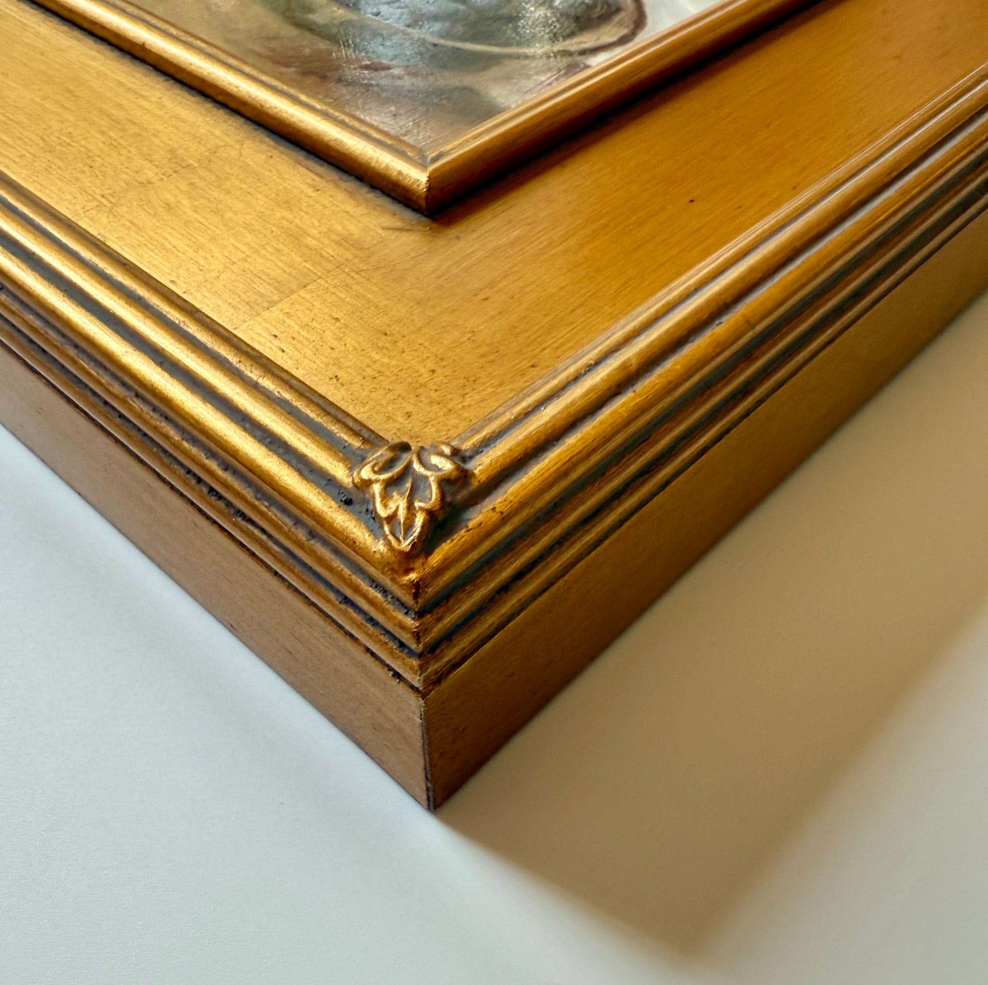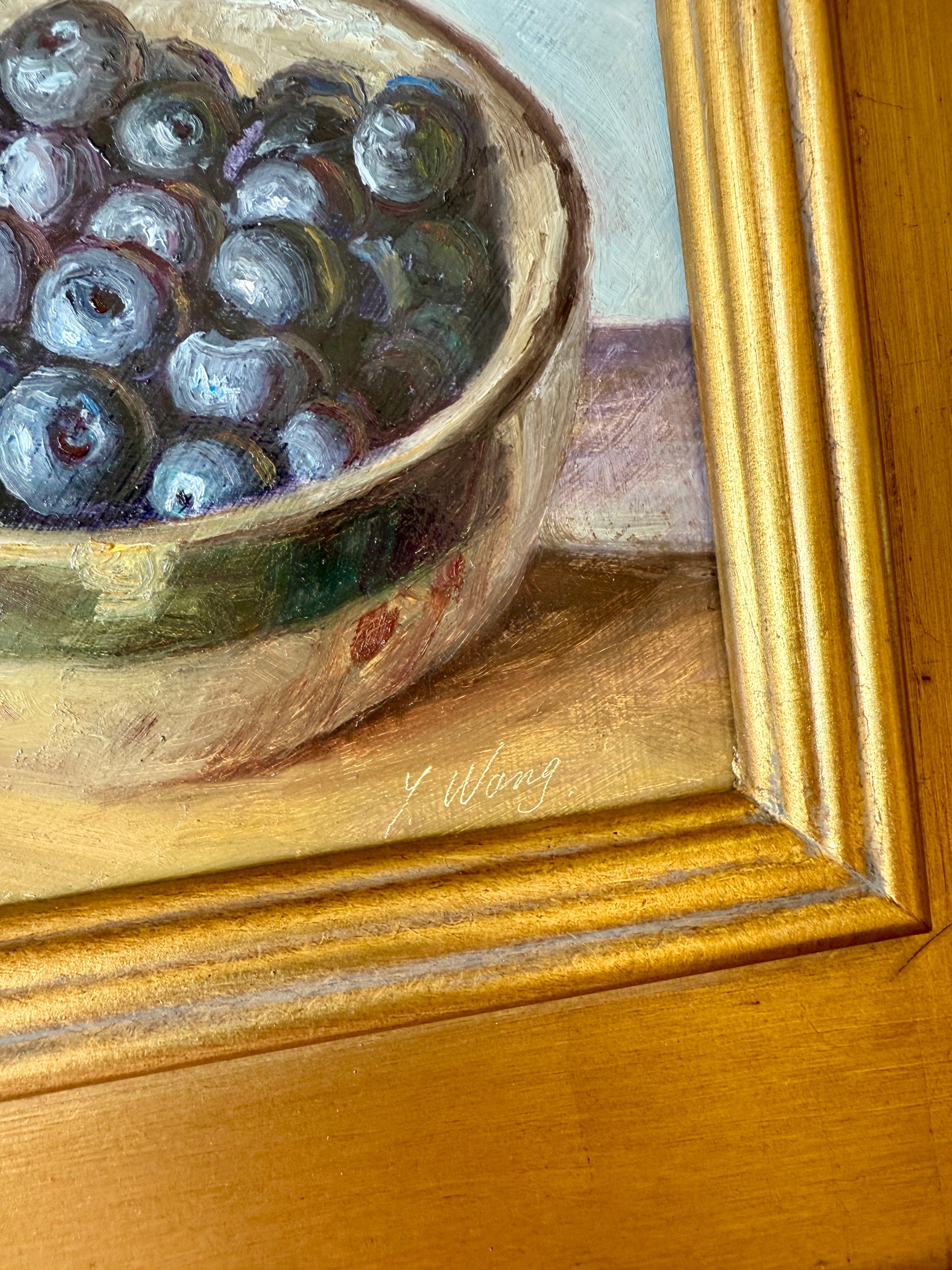 A contemporary, finely done oil painting on board still life of blueberries in a pottery bowl against a red and white striped towel by Youqing Wang (American / Chinese, 21st century). Signed lower right. Artwork in gold solid wood frame measures 11" x 13". Artwork and frame in very good condition.