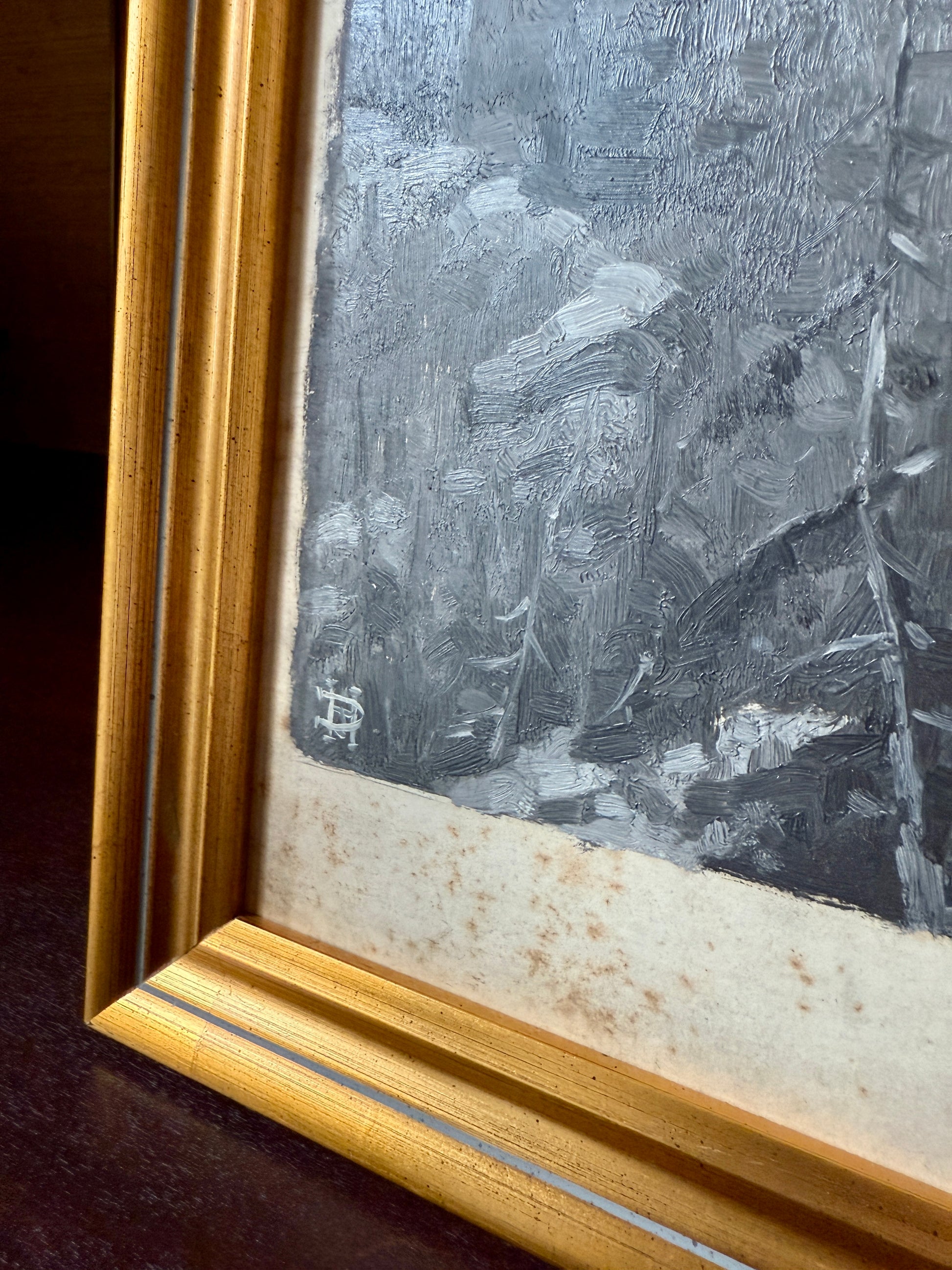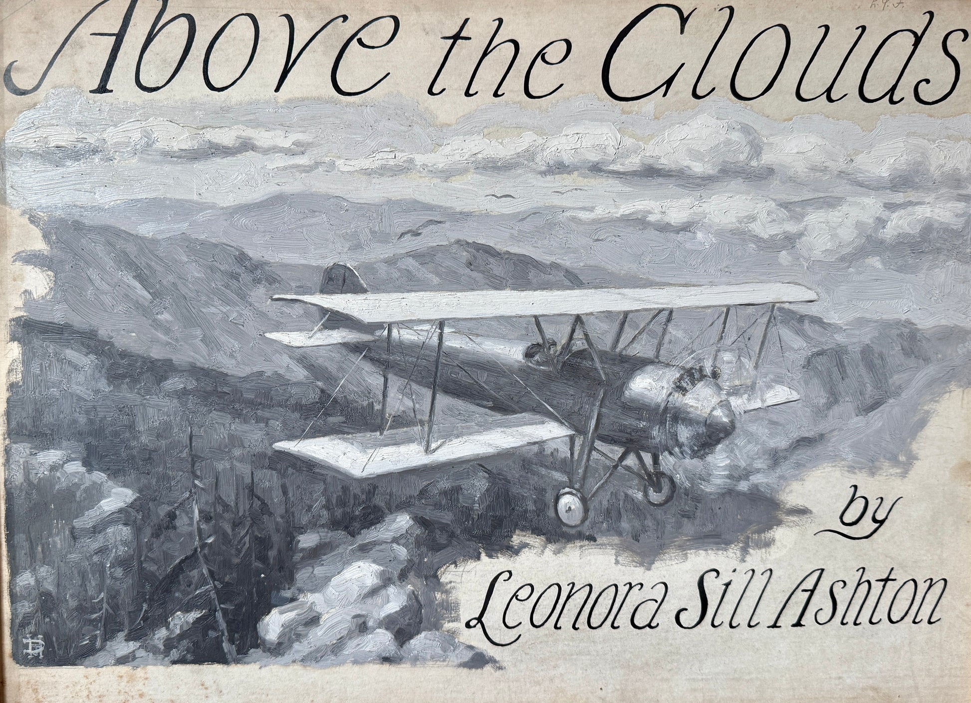 Donald Humphries (American / Delaware, 20th century) en grisaille oil paint on board illustration of a biplane flying over a mountainous landscape. Inscribed Above the Clouds. Created for a story by Leonora Sill Ashton. Monogrammed "DSH". Artwork in gold frame measures 16.75" x 21.75". Artwork in good condition with light wear to board. Frame in good, age appropriate condition with scattered wear.