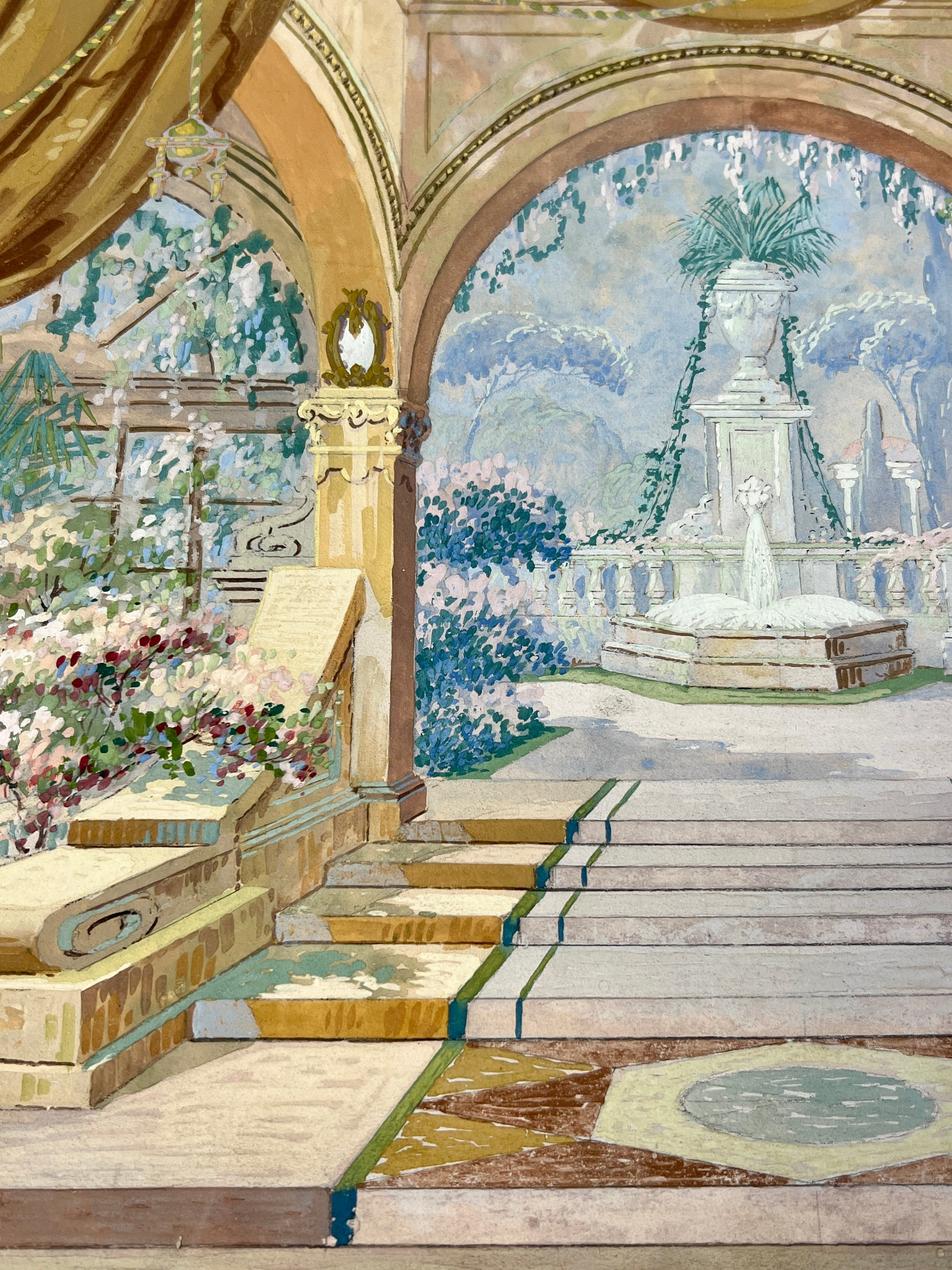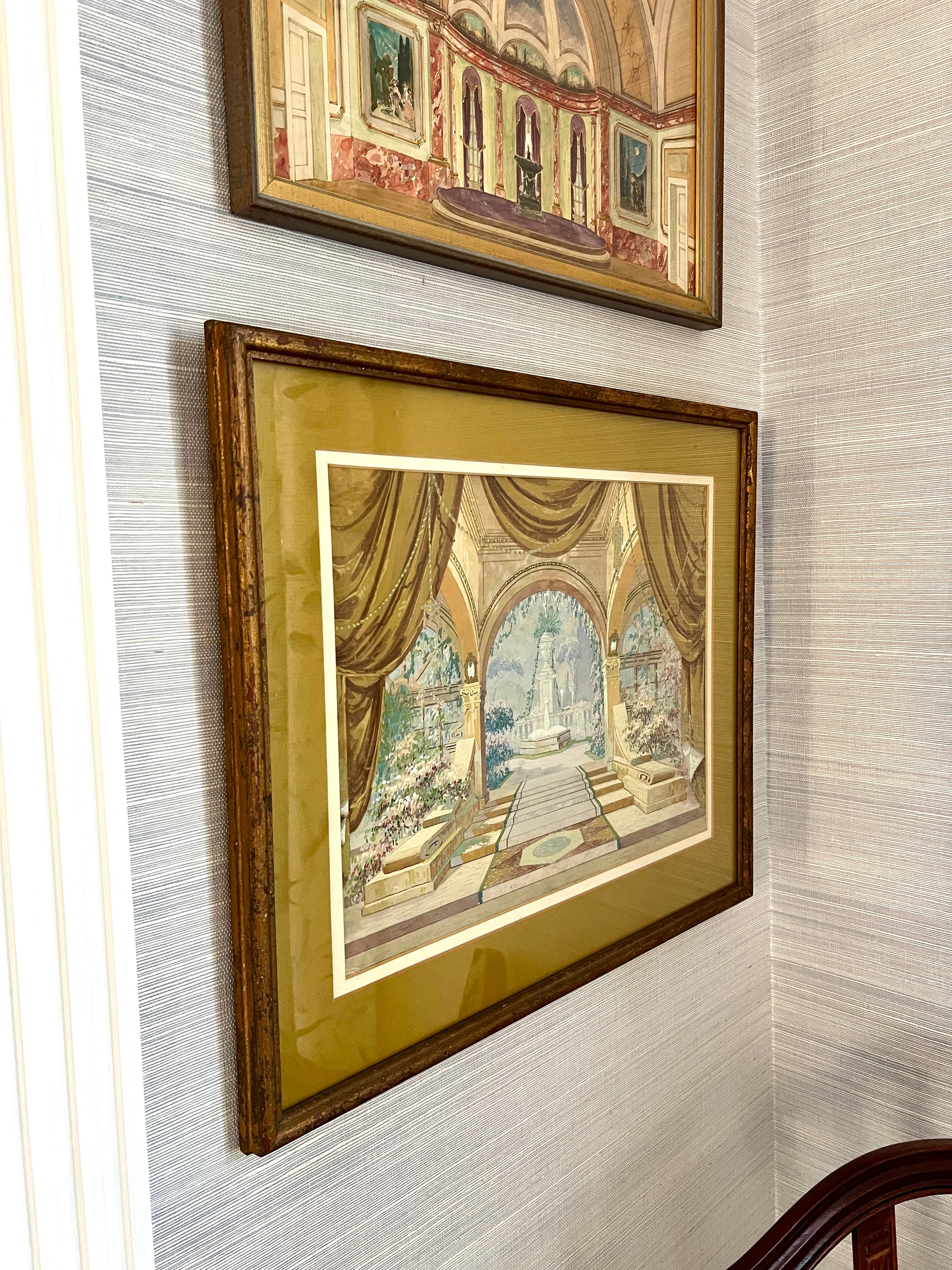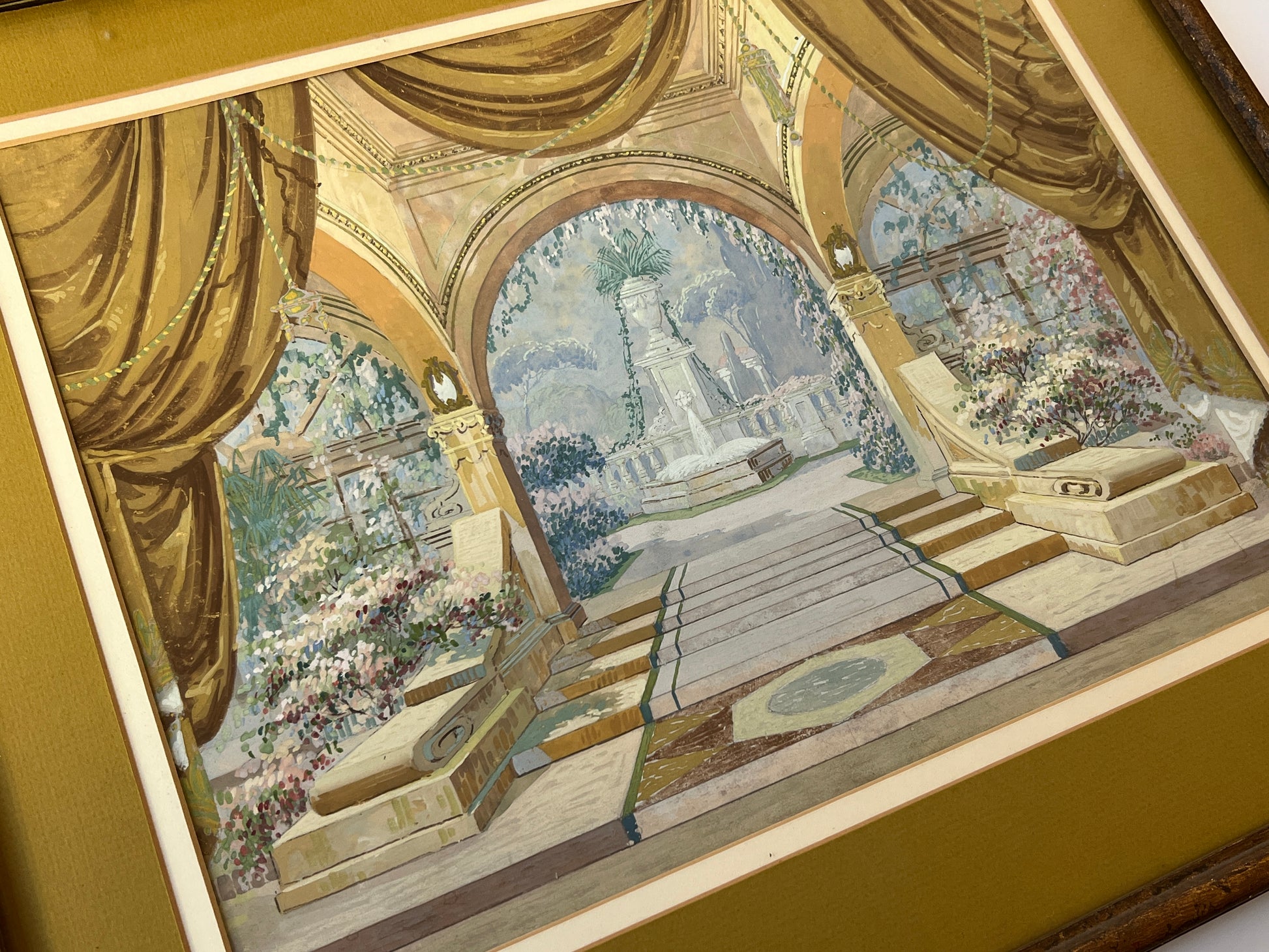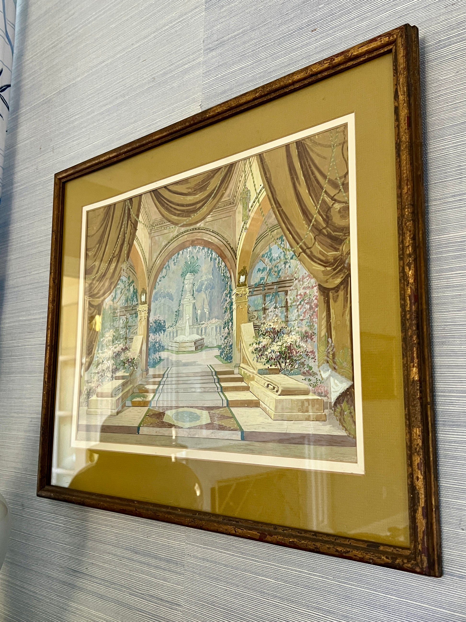 An elaborate early 20th century gouache painting of a theatrical set design done for Mid-West Scenic and Stage Co. in Milwaukee, Wisconsin. Matted in a dark chartreuse. An intricate and beautifully done capture of the many hyper-detailed layers of this set. Artwork in original lightly gilded frame measures 18.5" x 22.5". Artwork and frame in very good condition with light wear.
