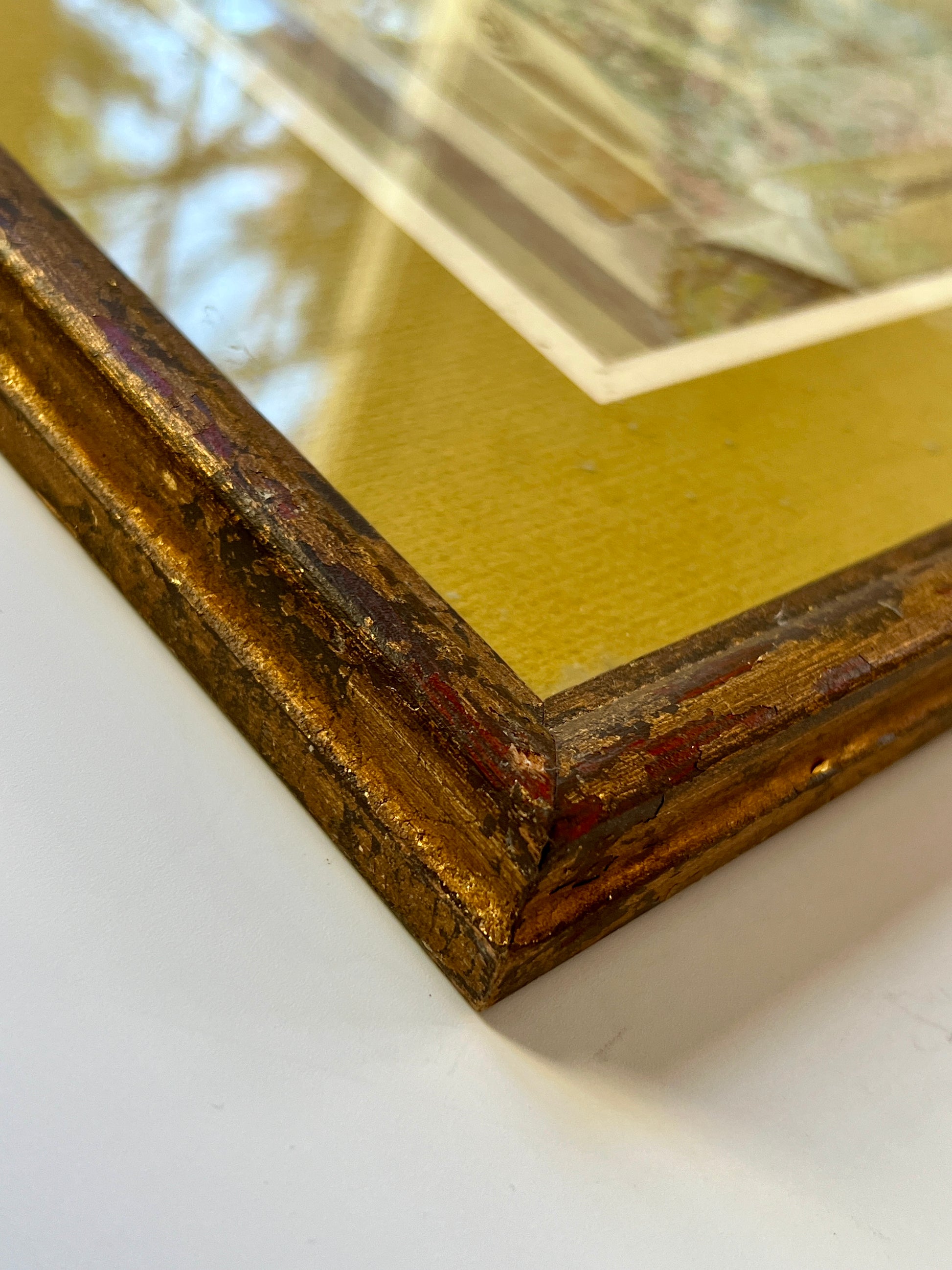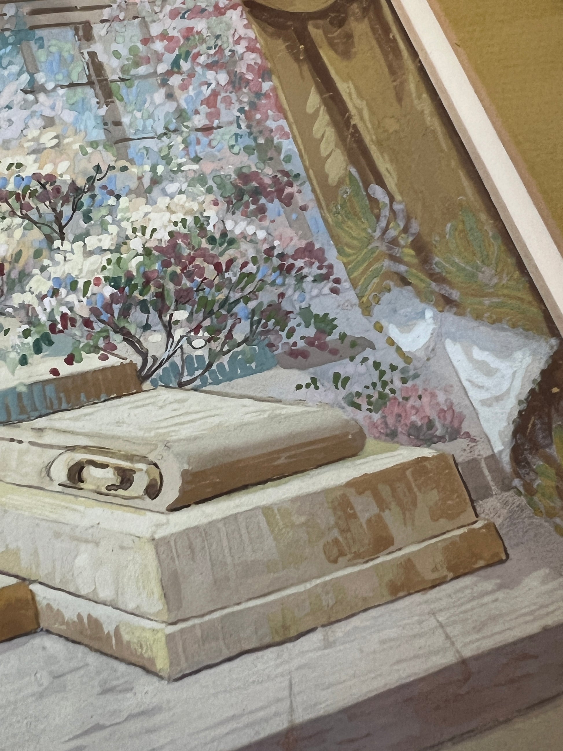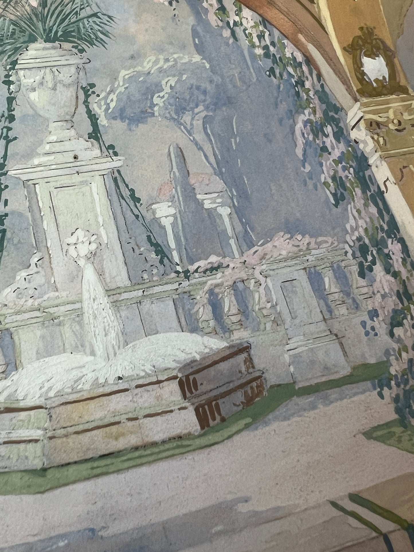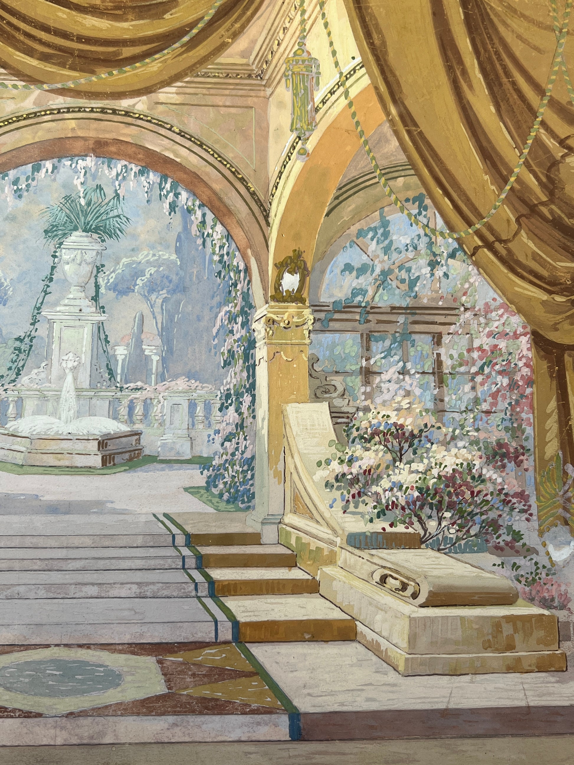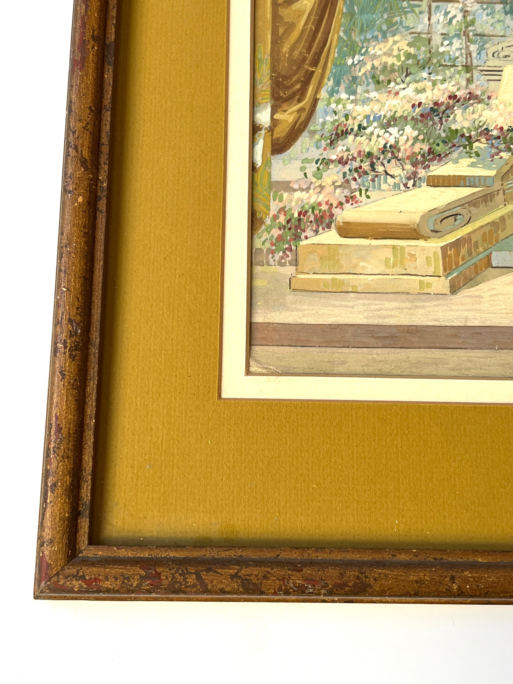 An elaborate early 20th century gouache painting of a theatrical set design done for Mid-West Scenic and Stage Co. in Milwaukee, Wisconsin. Matted in a dark chartreuse. An intricate and beautifully done capture of the many hyper-detailed layers of this set. Artwork in original lightly gilded frame measures 18.5" x 22.5". Artwork and frame in very good condition with light wear.