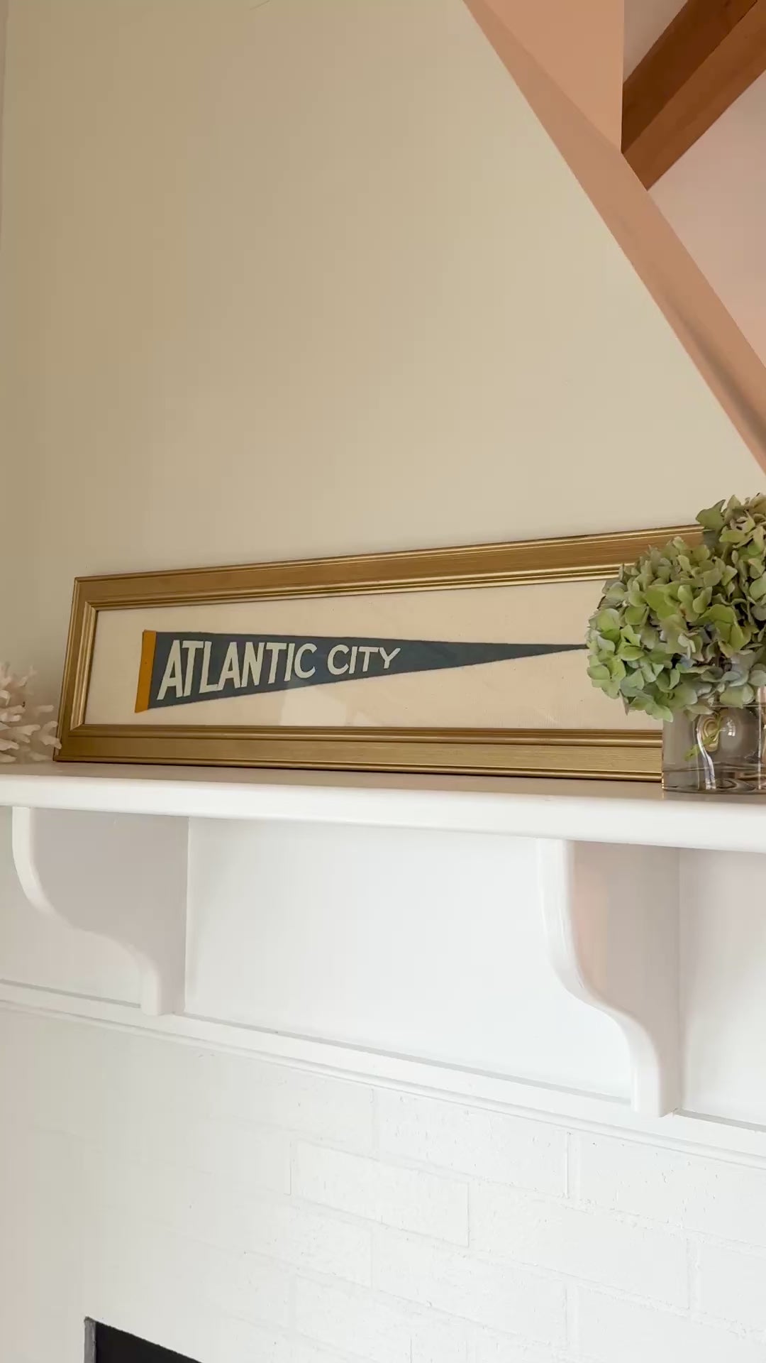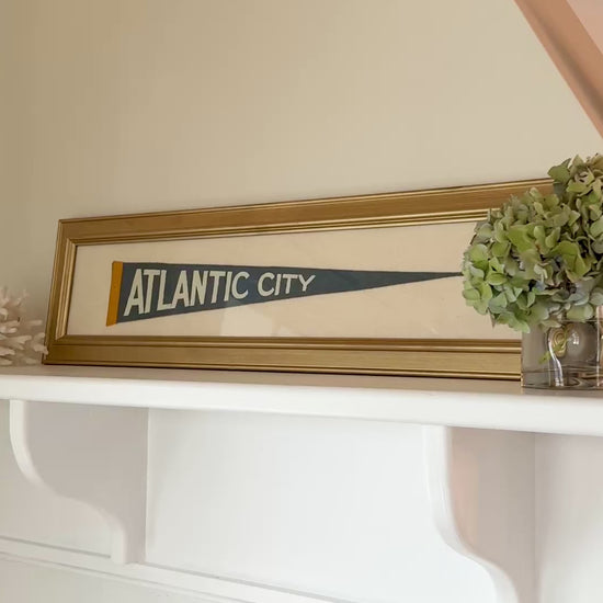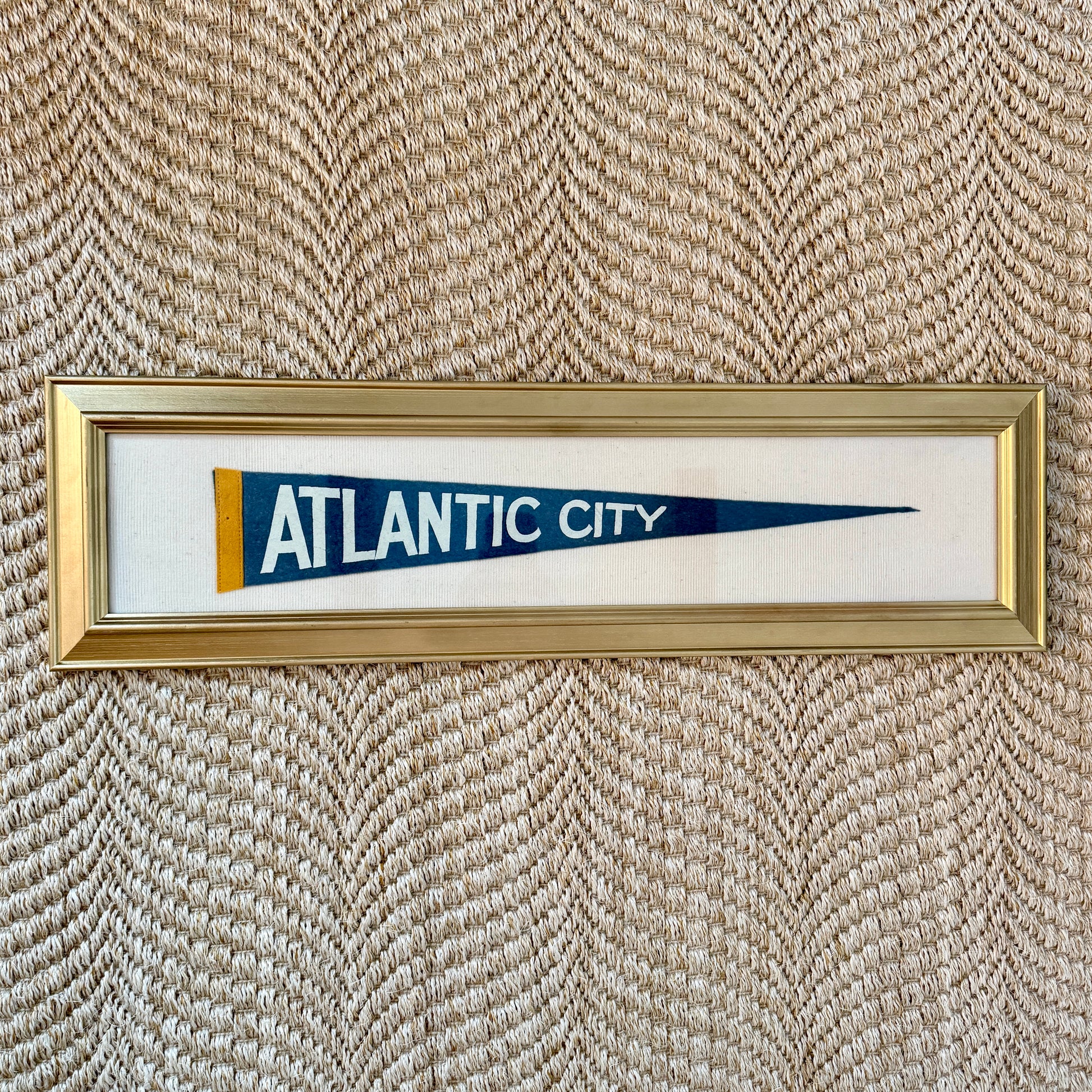Early 20th century wool Atlantic City large pennant mounted on a fine wale ivory corduroy. Pennant in vintage gold wood frame measures 8.25" x 29.5". Pennant and frame in very good condition.