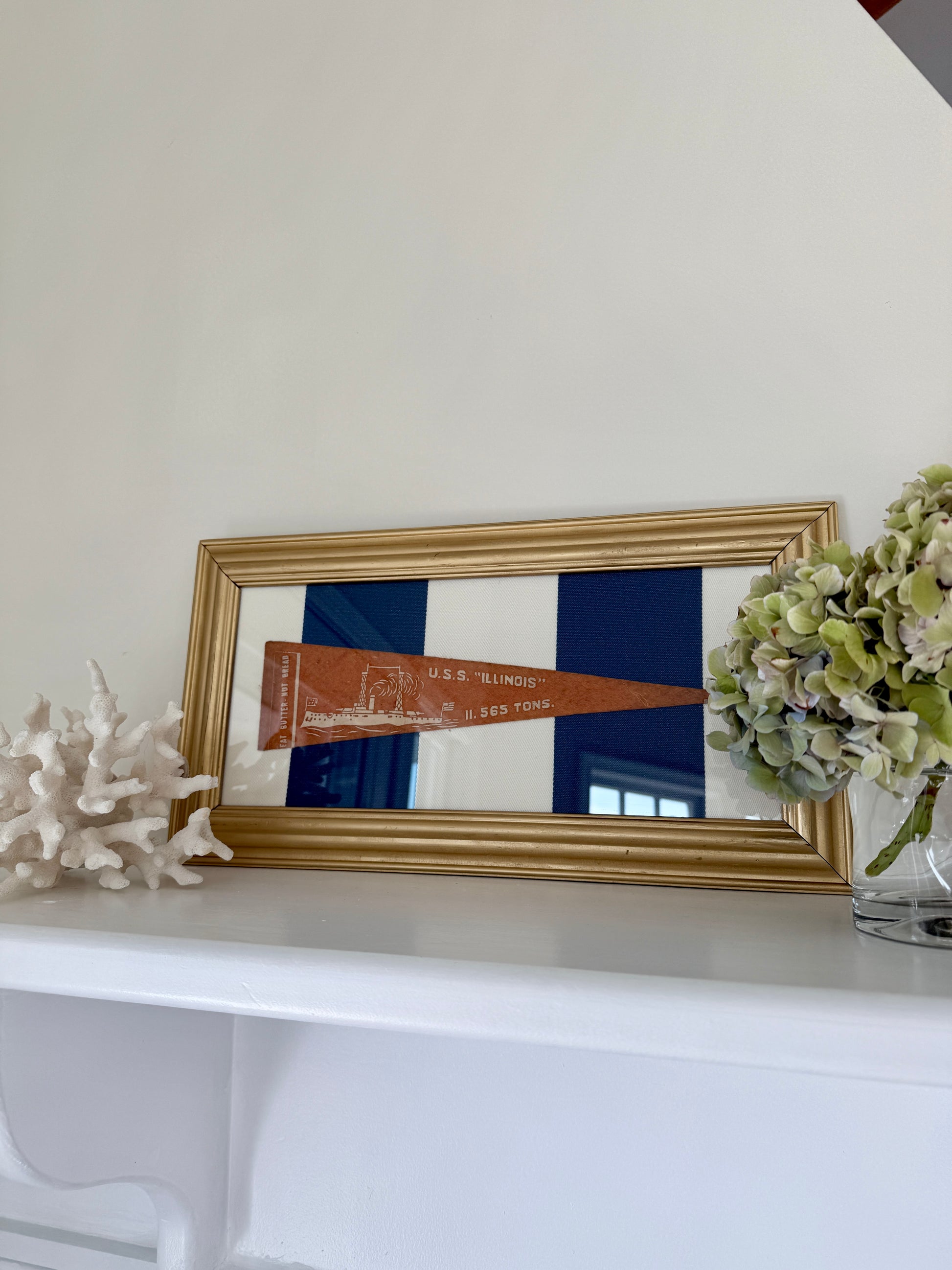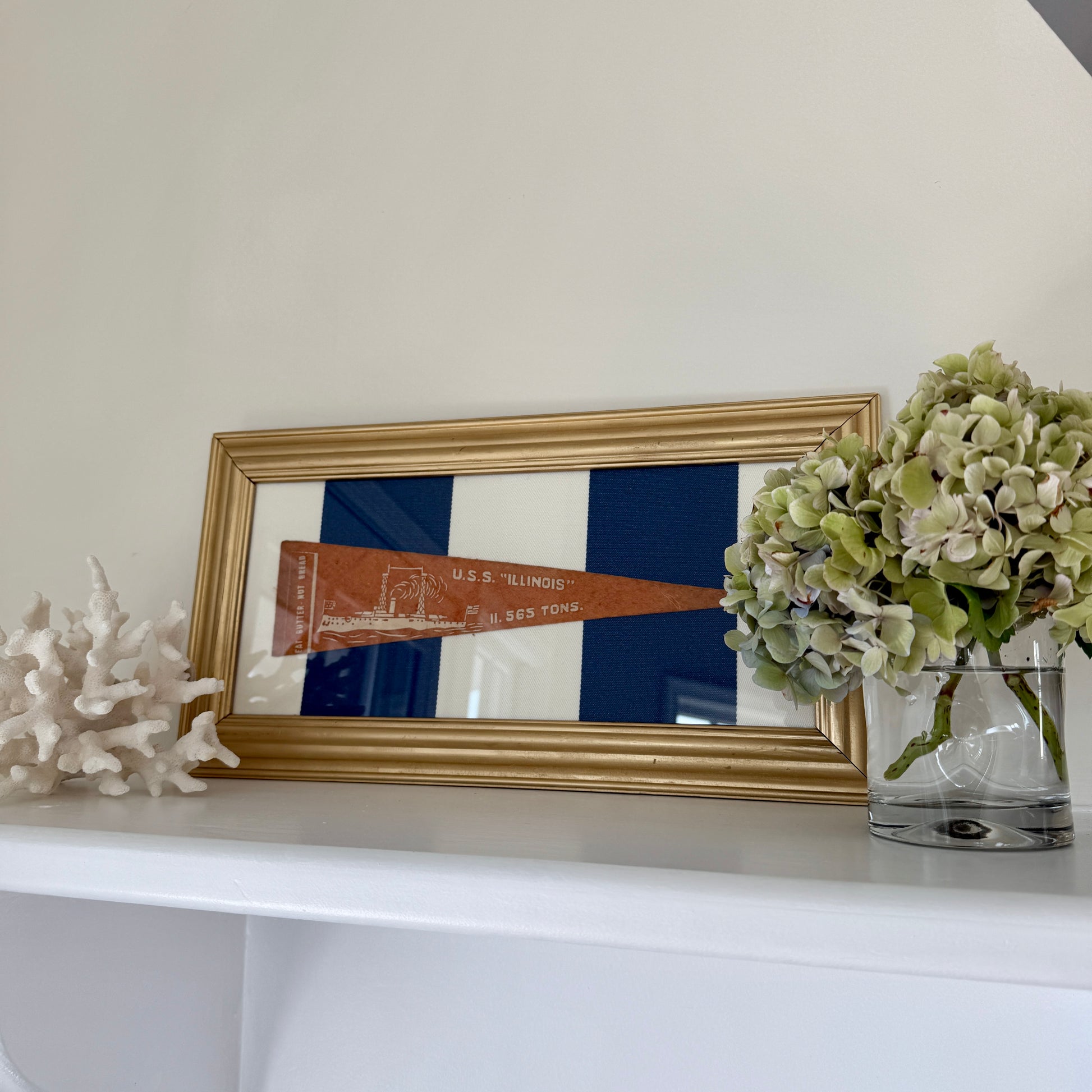 Early 20th Century U.S.S. Illinois Naval Ship Wool Pennant on Blue Awning Stripes in Gold Frame