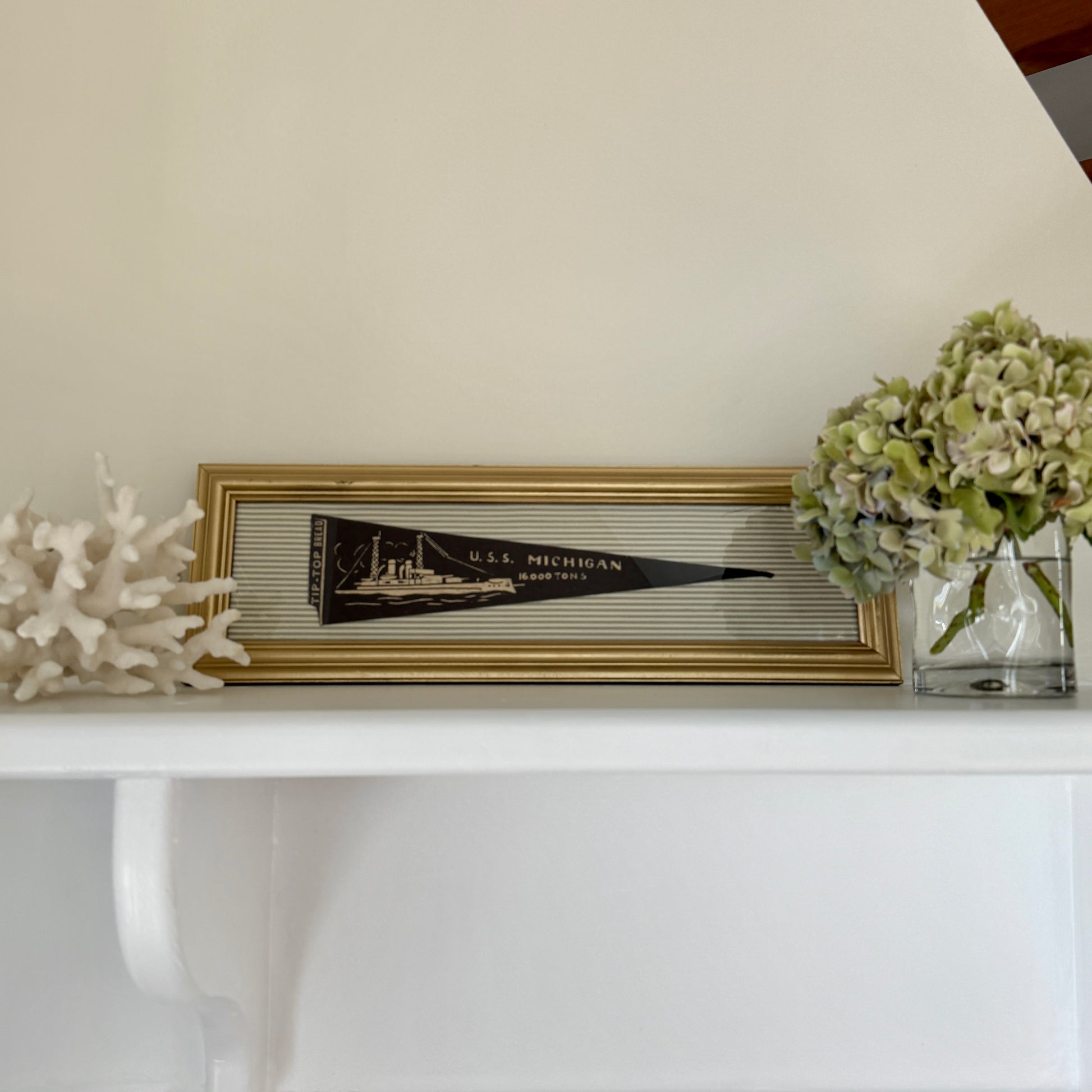 Early 20th century U.S.S. Michigan chocolate brown wool pennant made by the Butter-Nut Bread Company mounted on a tan and white ticking stripe fabric. Pennant in vintage gold frame measures 5.75" x 17.75". Pennant and frame in very good condition with light wear, including a small missing piece at the bottom left corner of the pennant. Coordinating ship pennants are available in separate listings.