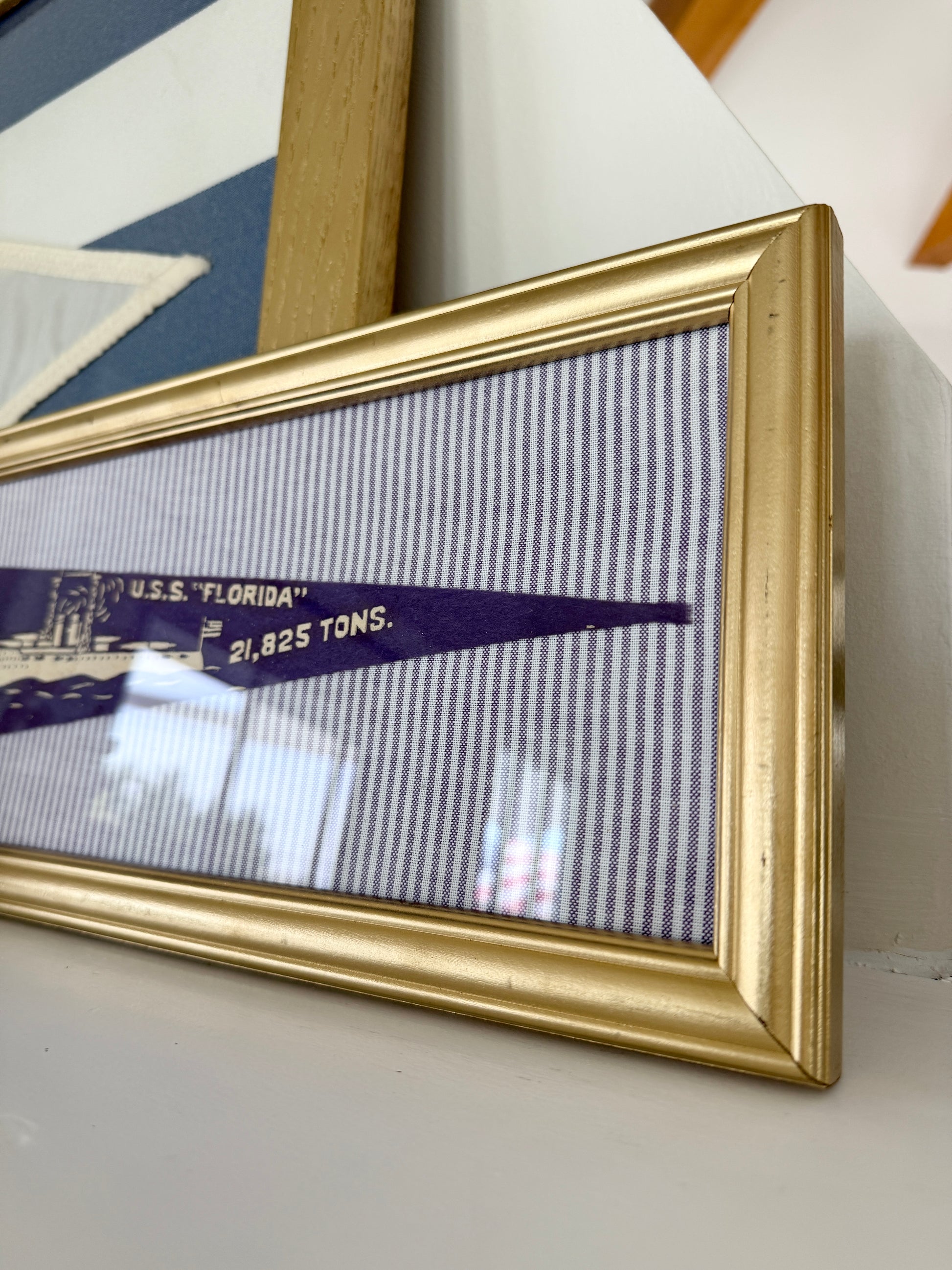Early 20th Century U.S.S. Florida Naval Ship Wool Pennant on Lavender Ticking Stripes in Gold Frame