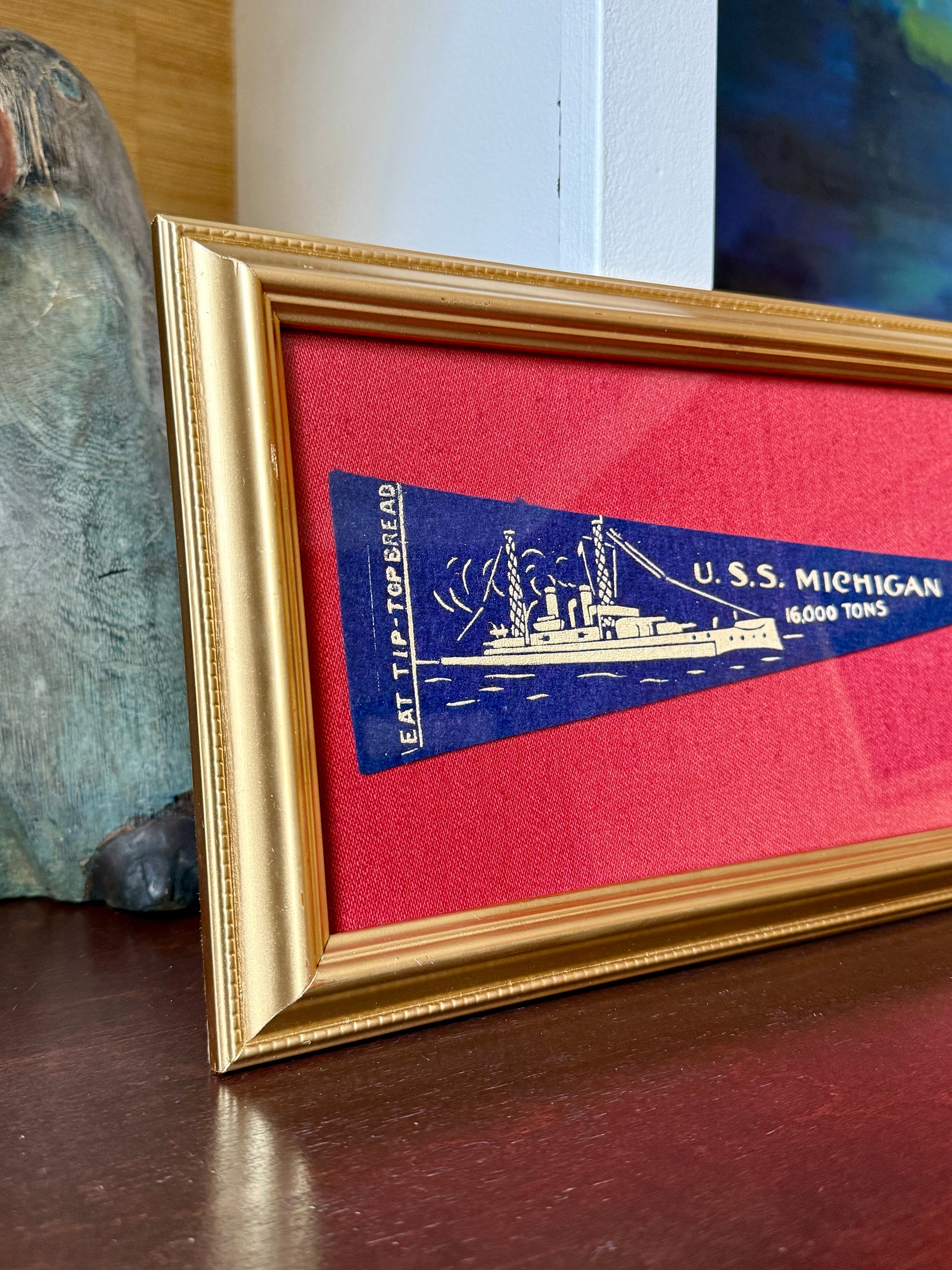 Early 20th century U.S.S. Michigan navy wool pennant made by the Butter-Nut Bread Company mounted on red pique fabric. Pennant in vintage gold frame measures 7.5" x 15". Pennant and frame in good condition with light wear.