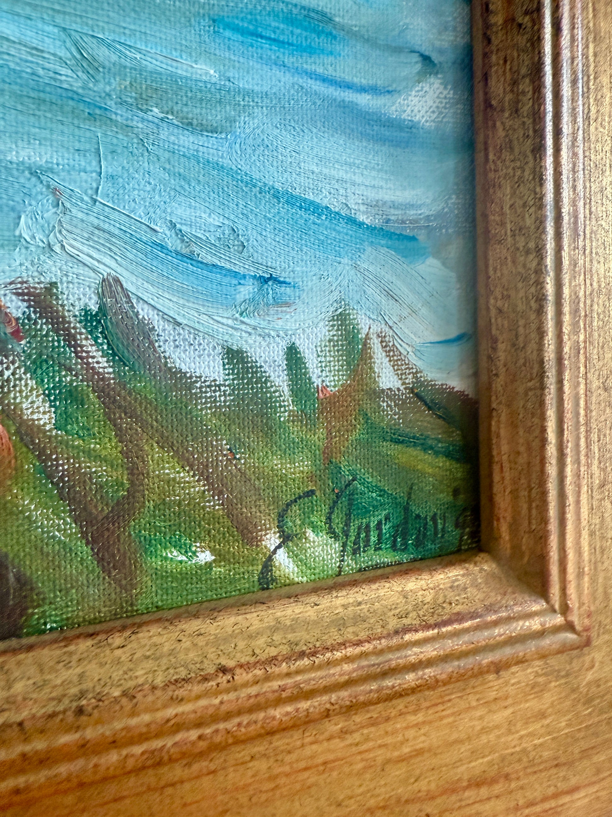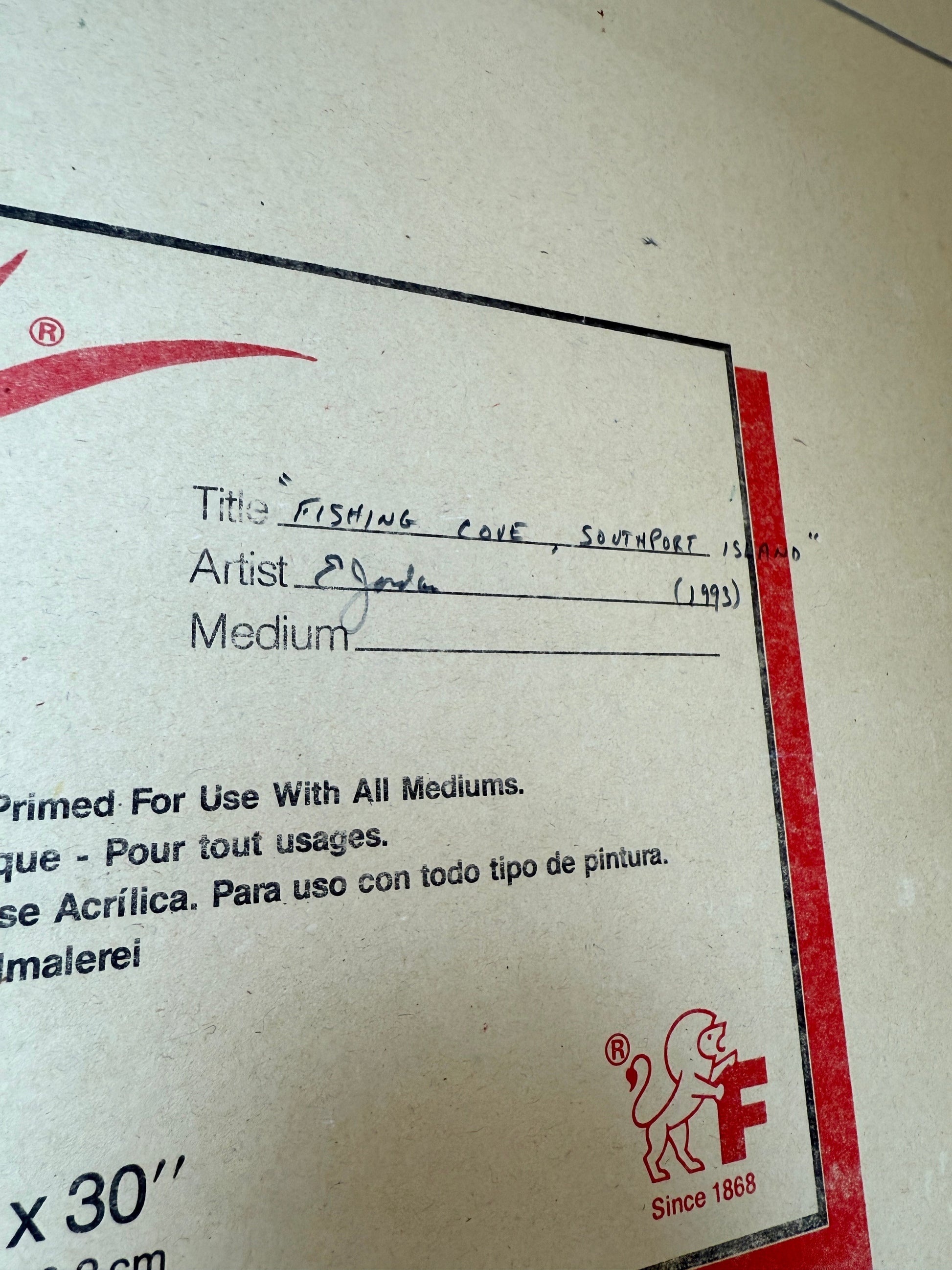 Edmund Jordan (American / Pennsylvania, 20th century) colorful impressionist oil painting on board of an idyllic New England fishing cove filled with small boats. Signed lower right. Titled on the reverse Fishing Cove Southport Island (Maine). Dated 1993. Jordan was a master of light and water, as is evident in this piece. Jordan favored the East Coast, painting from Cape May, NJ up through Cape Cod and the shores of Maine. His love for and familiarity with these quiet coastal locales gives his work a tranquil, easy feeling. Artwork in a large, warm gold solid wood frame measures 31" x 36.75". Artwork and frame in very good condition.