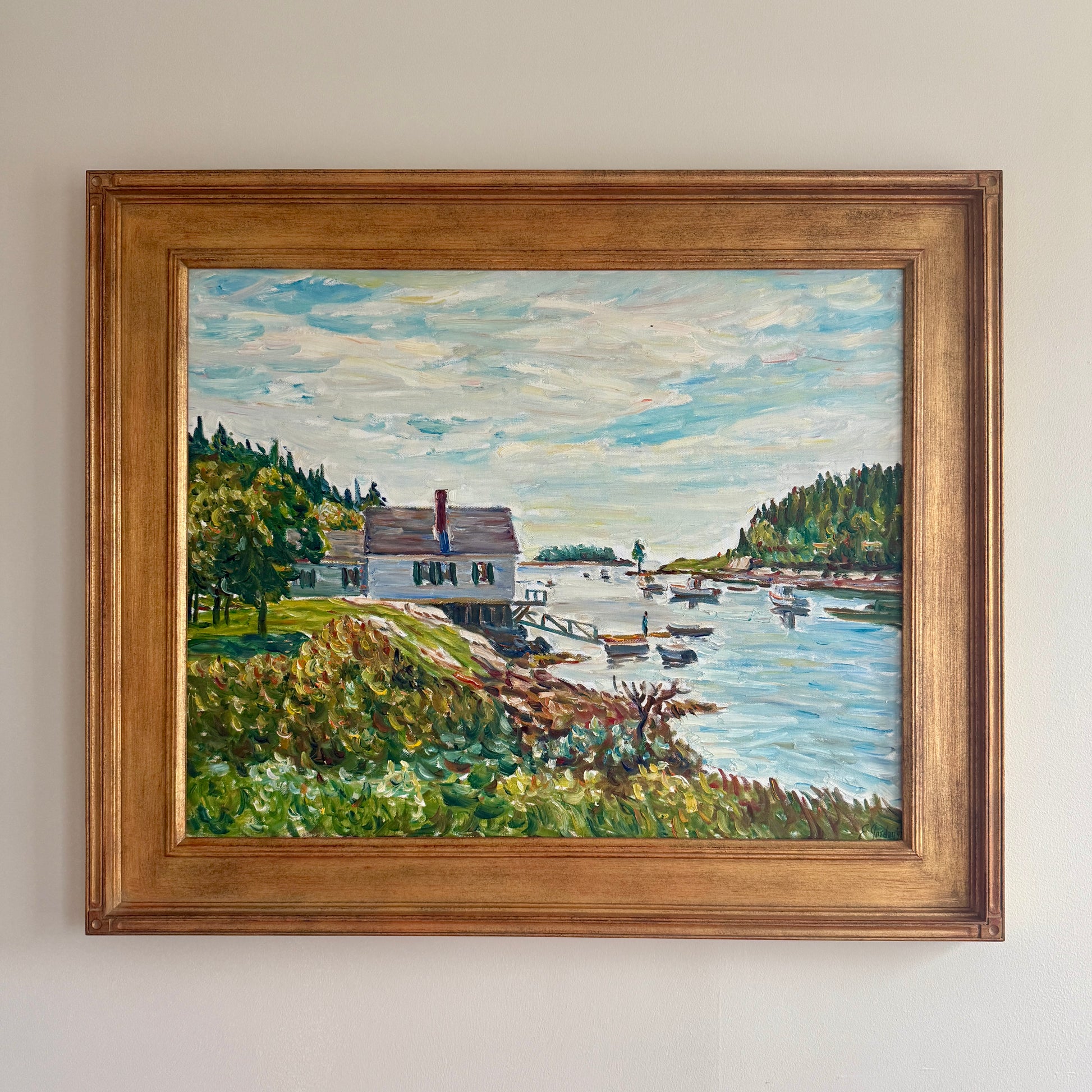 Edmund Jordan Fishing Cove Southport Island, Maine Oil Painting in Gold Frame