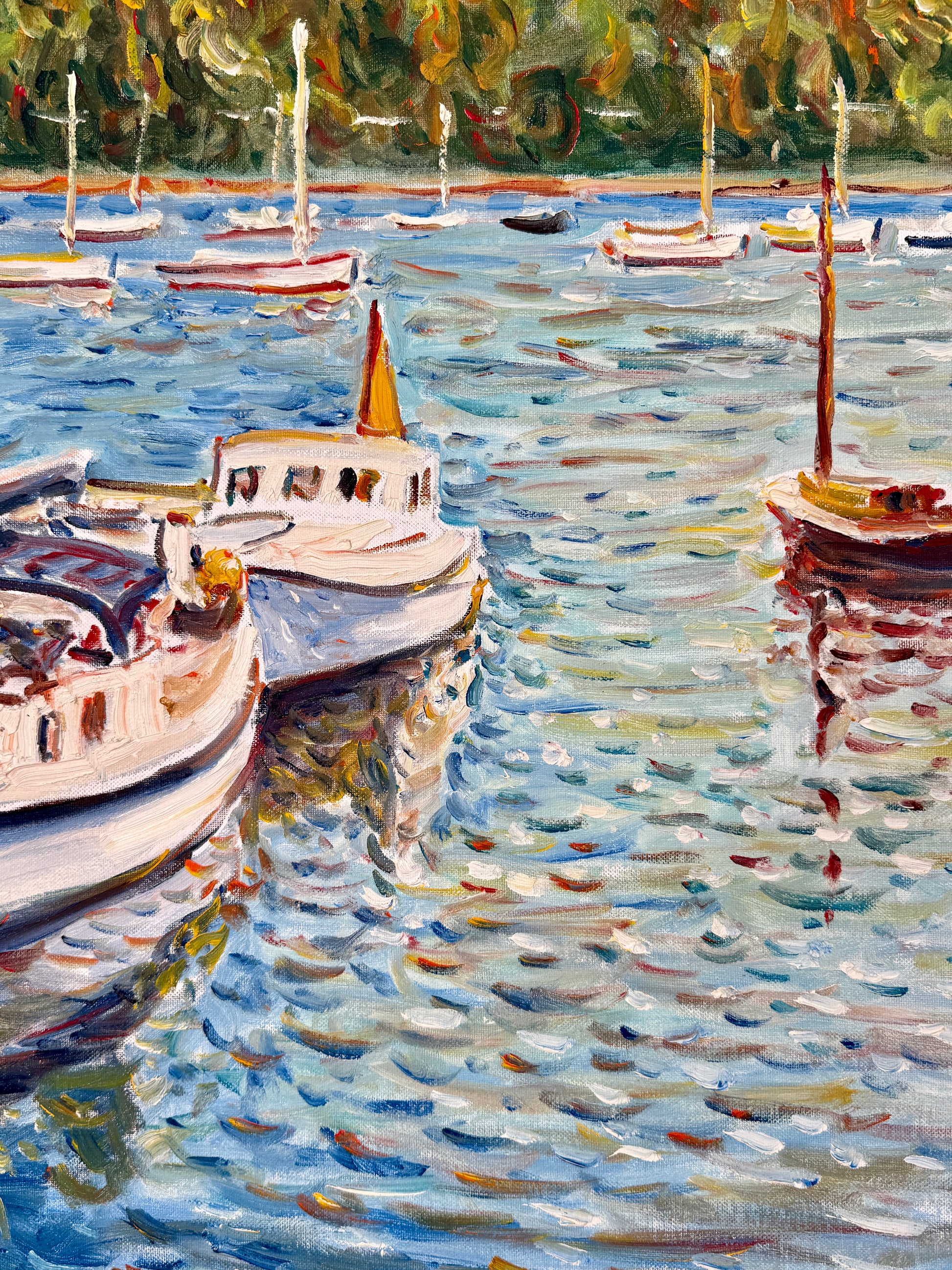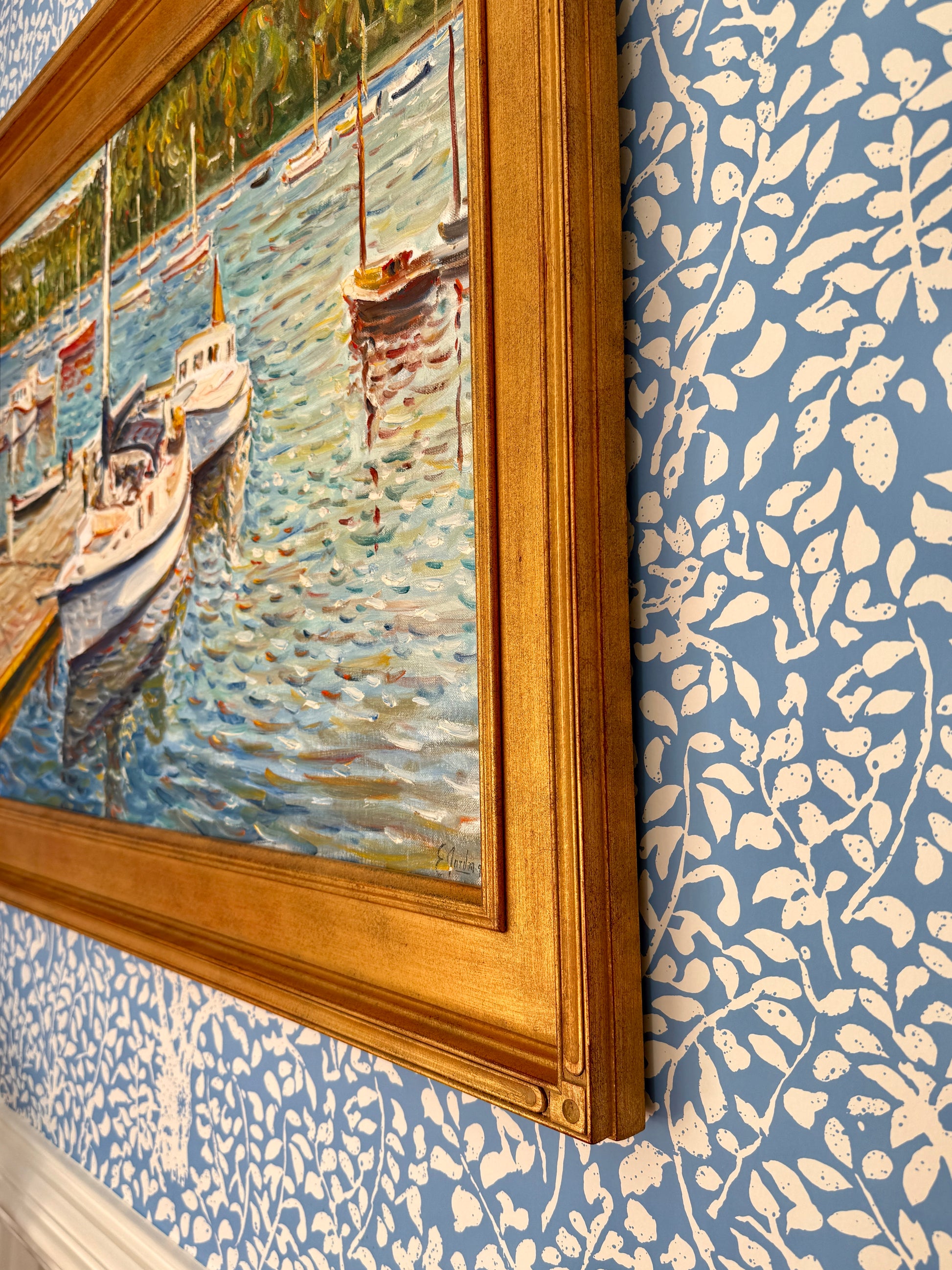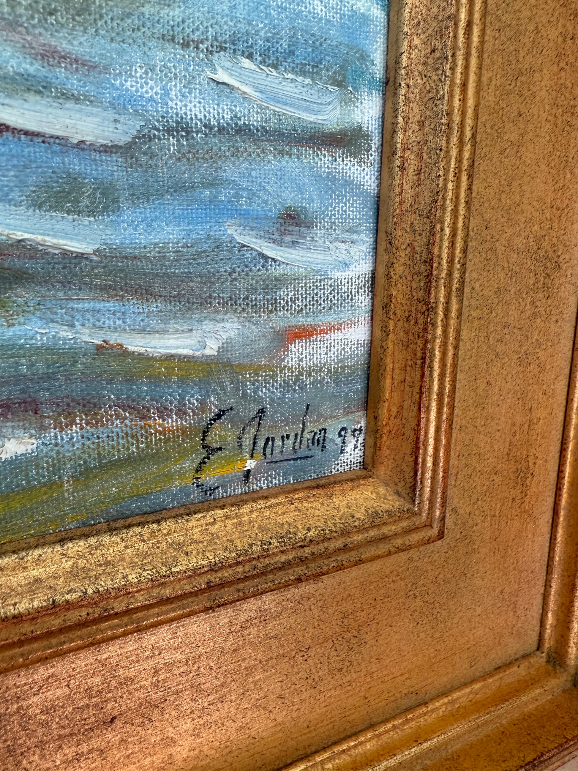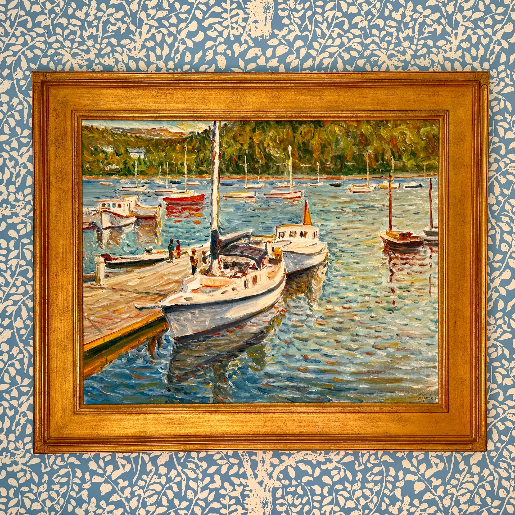 Edmund Jordan (American / Pennsylvania, 20th century) colorful impressionist oil painting on board of an glistening cove bustling with sailboats. Signed lower right, and dated 1999. Jordan was a master of light and water, as is evident in this piece. Jordan favored the East Coast, painting from Cape May, NJ up through Cape Cod and the shores of Maine. His love for and familiarity with these quiet coastal locales gives his work a tranquil, easy feeling. Artwork in a large, warm gold solid wood frame measures 30.75" x 37". Artwork and frame in very good condition.