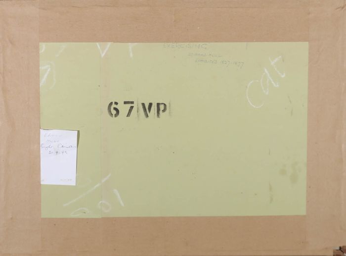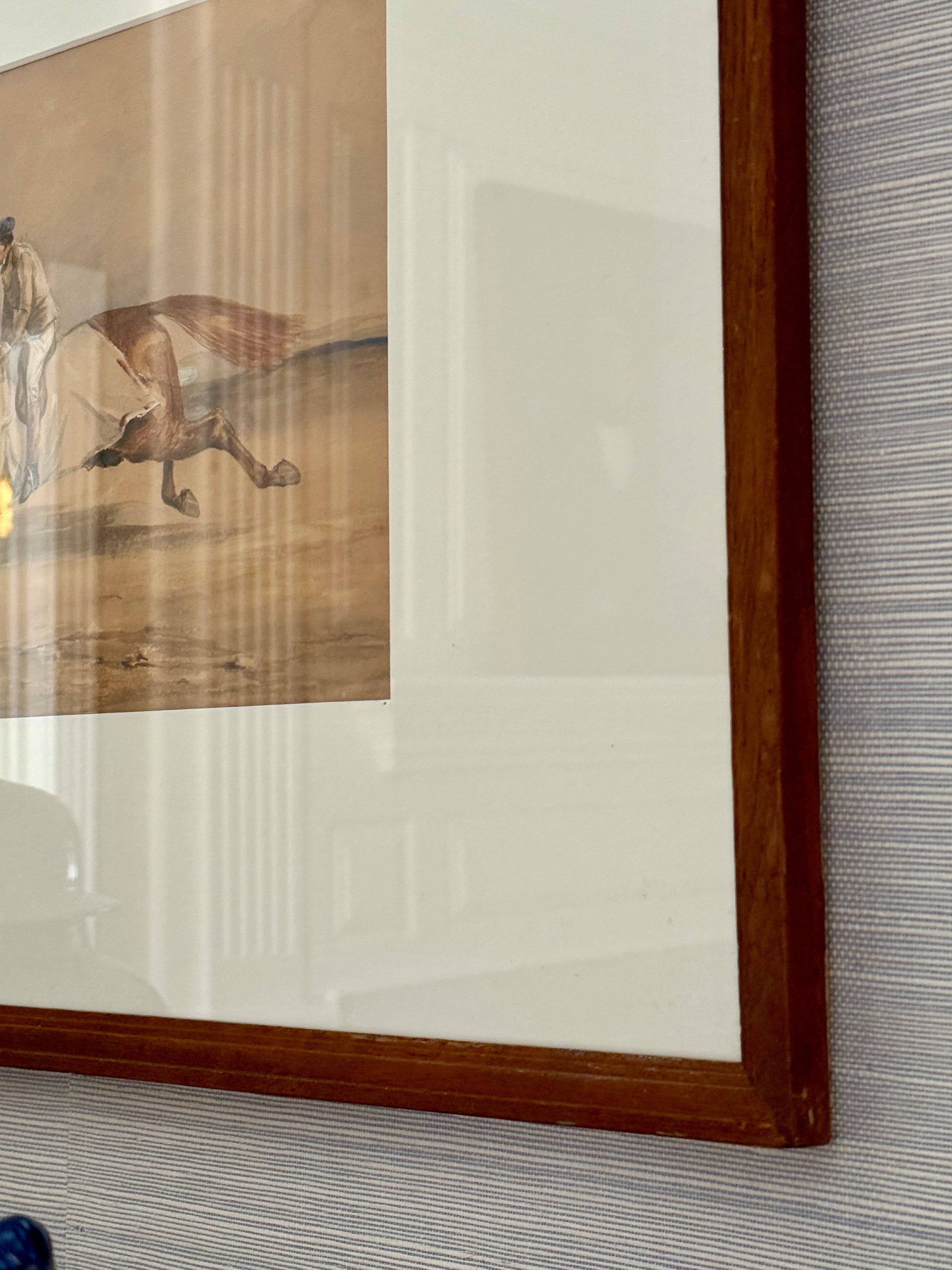 Edward Hull (British, 1810-1877) watercolor portrait of a horse and jockey in full stride. Signed at lower left. Note on the reverse that this piece was purchased at Christie's on July 31, 1973. Artwork in vintage, wood frame measures 17.25" x 23.25". Artwork in very good condition. Frame in good condition with age appropriate wear and minor separation at bottom left corner.