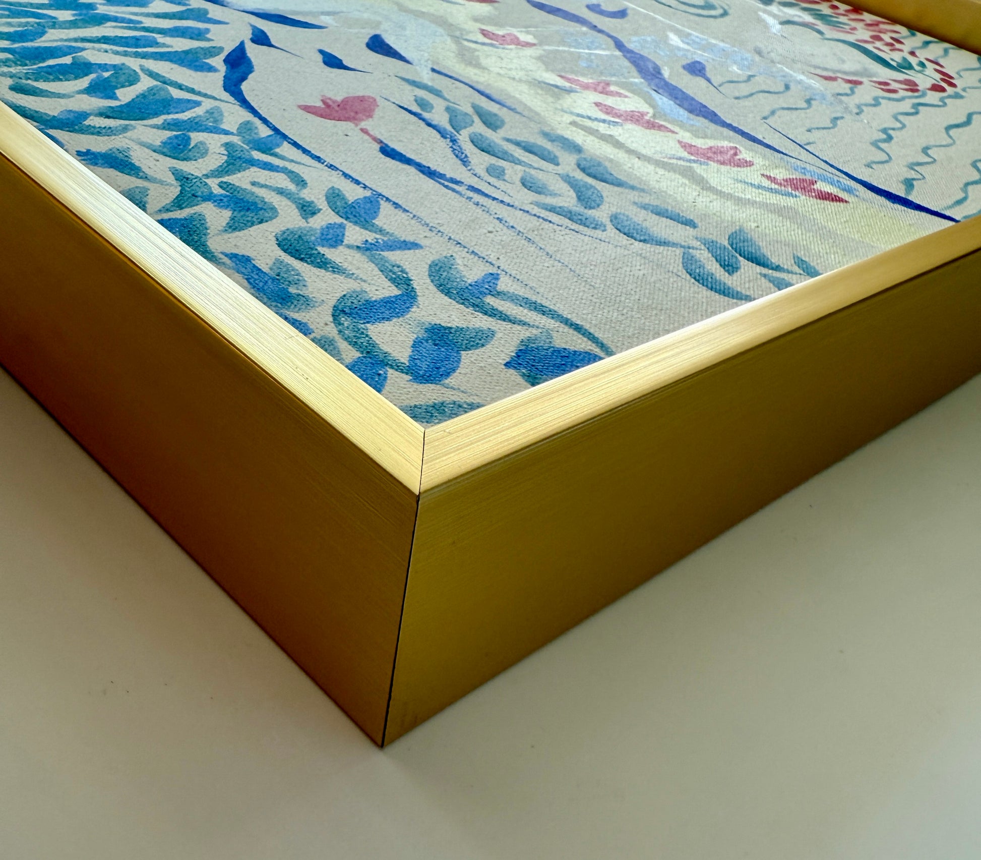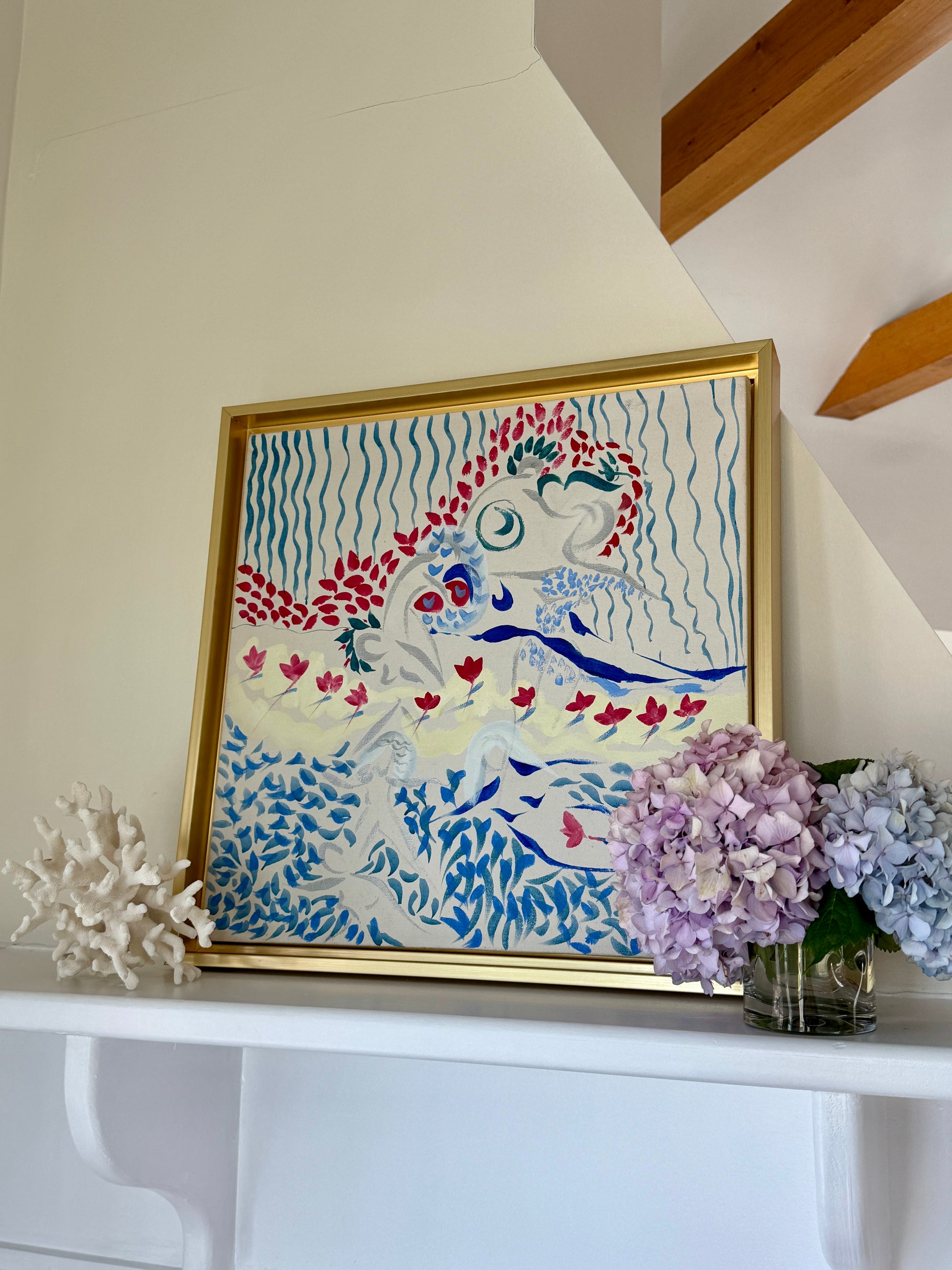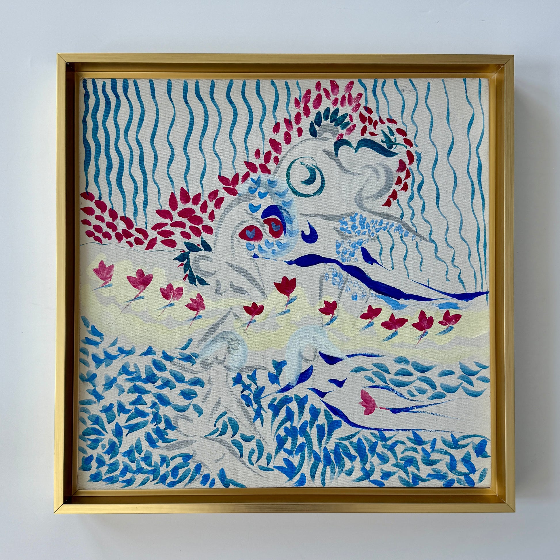 Eva Bouzard-Hui (American, 1936-2023) blue and red figural and floral abstract composition . This piece is unsigned, but came from the artist's New York City estate. Artwork in light gold floater frame measures 19.75" x 19.75". Artwork and frame in very good condition.