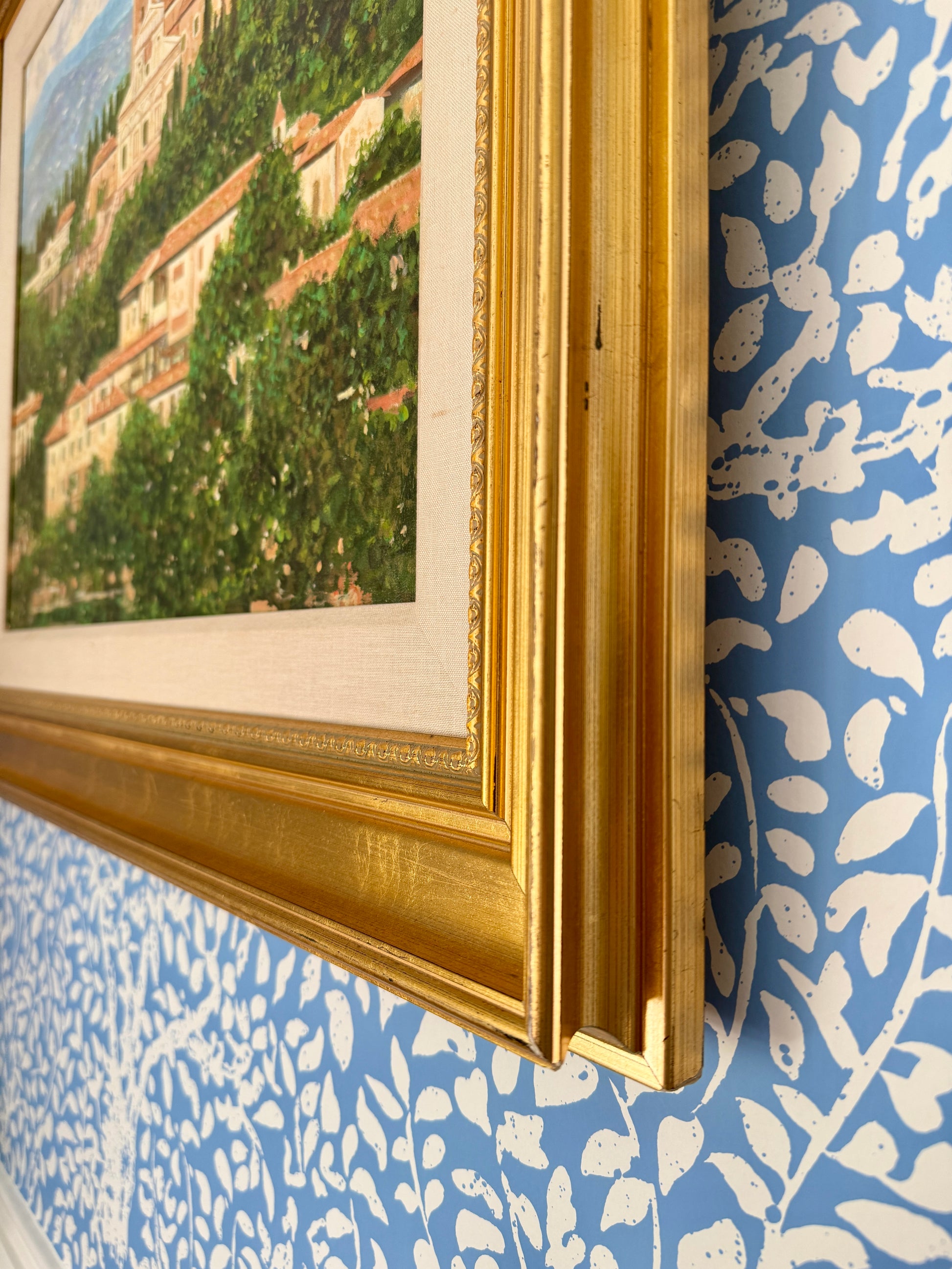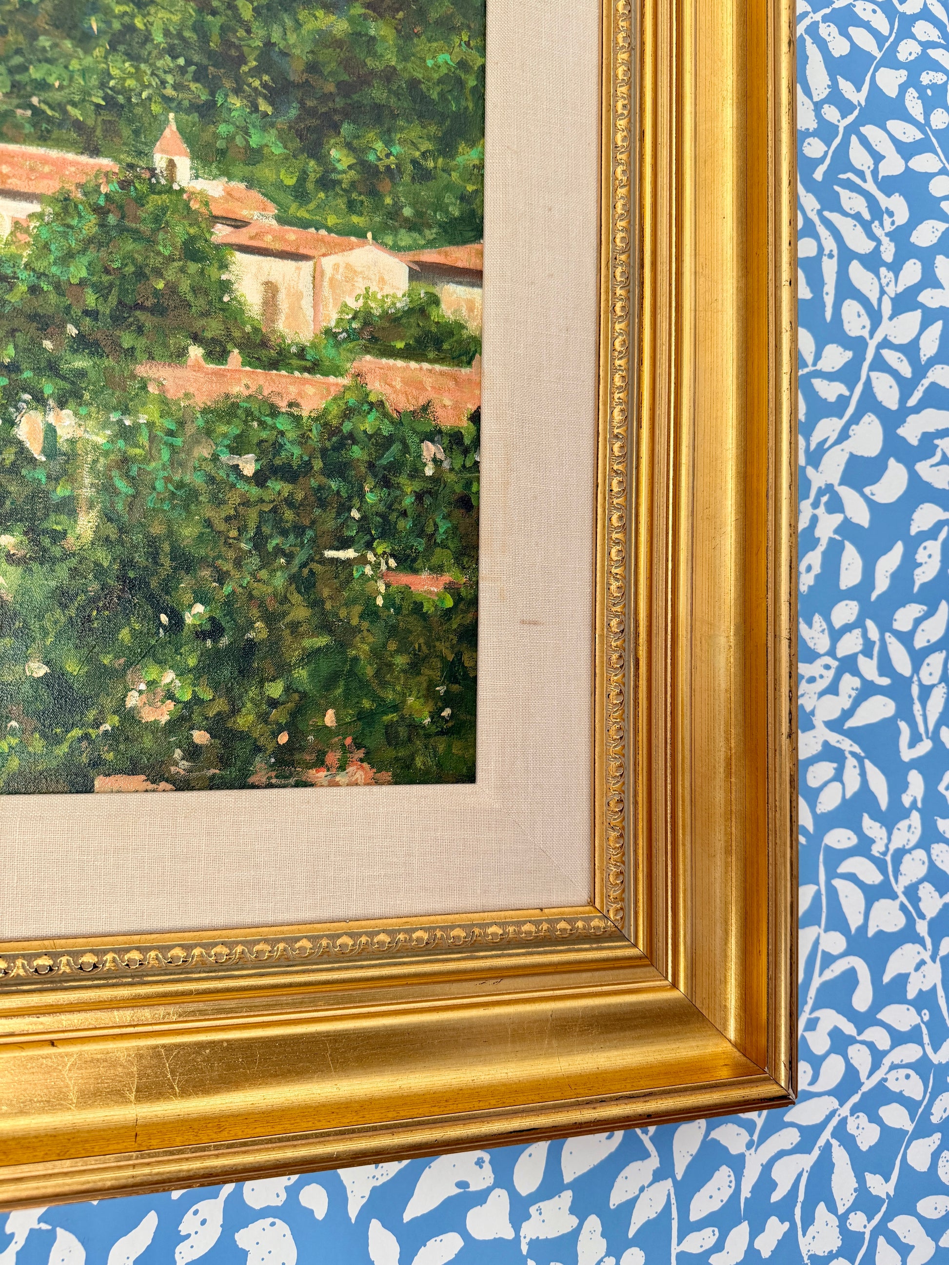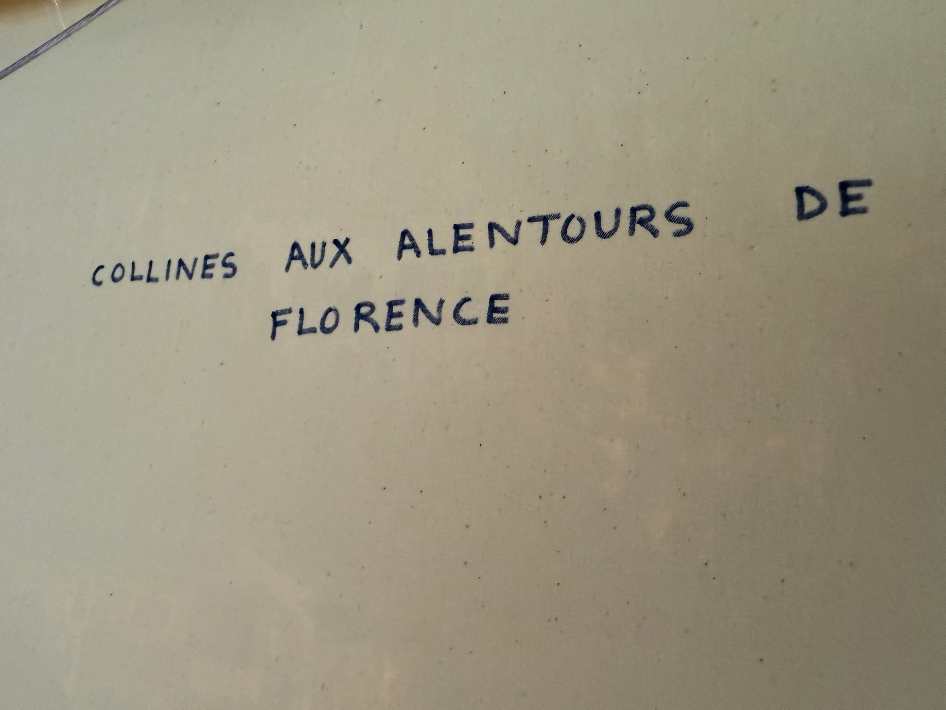 Francois Beaupre (French, b 1958) oil painting on canvas Tuscan Italian countryside landscape. Titled Collines aux Alentours de Florence. Signed on the reverse. Artwork in custom gold frame with thick linen liner measures 29.25" x 33.25". Artwork and frame in very good, vintage condition with light wear. Linen liner a few scattered age-related discolorations.