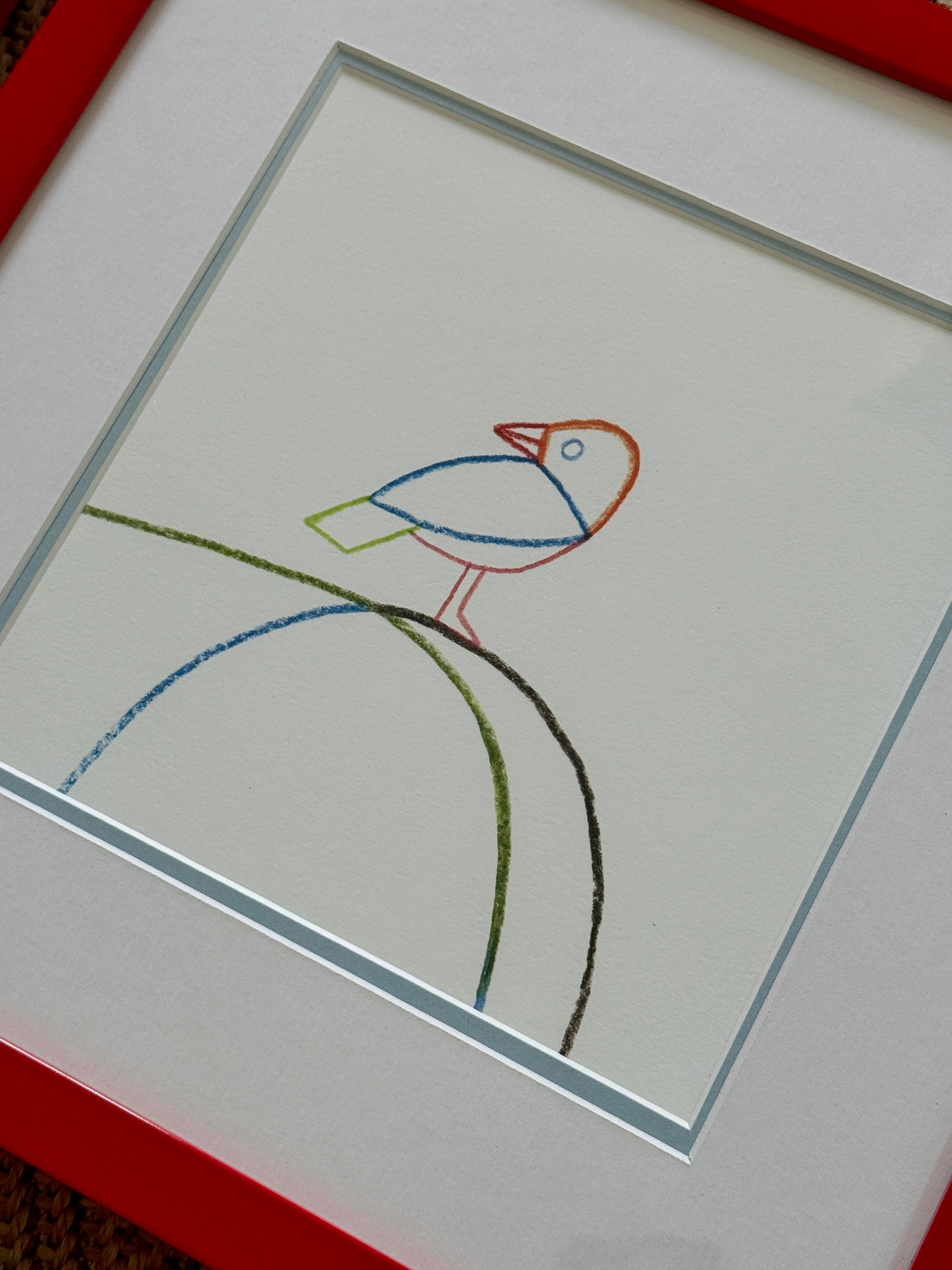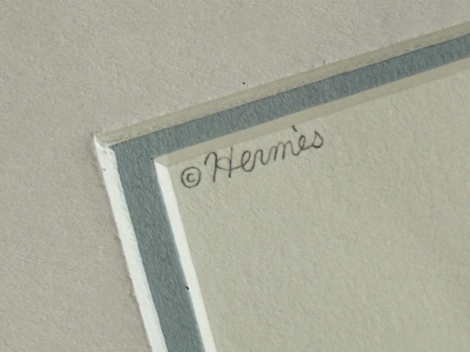 A set of four cards forming a quadptych of a horse on a skateboard, a bird riding on his rear created by Geoff McFetridge (Canadian, b. 1971) for Hermes. These cards were created for distribution to a small group of Hermes clients in the winter of 2025. Cards in red lacquered solid wood frames measure 13.25" x 13.25" each. Cards and frames in very good condition with light wear.