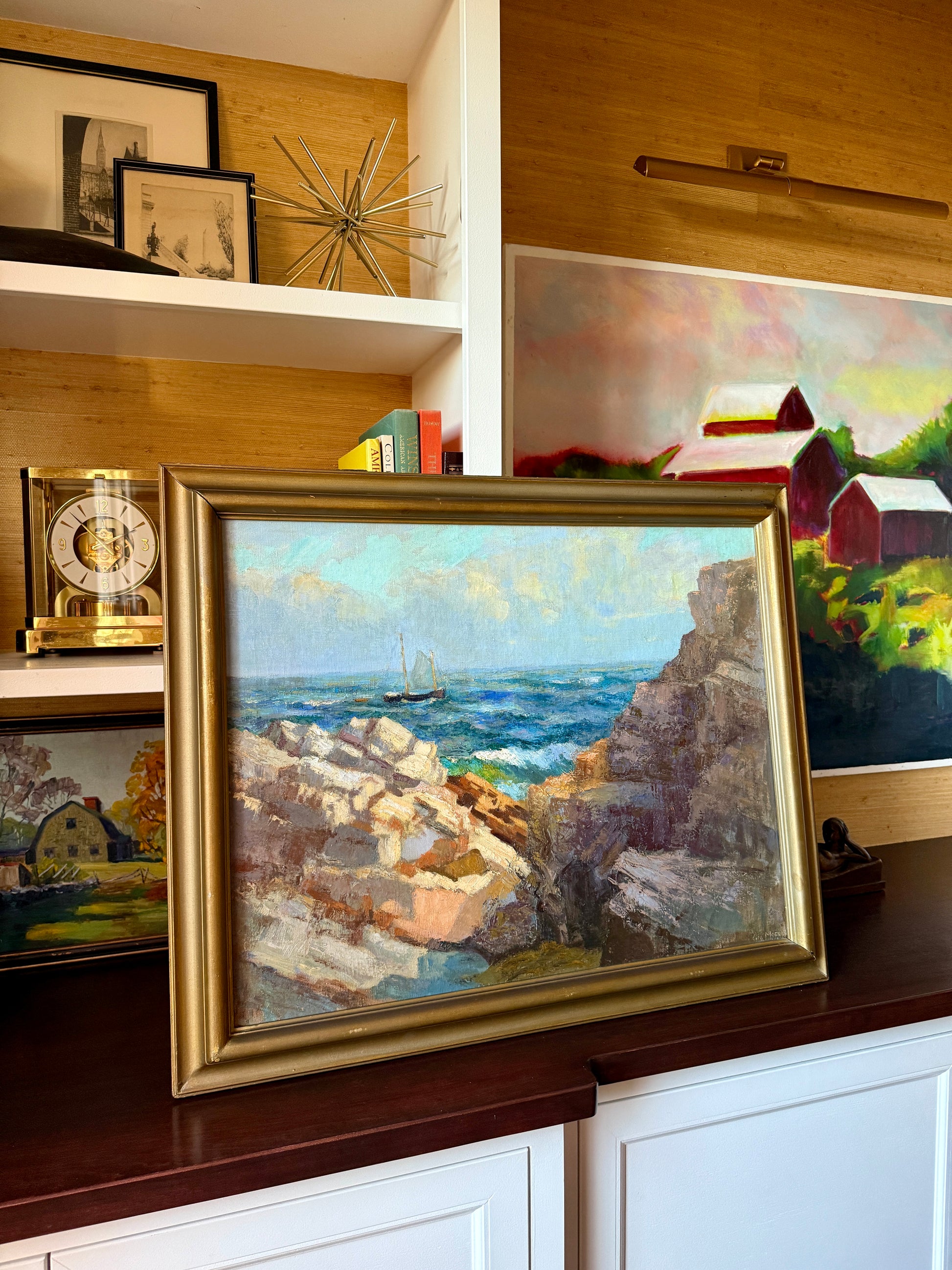 Early 20th century cliff-side seascape oil painting on canvas by George L. Morris (American / Maine, 1890-1983). Titled Cliffs in Sunlight (Cape Elizabeth, Maine) on the reverse. Bathed in luminous coastal light, this seascape captures the rugged beauty of New England’s rocky shoreline. Morris’s expressive brushwork highlights both the solidity of sunlit granite, and the restless energy of the sea beyond. A sailboat drifts quietly on the horizon, offering a moment of stillness against the dynamic movement of waves and clouds. Label from the Pennsylvania Art Conservatory also on the reverse. Artwork in original, gilded wood frame measures 26.25" x 32". Artwork in very good condition. Frame in good condition with age appropriate scattered light wear.