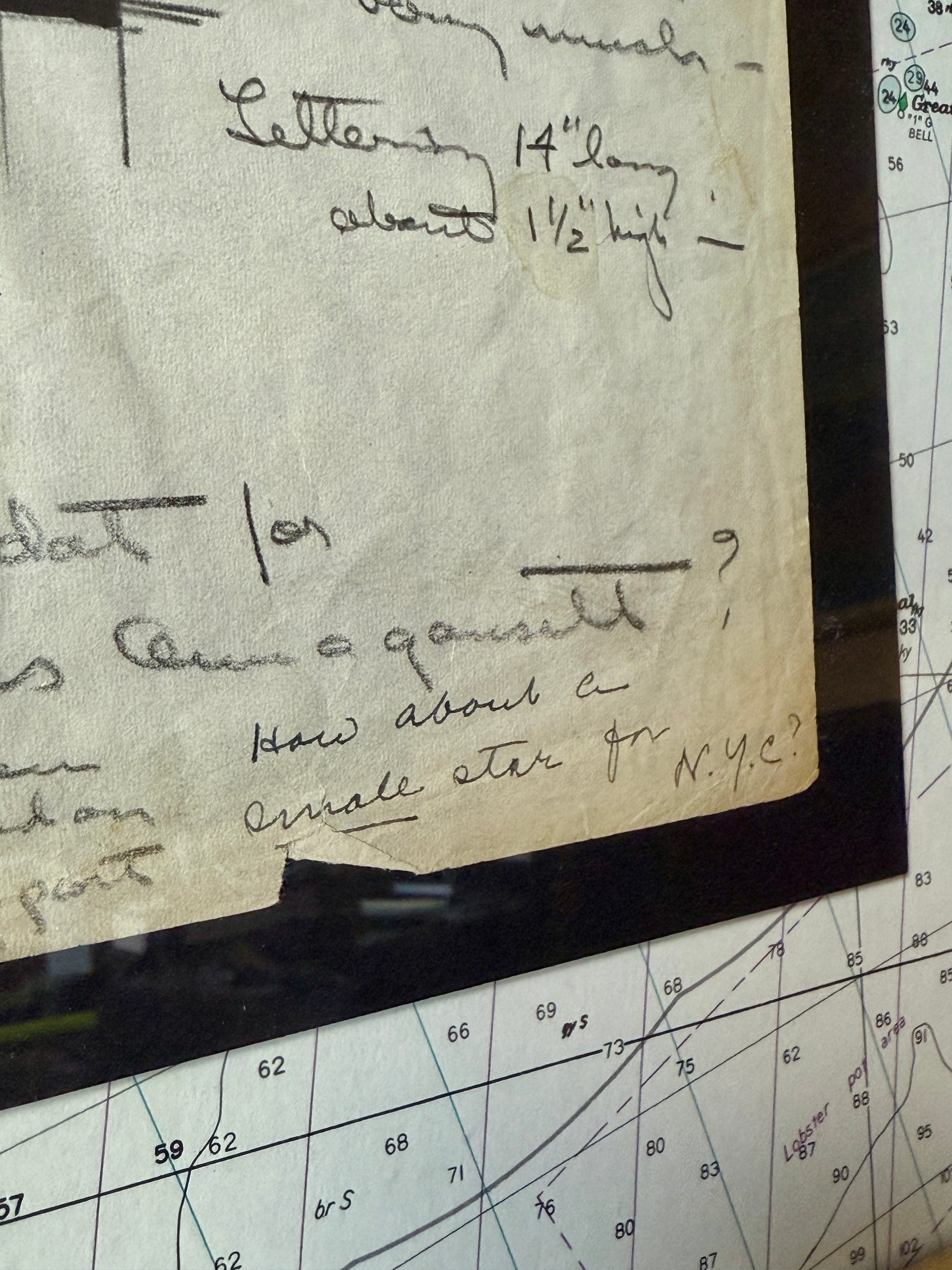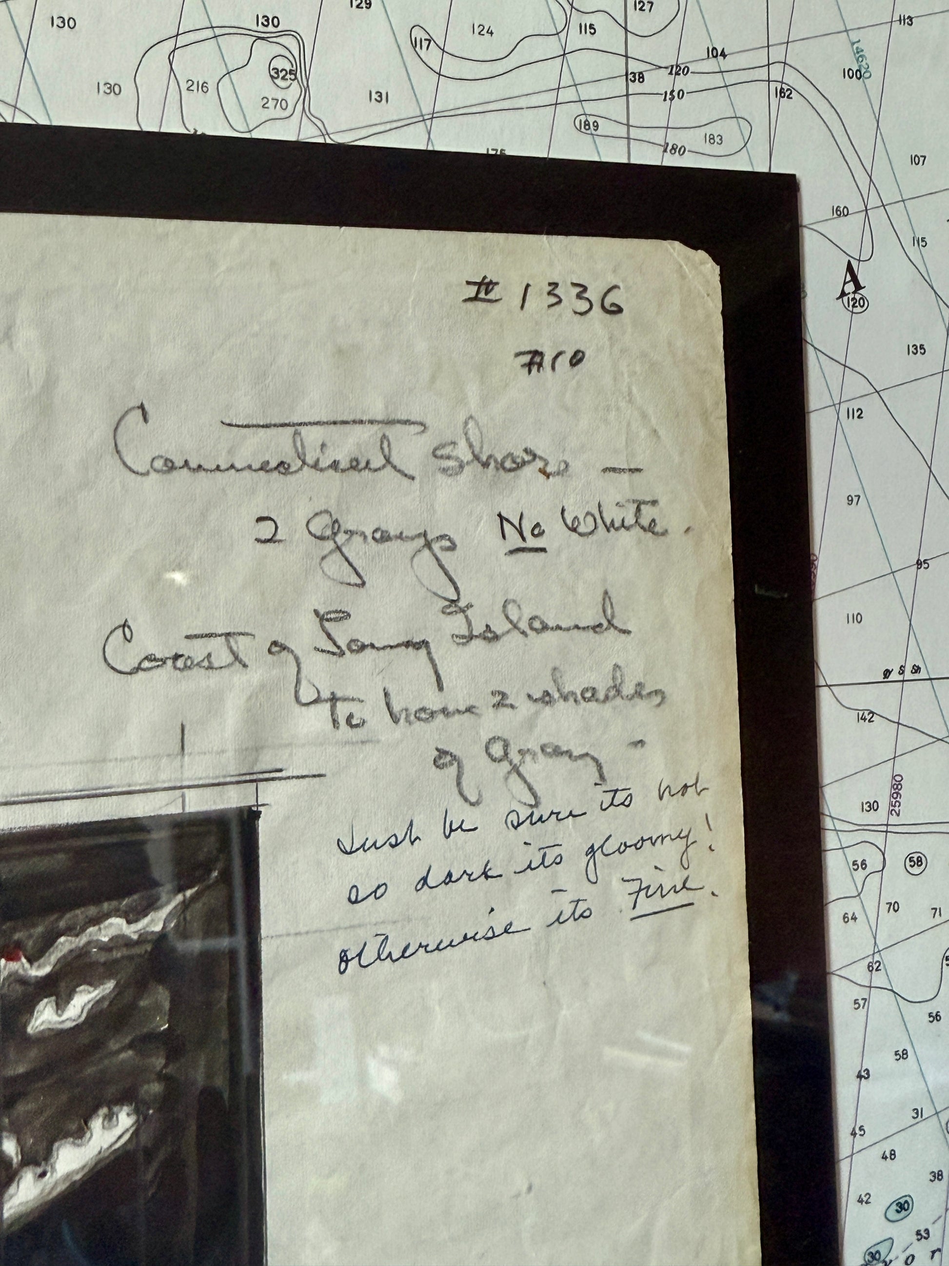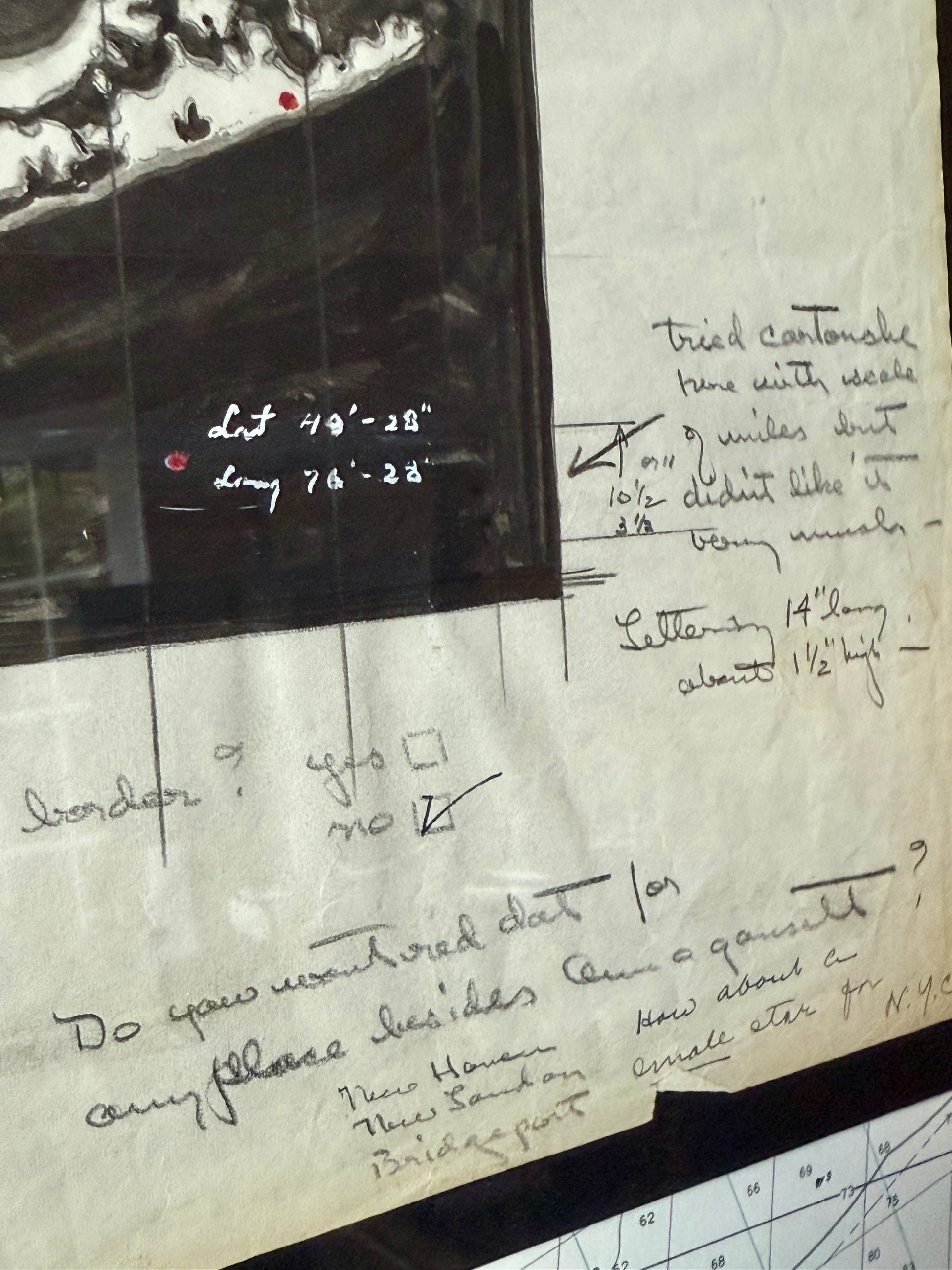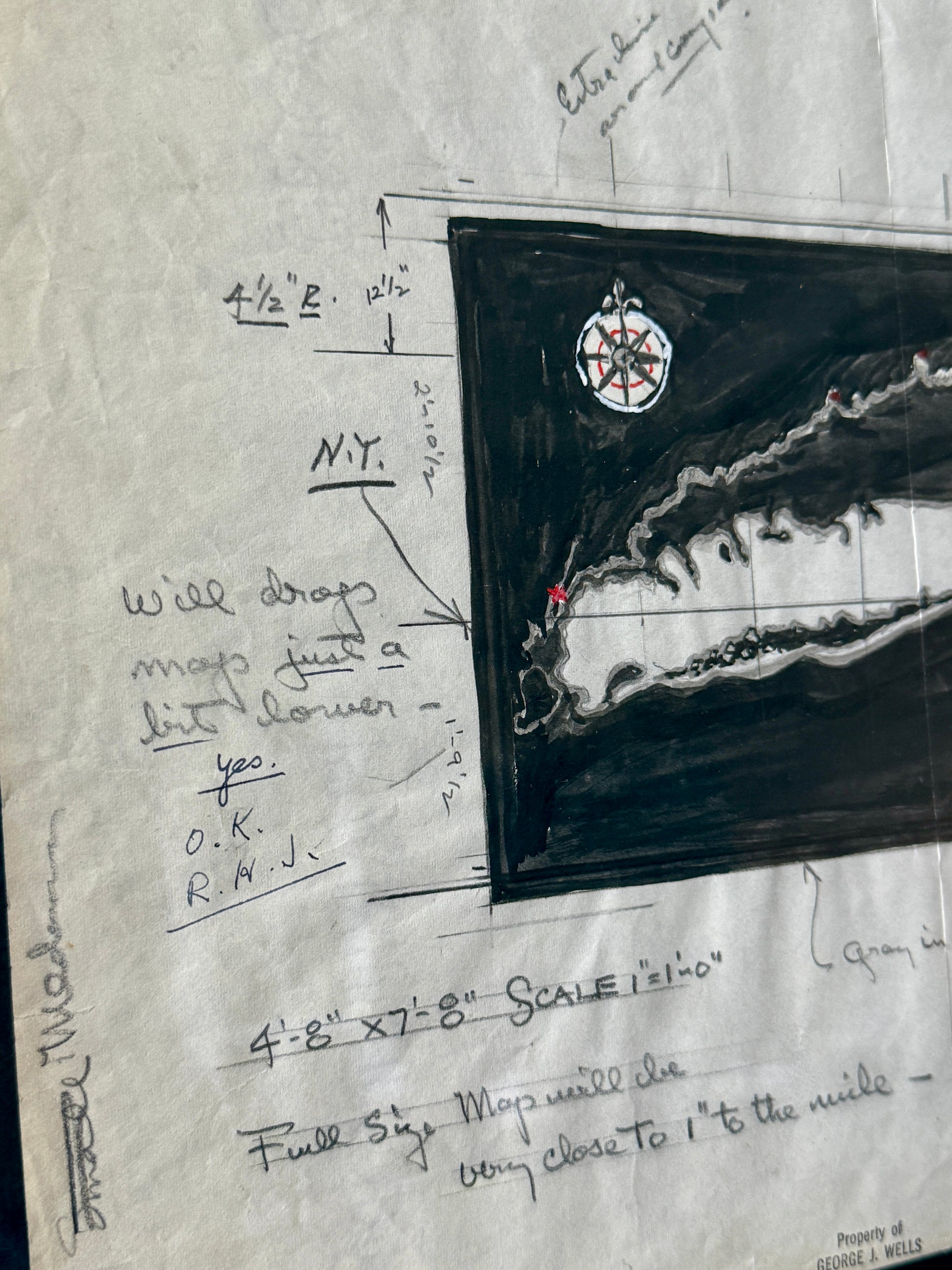 George Wells (American, -1988), acclaimed American rug designer, watercolor and pencil mockup of a custom rug of Long Island, NY with special notations made for New York City and Amagansett. Colorful notes surround the mockup. Artwork mounted on a vintage map of Long Island, NY in vintage gold frame measures 18.5" x 22.5". Artwork and frame in good, age appropriate condition.