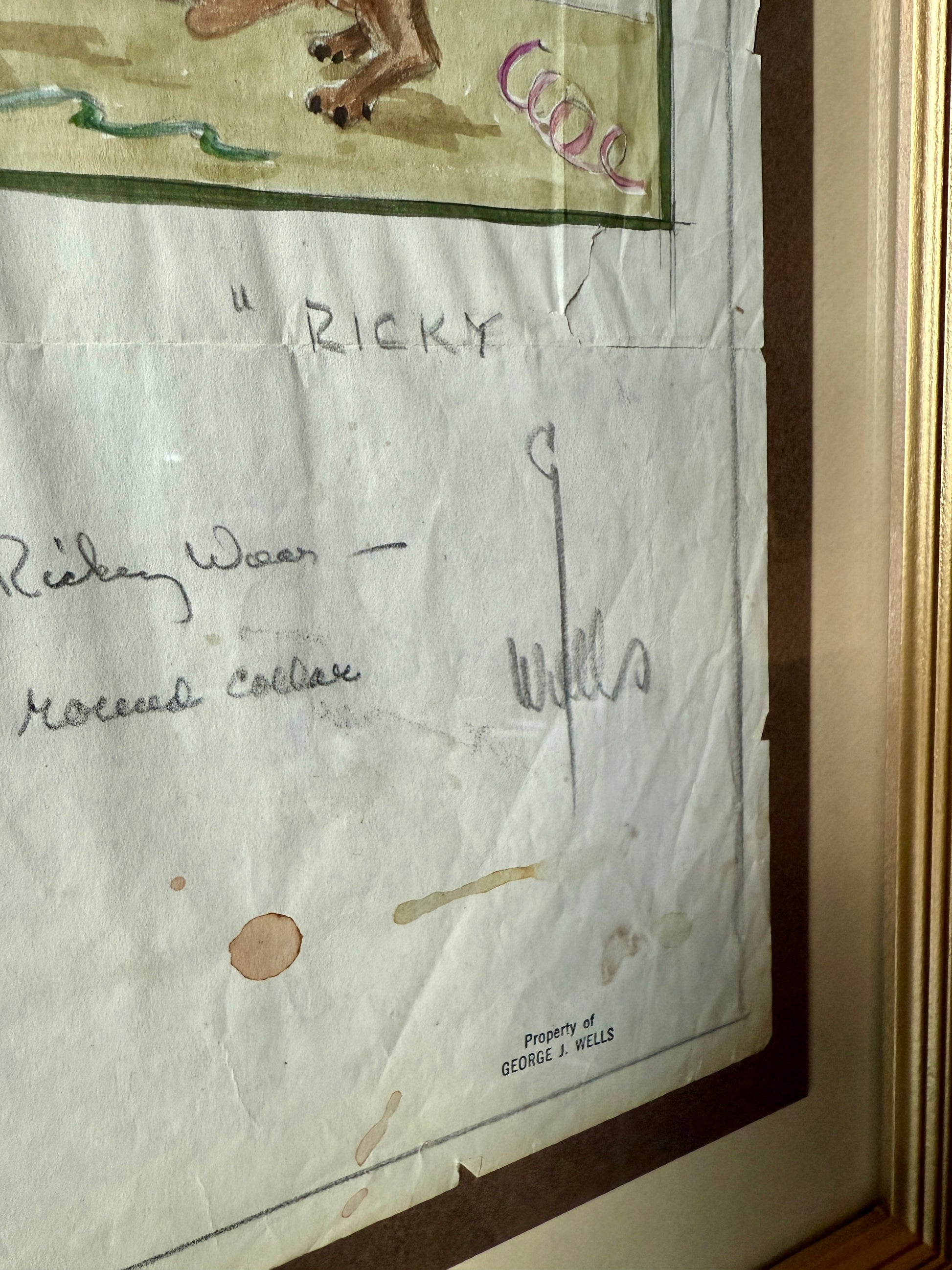 George Wells (American, -1988), acclaimed American rug designer, watercolor and pencil mockup of a rug featuring a dachshund named "Ricky" surrounded by birthday party paraphernalia. Notes indicate that Ricky is 20" long. Signed lower right. Artwork mounted on tobacco brown and tan in vintage gold frame measures 19.75" x 15.75". Artwork and frame in very good, age appropriate condition.