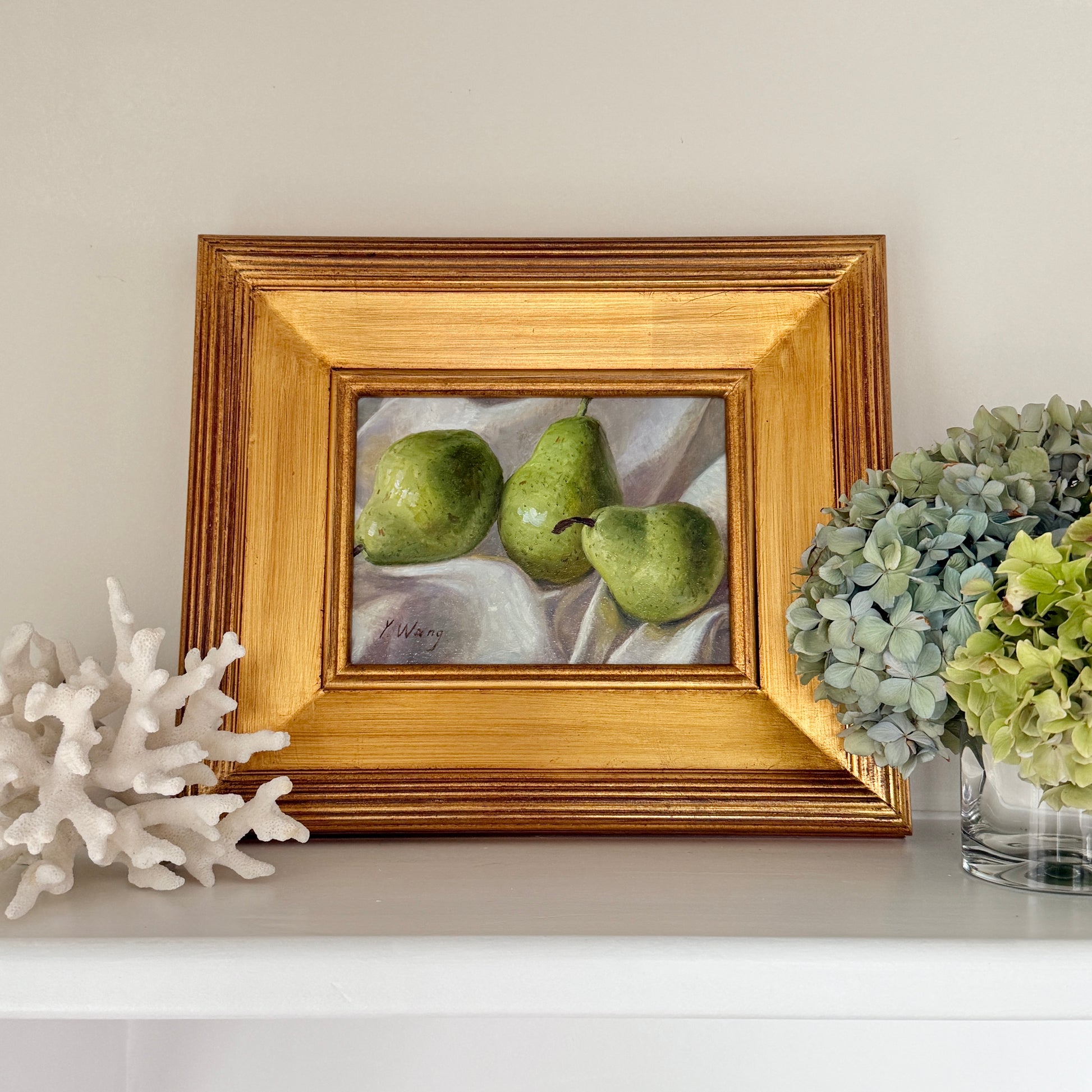 Green Pears on White Linen Still Life Oil Painting in Gold Frame