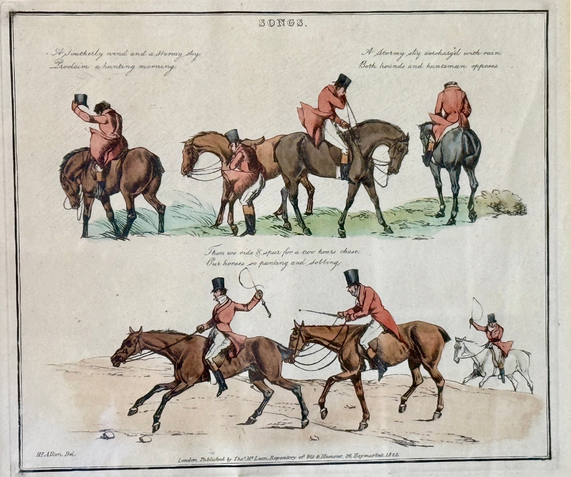 Henry Alken (British, 1785-1851) hand colored engraving from "Illustrations to Popular Songs" published by Thomas McLean, Repository of Wit & Humor, London 1822-24. Artwork in green grasscloth matting and custom gilded wood frame measures 16.25" x 17.5". Artwork and frame in very good age appropriate condition with light wear.