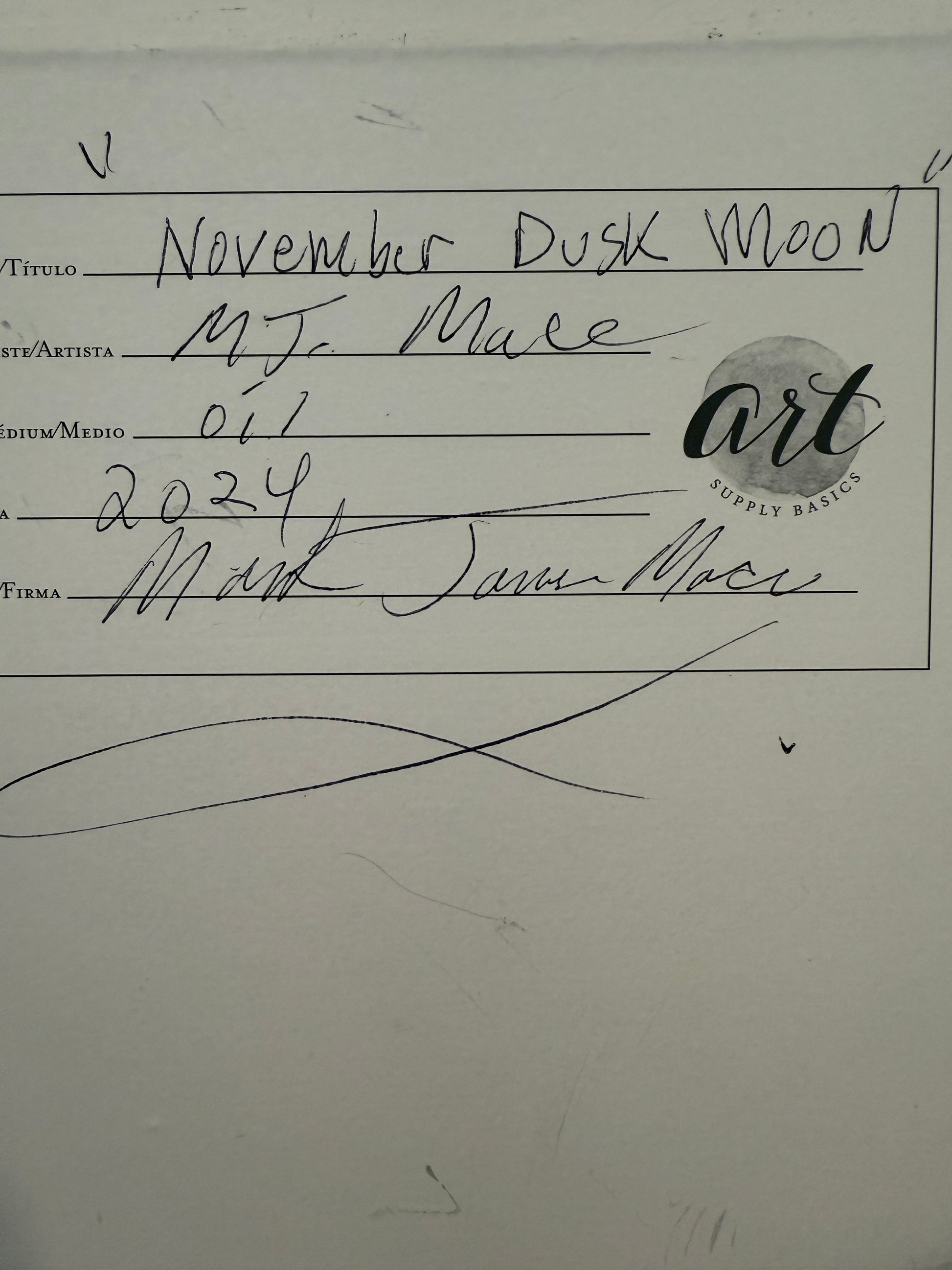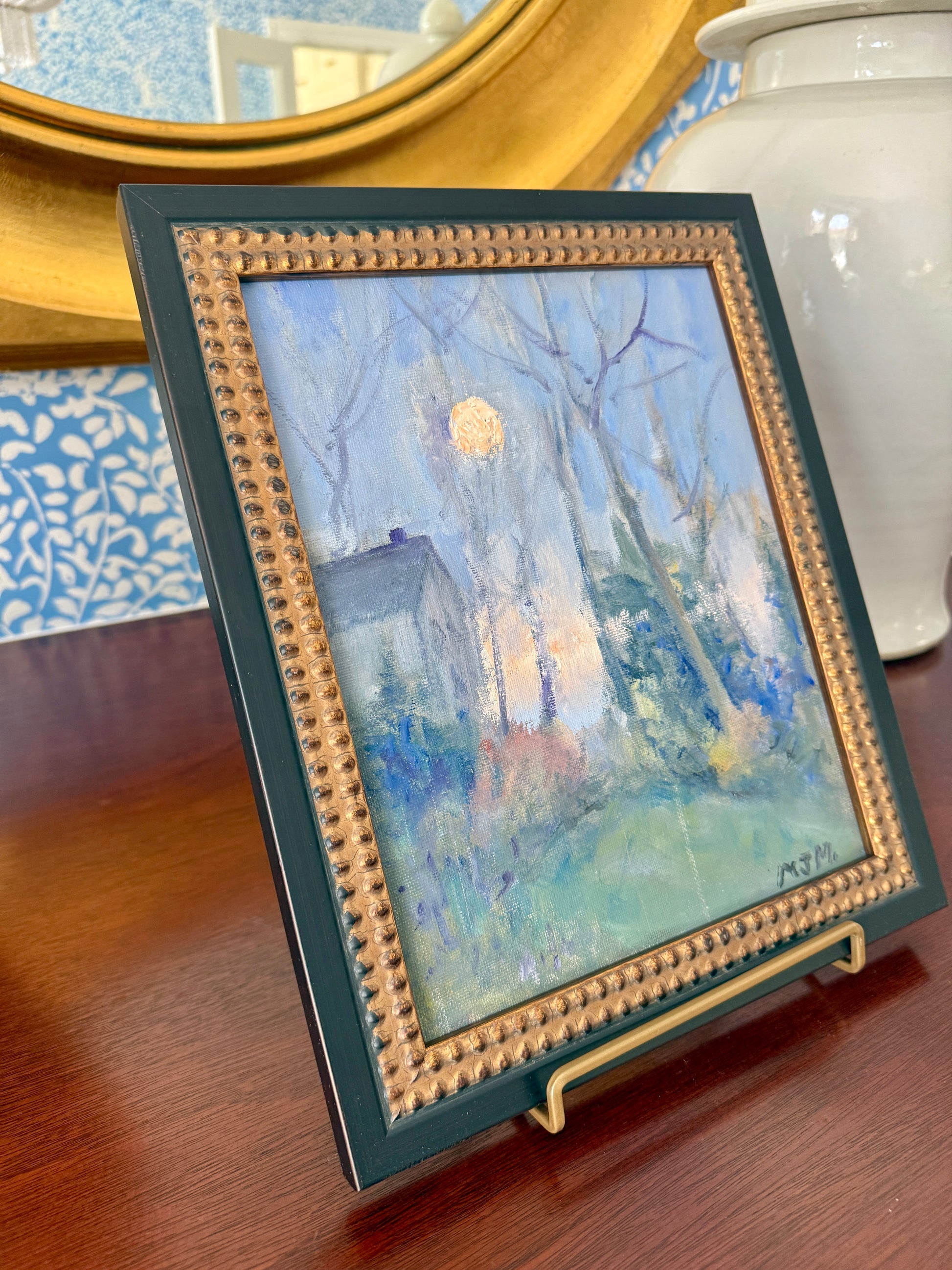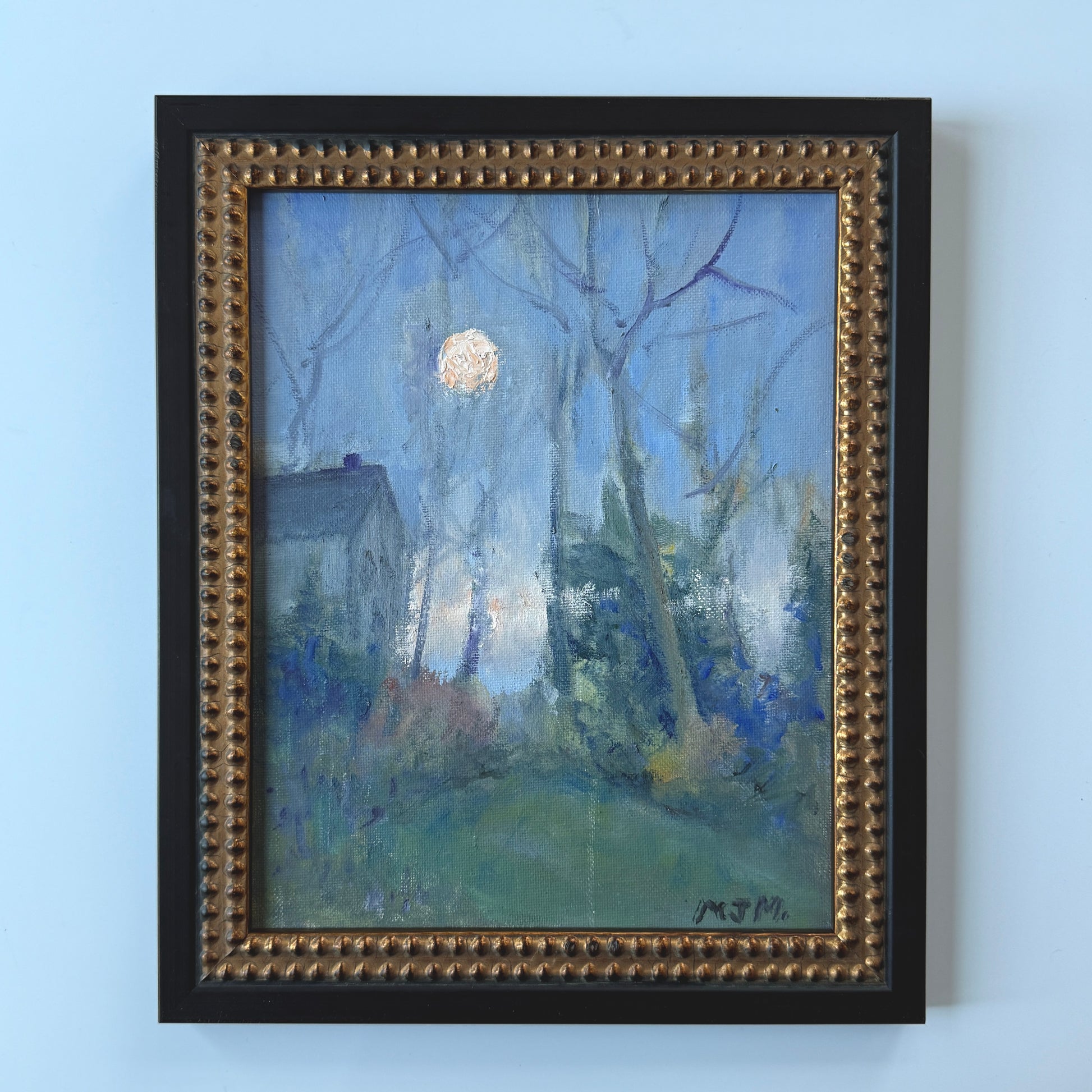 A contemporary impressionist oil painting on board of a moonlit landscape and house in Hudson Valley, NY. Artwork in black wood frame with gold beaded liner measures 12" x 10". Artwork and frame in very good condition.