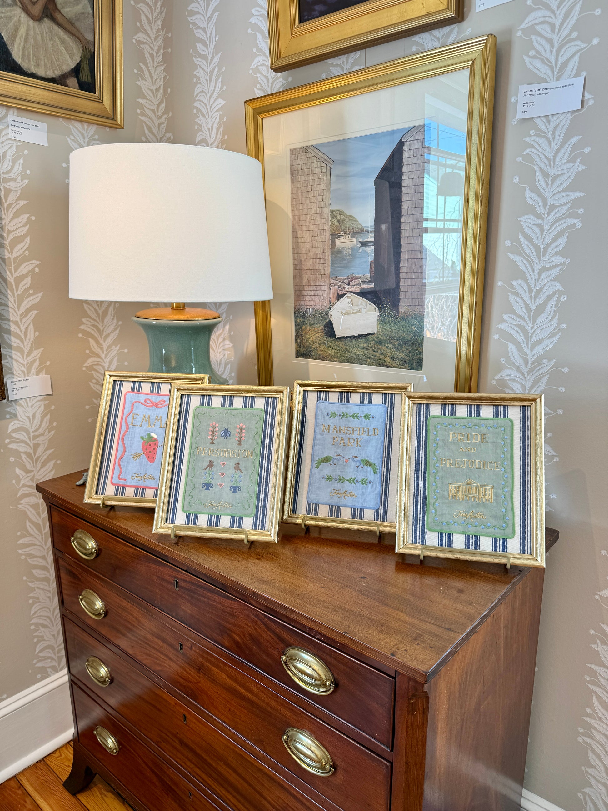 Jane Austen Novels Set of Four Emroidered Linen Books on Ivory and Navy Stripes in Gold Frames