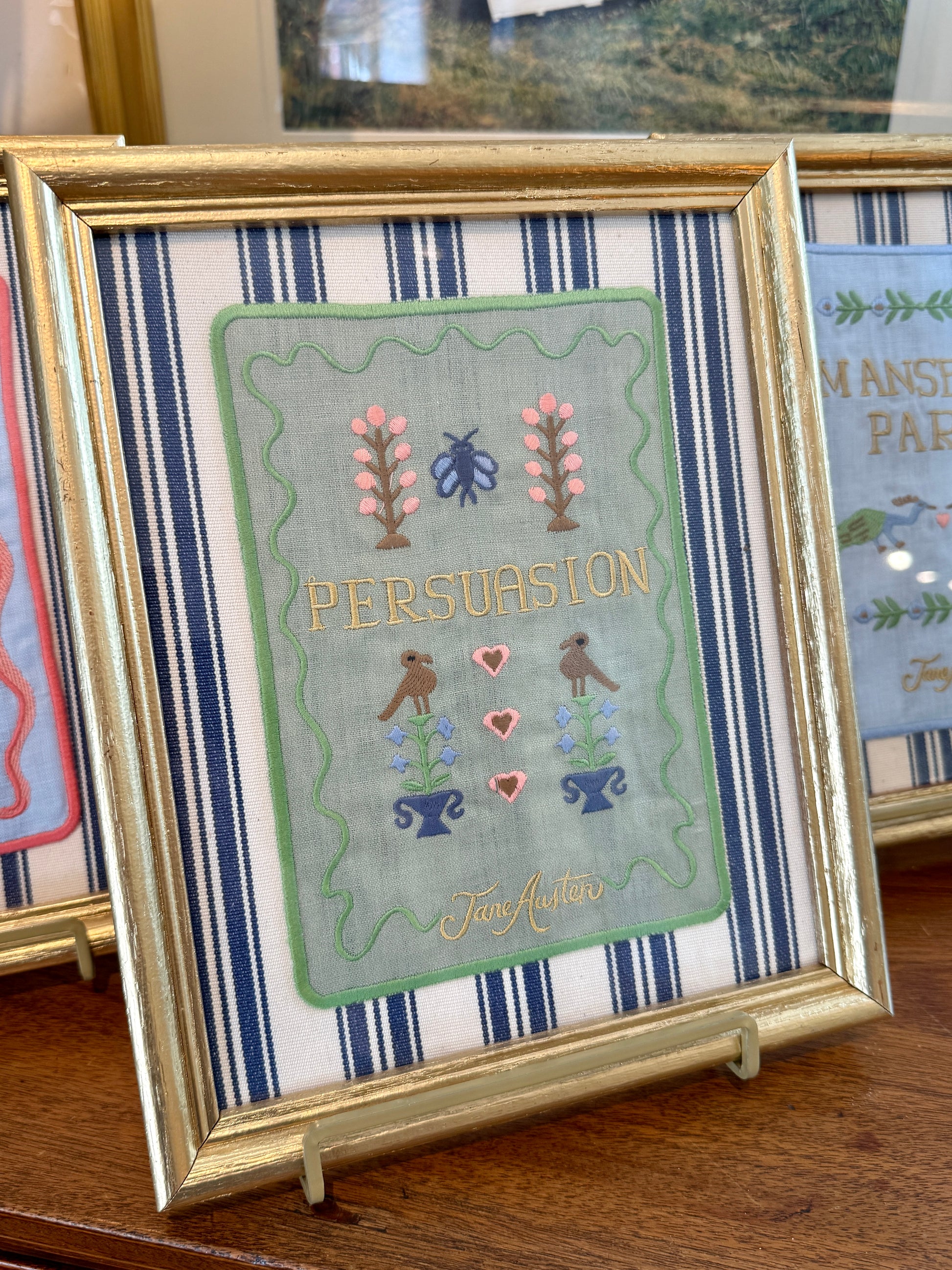 Set of four embroidered linen Jane Austen book covers to include: Pride and Prejudice, Emma, Persuasion and Mansfield Park. Each is mounted on ivory and navy striped fabric, and framed in a vintage gold finished wood frame measuring approximately 11.25" x 9.25". Textiles and frames in very good condition.
