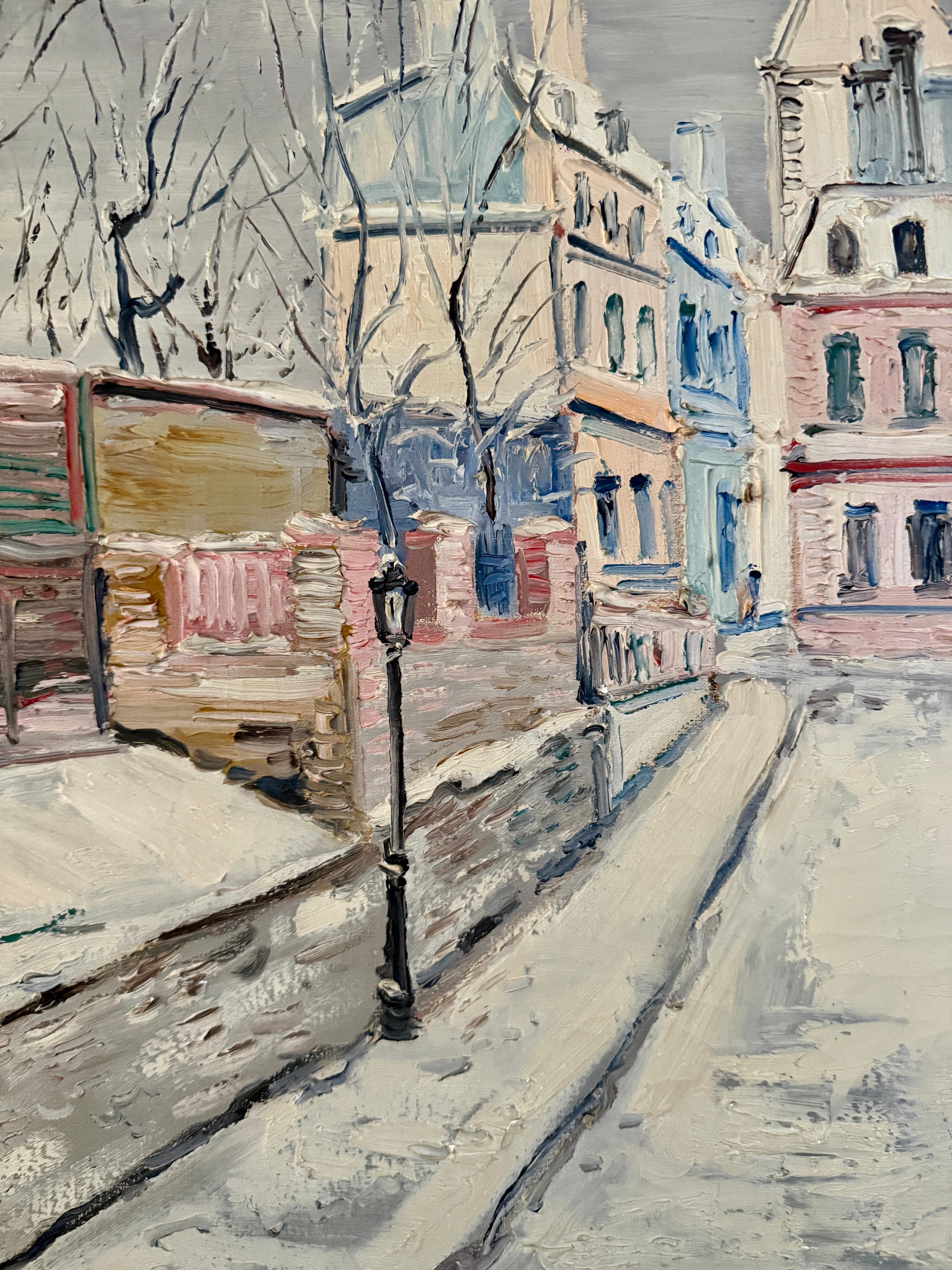 Johannes Schiefer (French, 1896-1979) heavily textured oil painting on canvas of a snow-covered Montmarte, a historic Parisian district on a hill in the 18th arrondissement. A couple's footprints peppering the sidewalk. This piece is a classic example of Schiefer's signature work. Artwork in contemporary gold wood frame measures 23.5" x 29.5". Artwork and frame in very good condition.