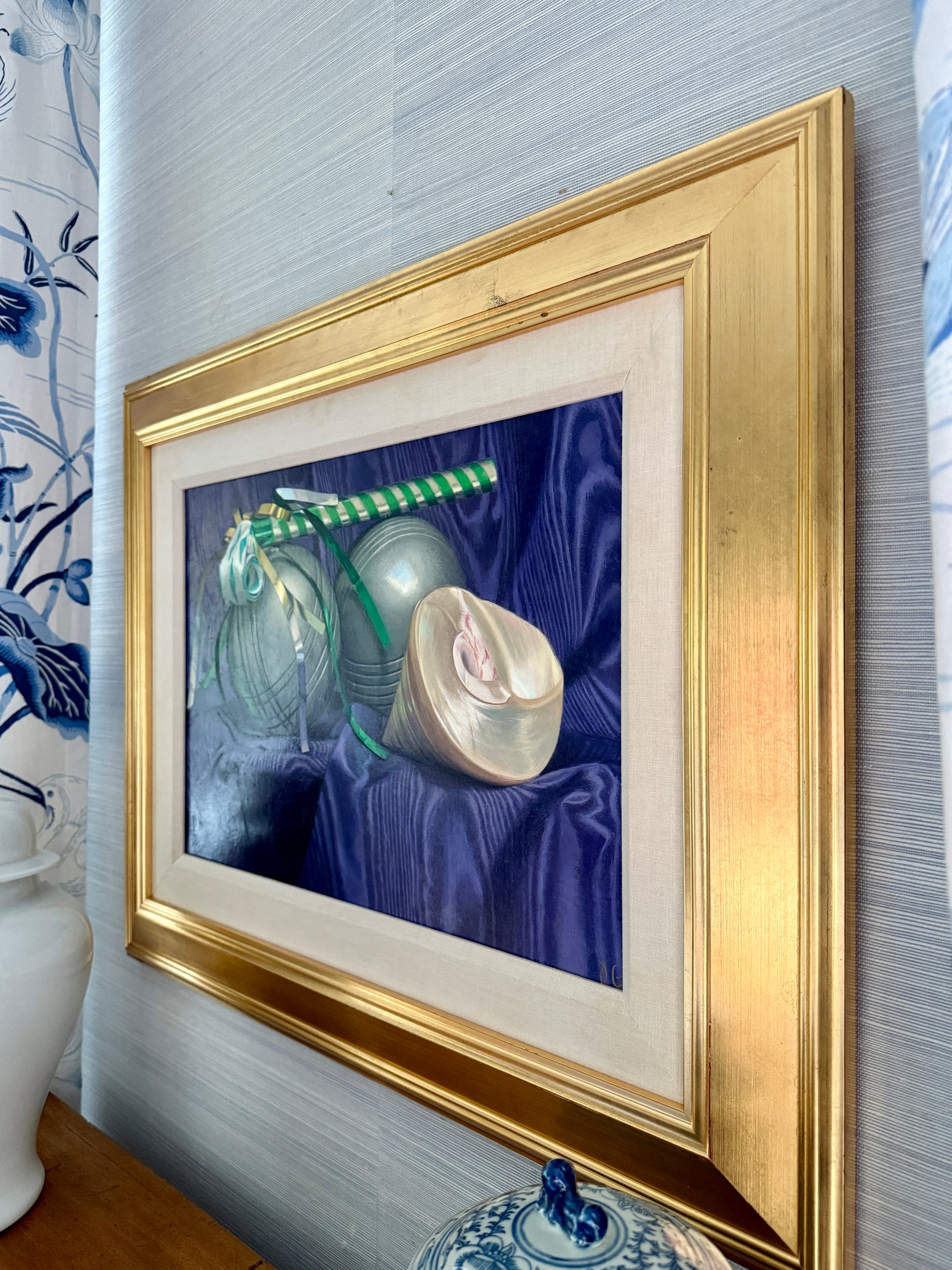 Judith Goldsmith Barcarolle Still Life of Bocce and Shell Oil Painting in Gold Frame