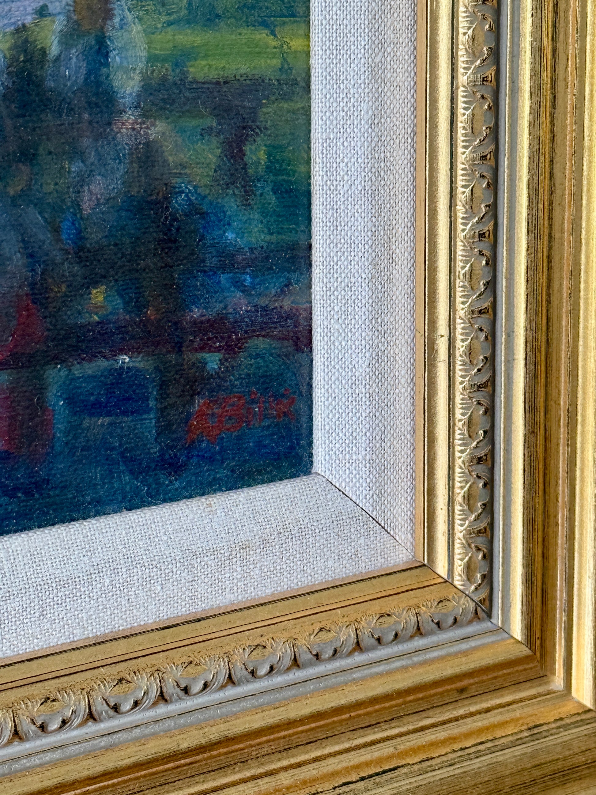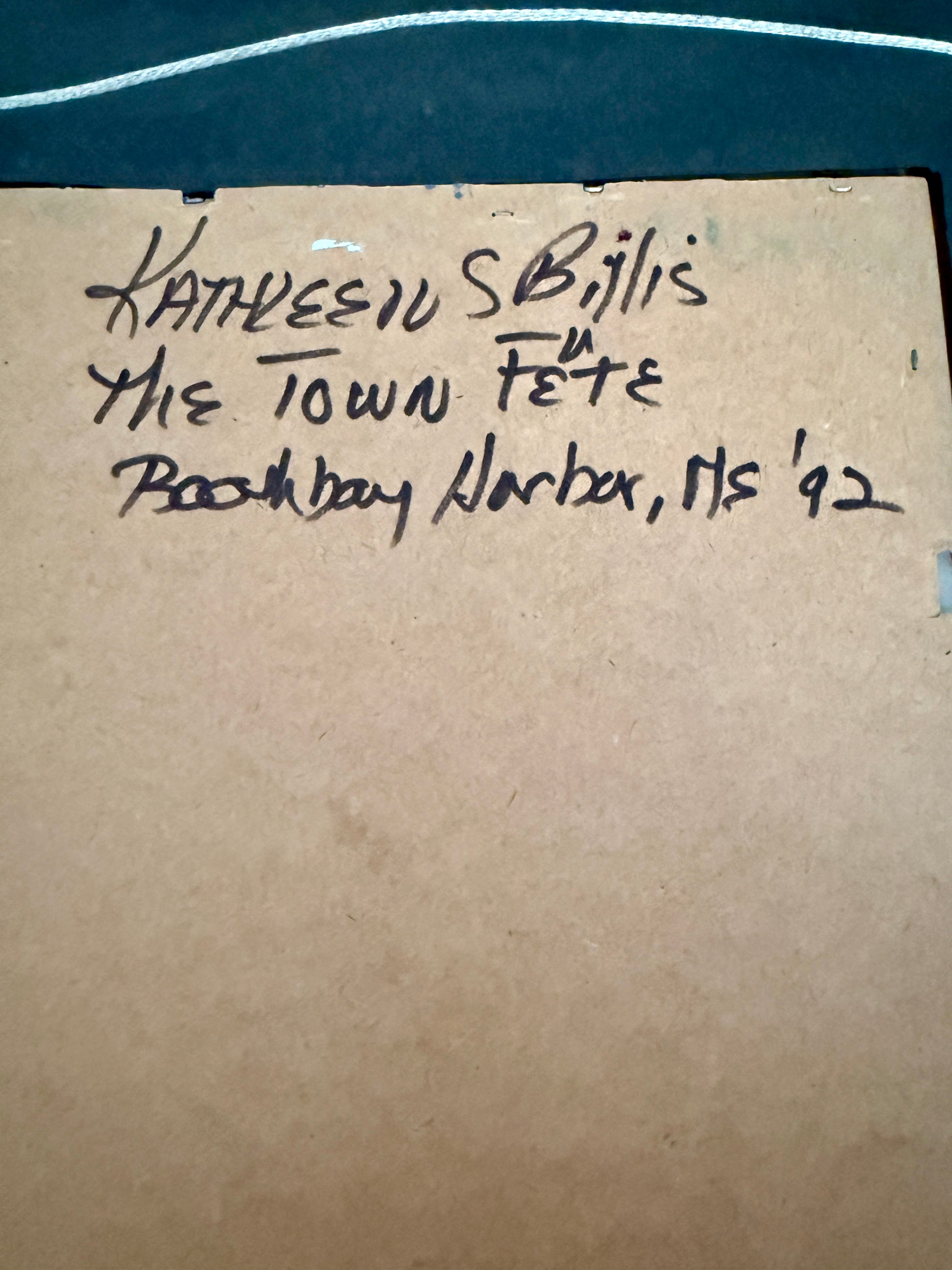 Kathleen Billis (American / Maine, 20th century) oil on panel painting titled The Towne Fete depicting a moonlit local Maine carnival. Artwork in custom gold frame with linen liner measures 17" x 14.5". Artwork and frame in very good condition.
