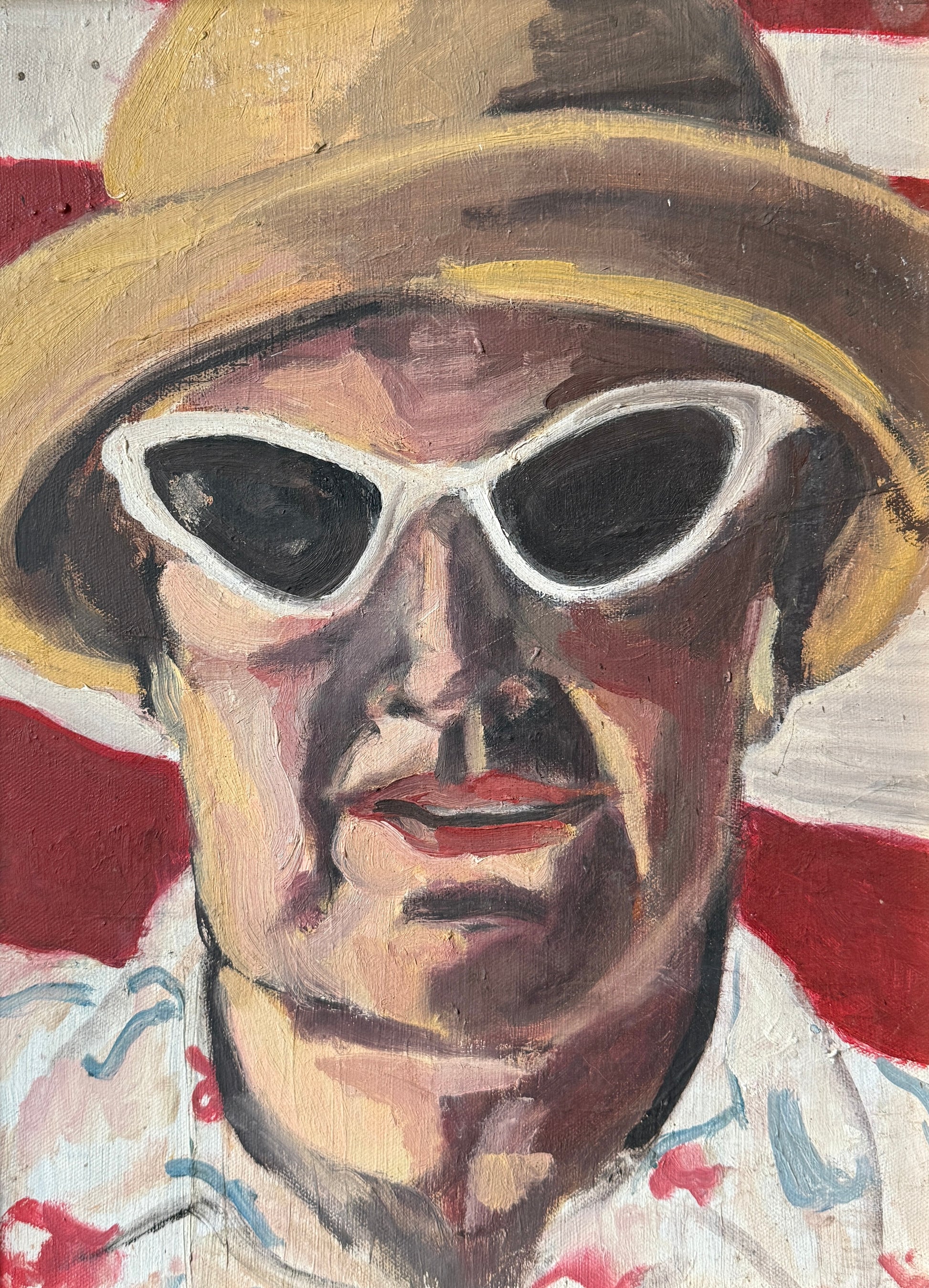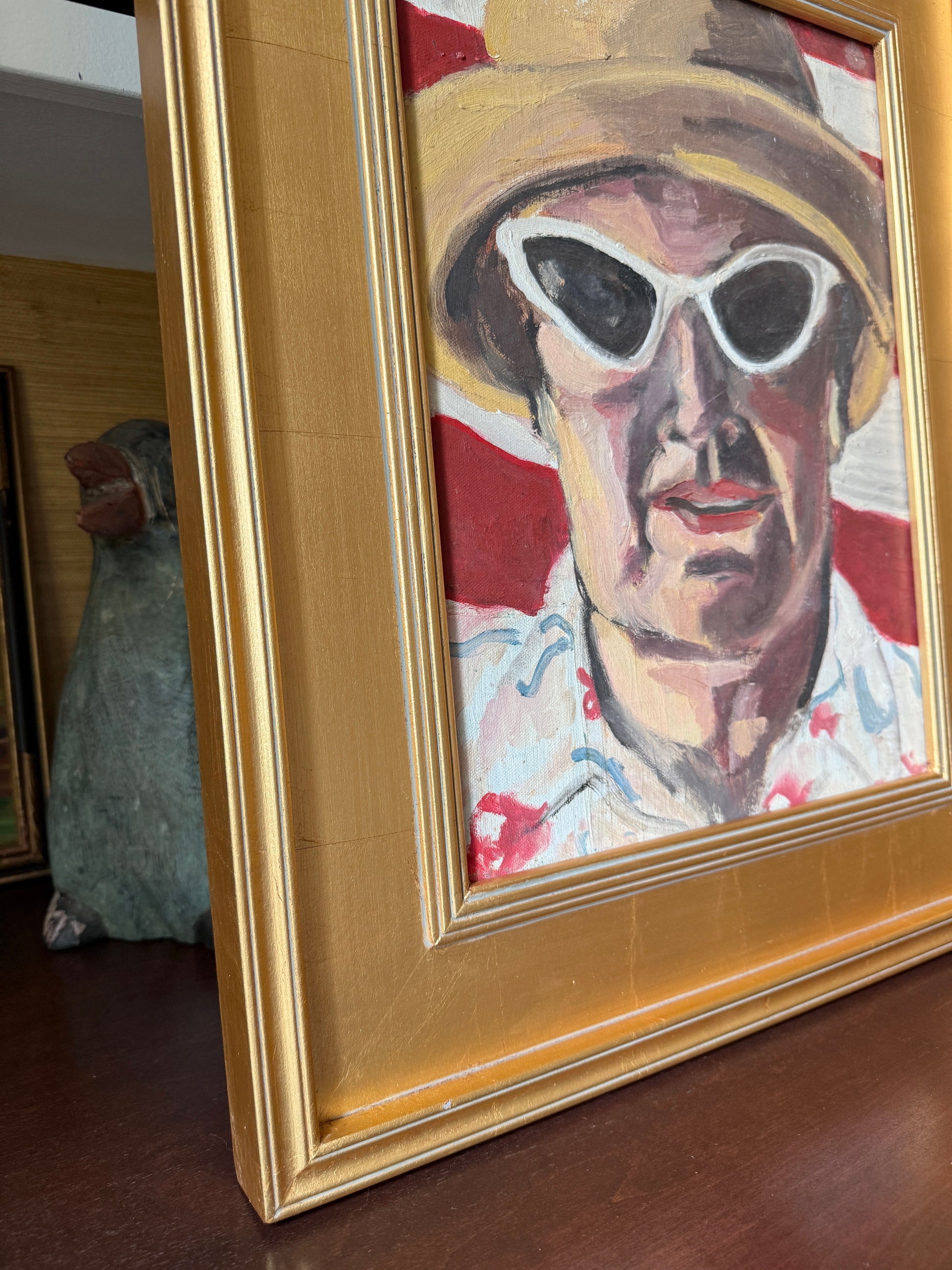 A vintage oil painting on canvas portrait of a confident woman in white cat-eyed sunglasses and red lipstick in front of an American flag. Sourced in Woodstock, NY. Artwork in contemporary gold wood frame measures 22.75" x 18.75". Artwork in very good, vintage condition. Frame in very good condition. Coordinating portrait shown in photos is available in a separate listing.