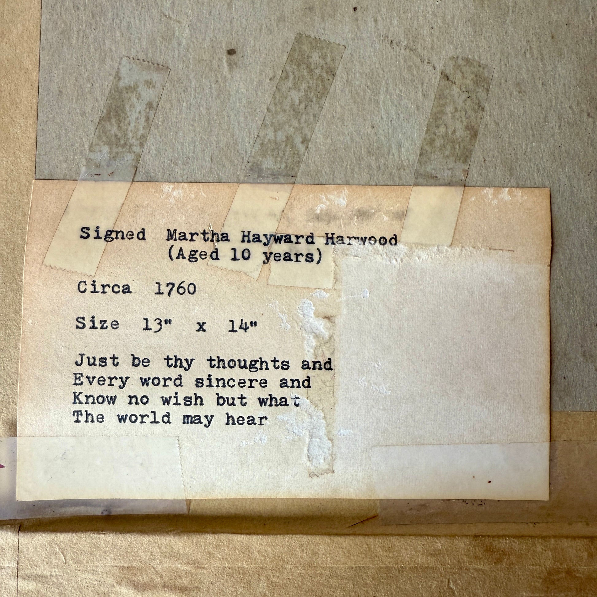 Late 18th / early 19th century detail-filled English silk on linen sampler wrought by Martha Hayward Harwood (age 10). Featuring cats, dogs, birds and florals. Sampler in thick, 19th century wood frame measures 17.5" x 16.75". Sampler in good condition with scattered, age appropriate wear including a few scatterd losses. Frame in good overall, antique condition with light chipping.