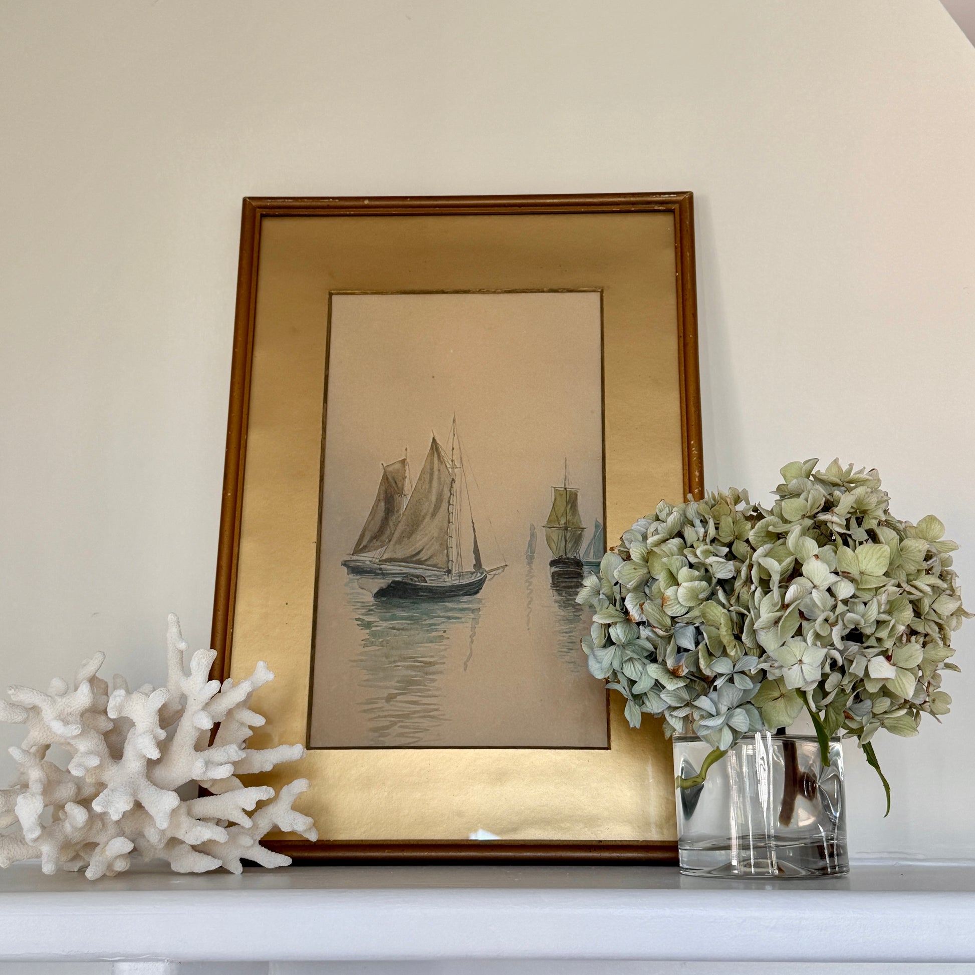 Early 20th Century Antique Sailboats in Seascape Watercolor Painting in Gilded Frame