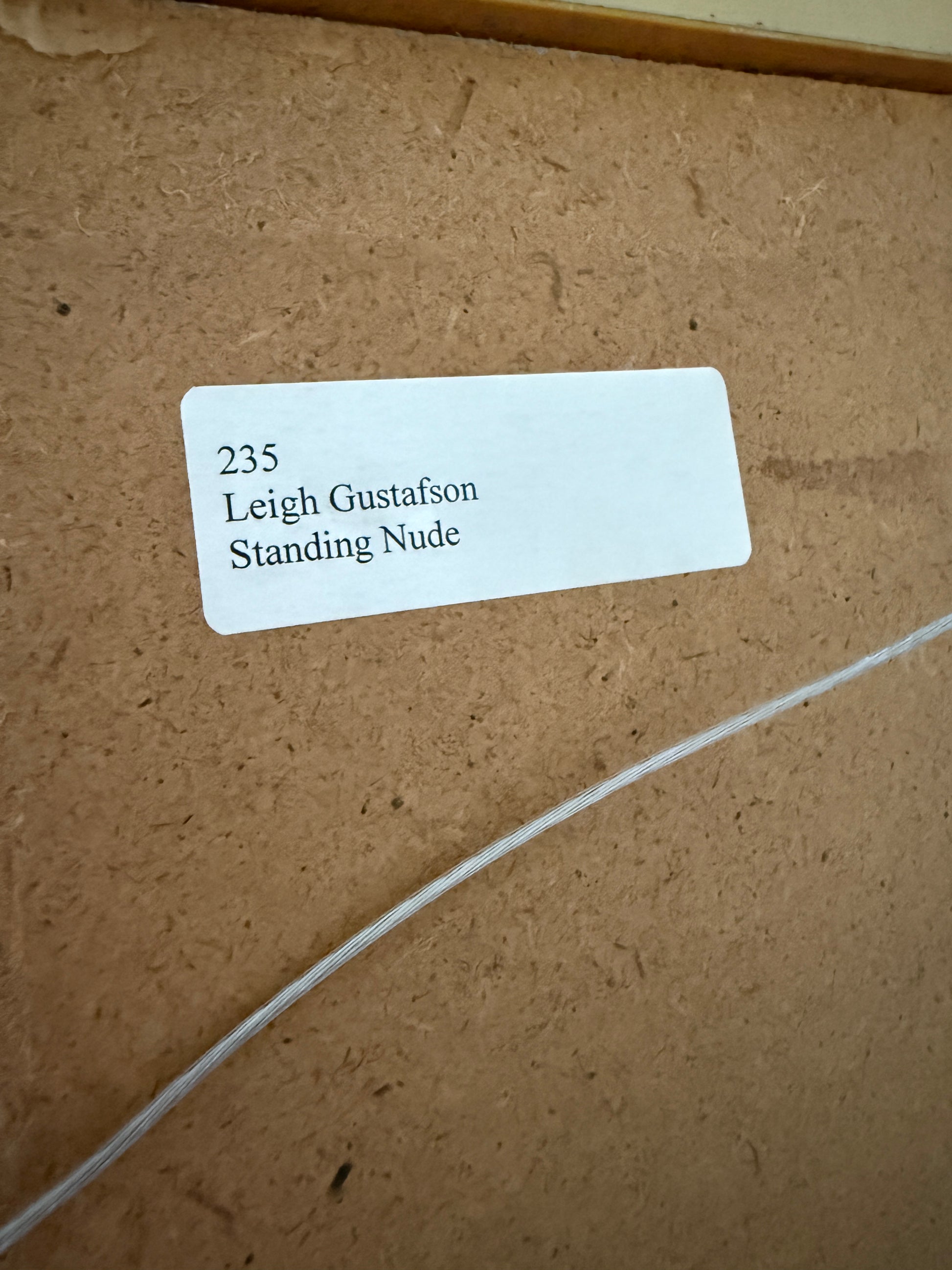 Leigh Gustafson (American / Pennsylvania, 20th century) beautifully executed expressive nude female portrait oil painting on board. Gustafson studied at the Pennsylvania Academy of Fine Arts. Dated 1996 on reverse. Artwork in custom, ornately detailed gold frame measures 22" x 16.25". Artwork and frame in very good condition.