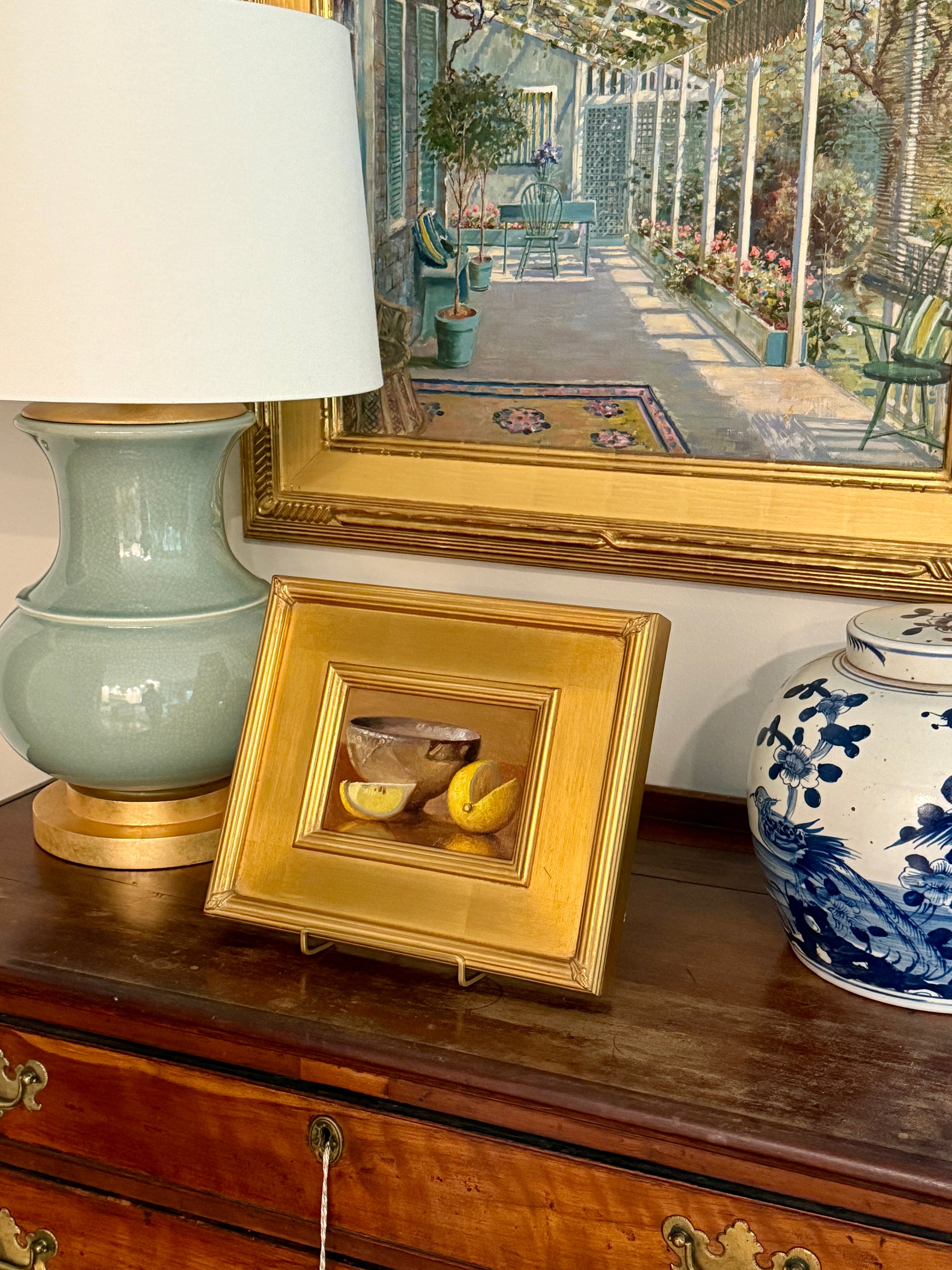 Lemon Slices and Pottery Bowl Still Life Oil Painting in Gold Frame