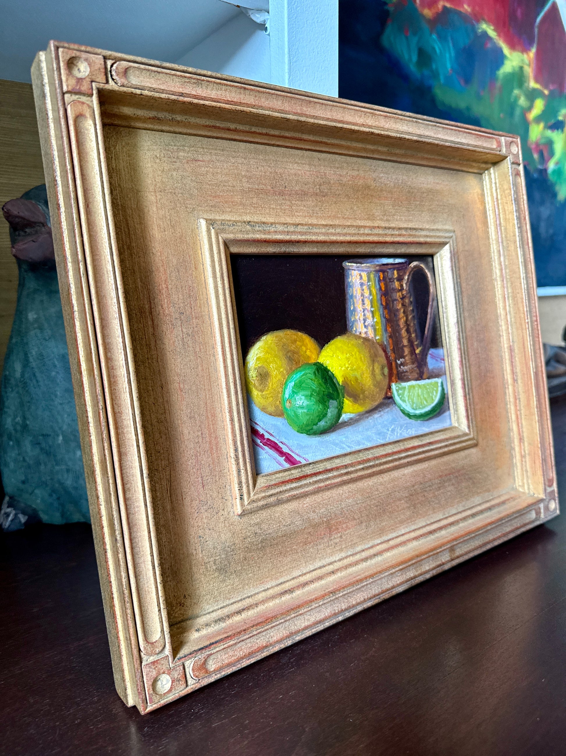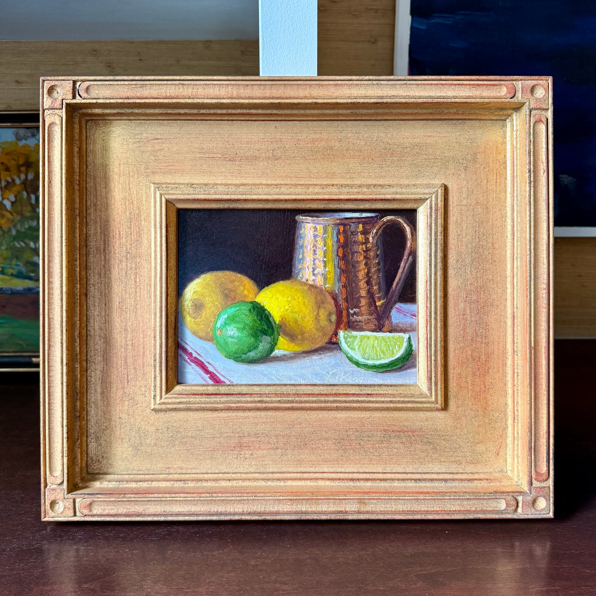 Lemons and Limes with Copper Mug Realist Still Life Oil Painting in Gold Frame