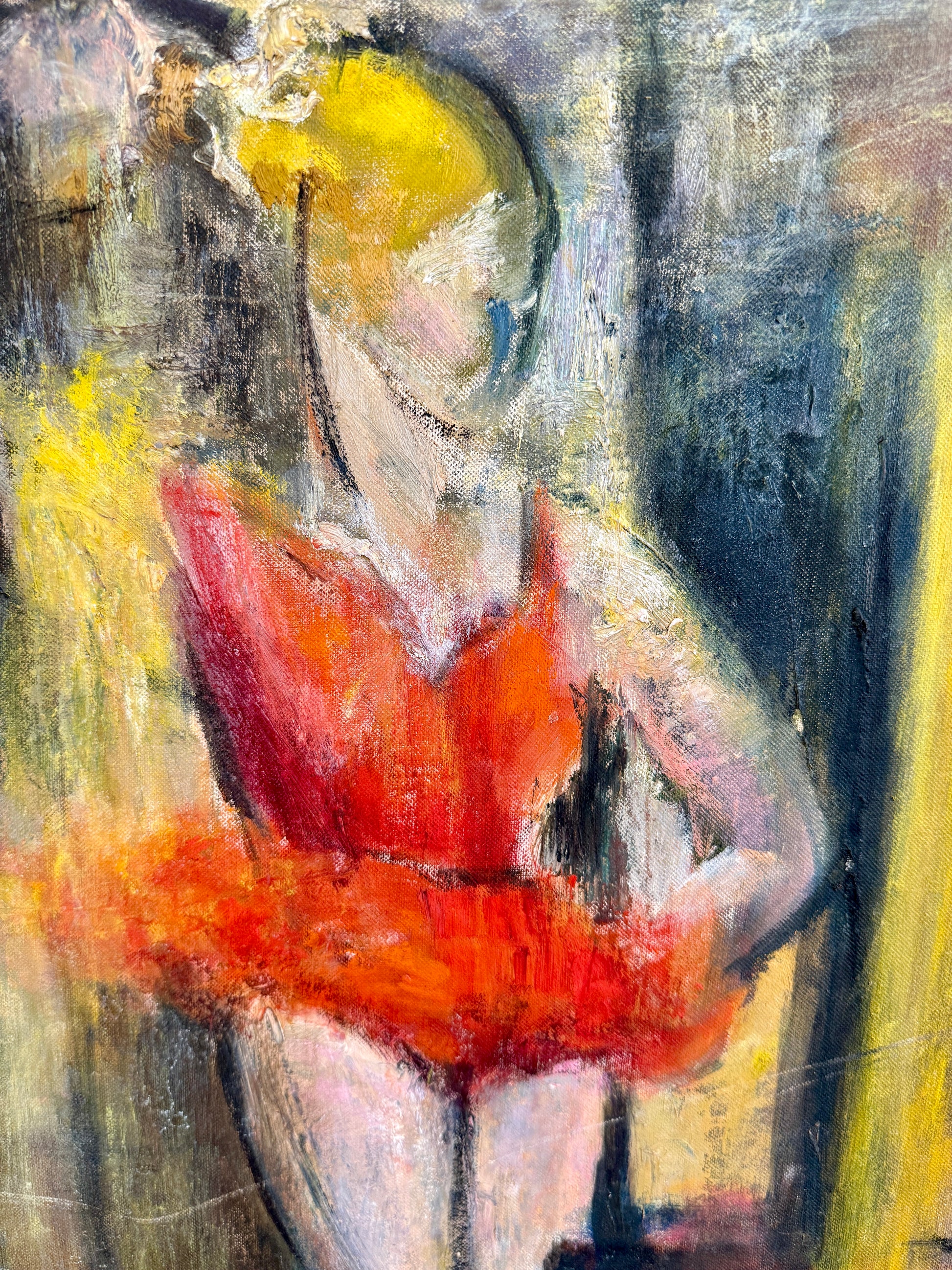 Mid century oil painting on board expressionist style portrait of a blonde ballet dancer in red. Artwork in gold solid wood frame measures 30.5" x 24.5". Artwork and frame in very good condition.