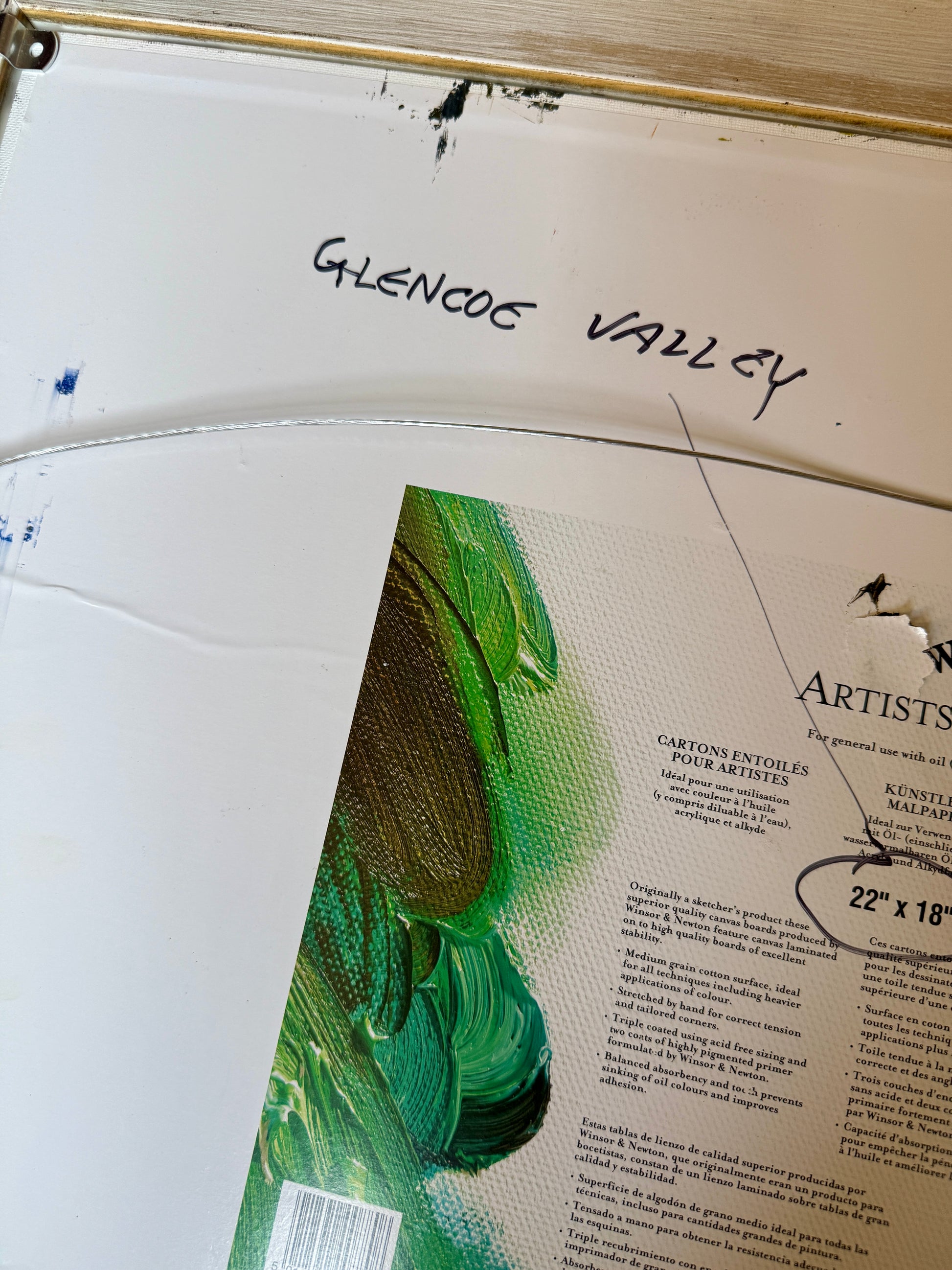 A dramatic and striking impasto oil painting on sunset over a river landscape, a small white house nestled in the center of it all. Note on back names the location as a Glencoe Valley in Scotland. Initialed at lower left. Artwork in custom gold frame measures 21.5" x 25.5". Artwork and frame in very good condition.