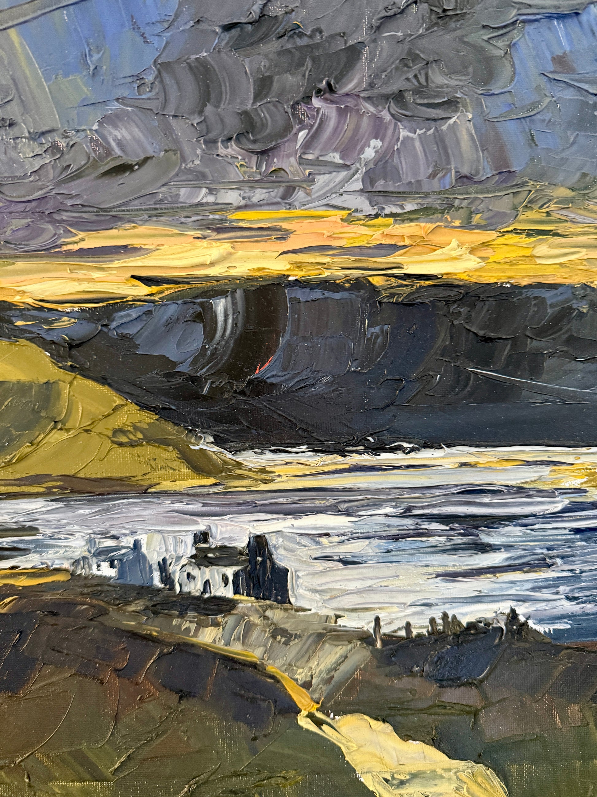 Moody Scottish Loch Mountain Landscape at Sunset Impasto Oil Painting in Gold Frame