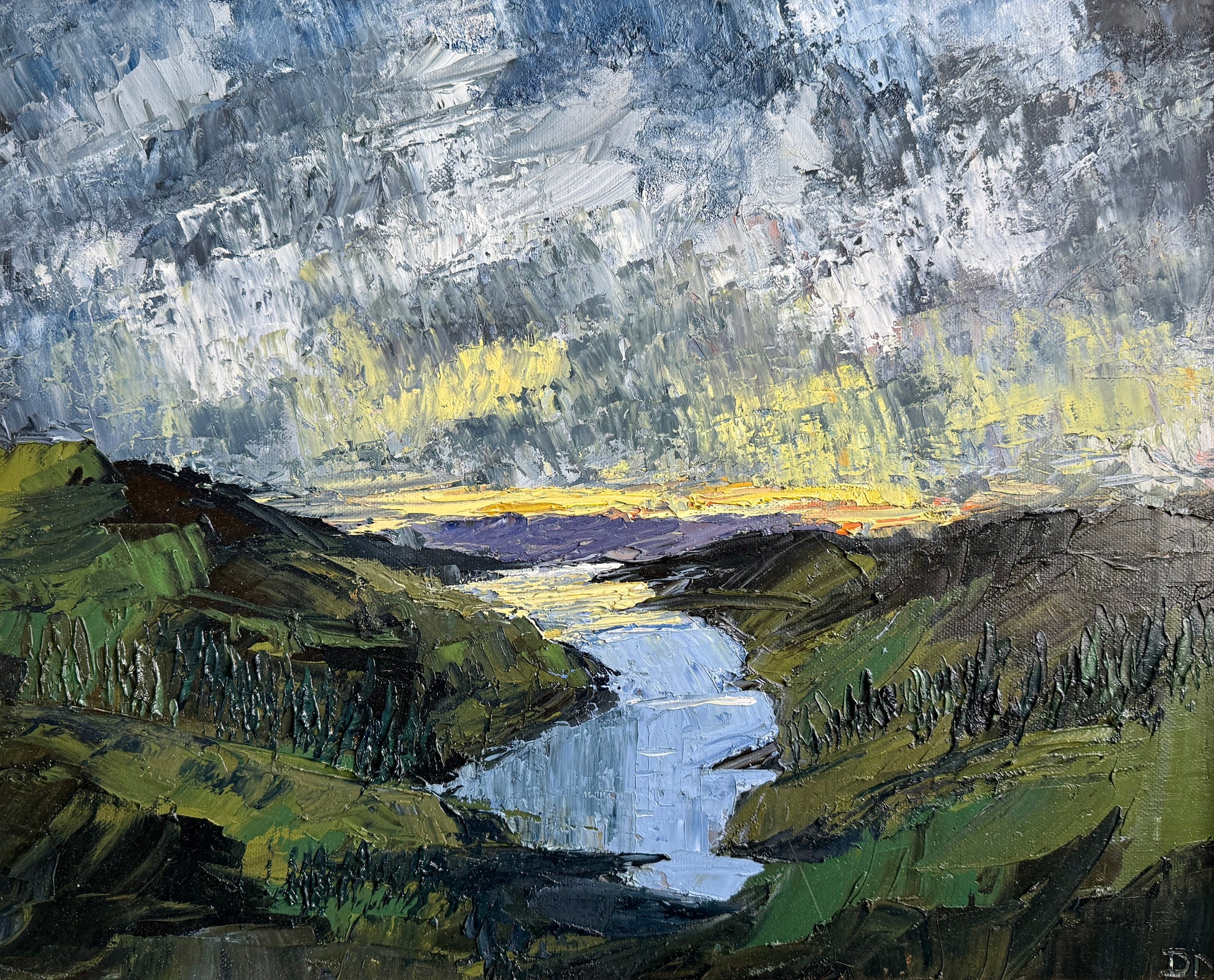 A dramatic and striking contemporary impasto oil painting on canvas of a sunset over a rolling green river-centered landscape. Initialed at lower right. Artwork in solid wood gold frame measures 22.25" x 26". Artwork and frame in very good condition.