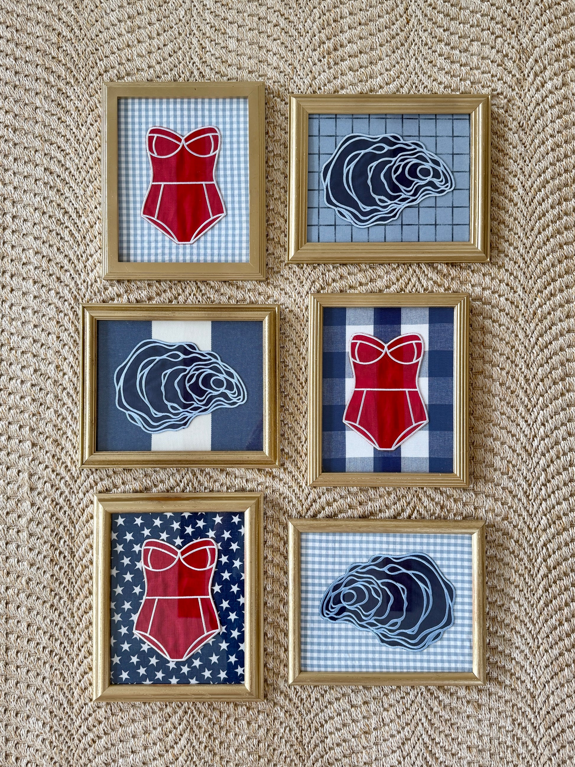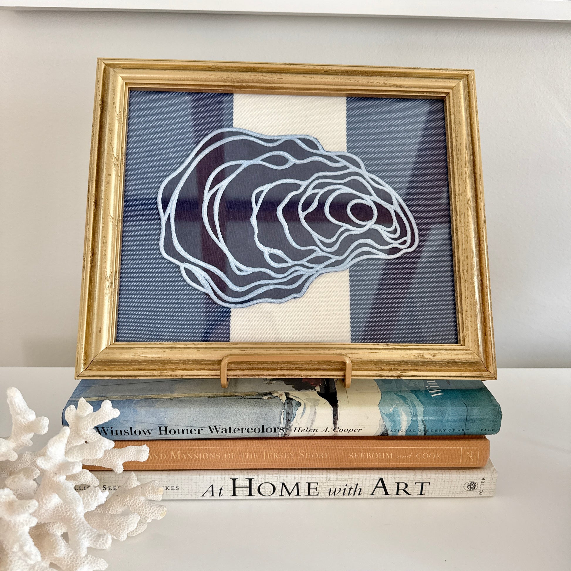 A navy blue and light blue stitched linen oyster mounted on navy and white awning stripe cotton canvas fabric. Vintage, gold finish wood frame measures approximately 9.5" x 11.5". Frame in very good condition with light wear. Coordinating pieces shown available in separate listings.