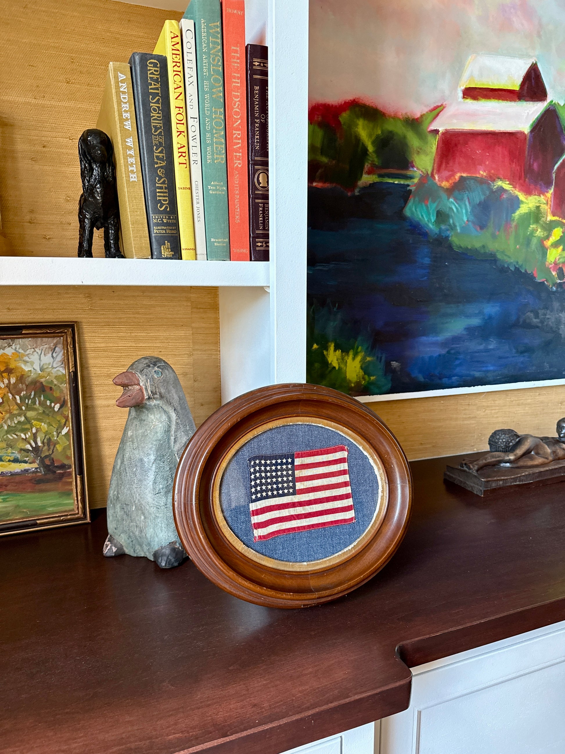 Old 48 Star American Parade Flag on Blue Oxford Fabric in 19th Century Oval Frame